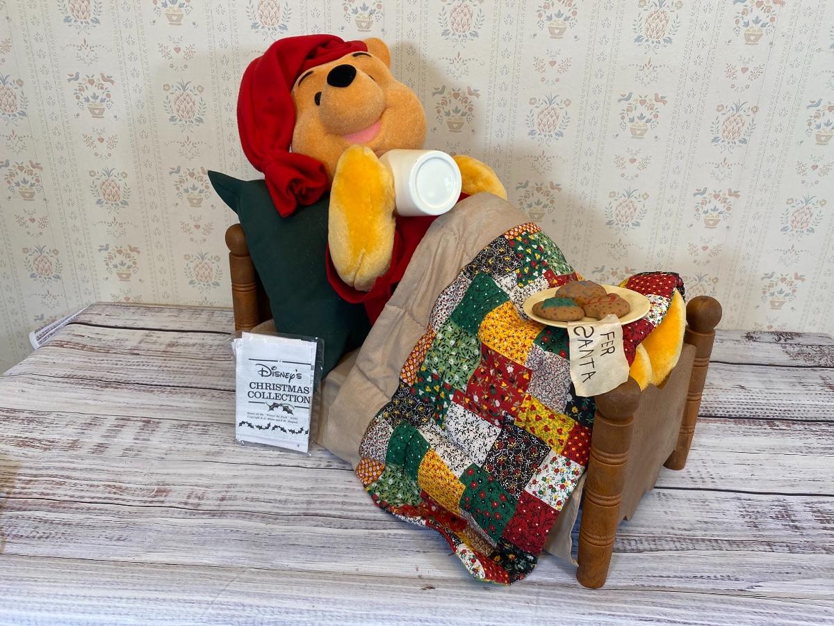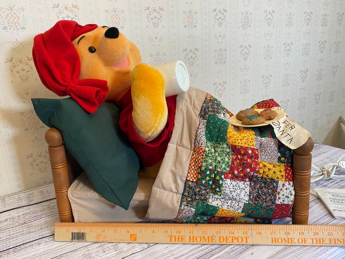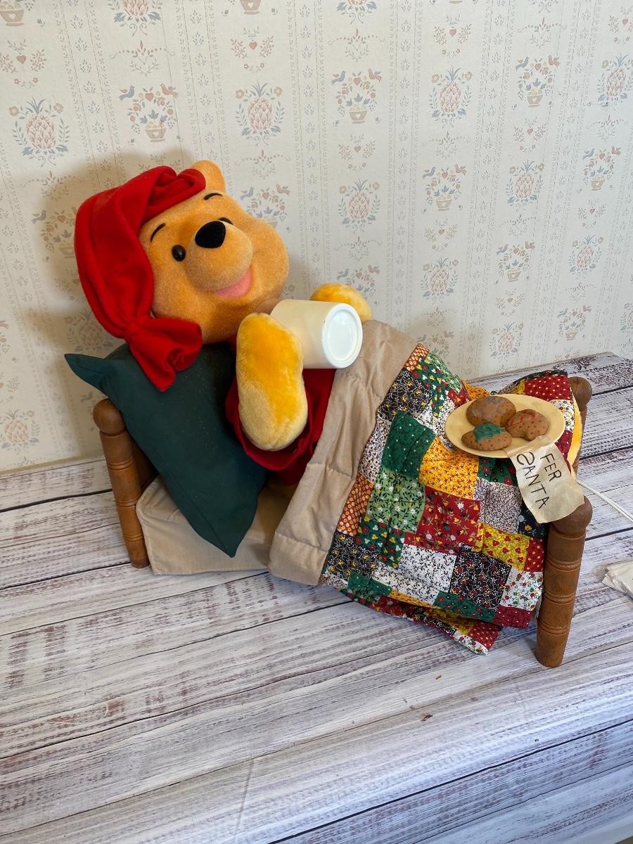 Vintage Winnie the Pooh electric Christmas decor. Animatronic Pooh is in bed waiting for Santa, his arm and head moves, plays music. Tested and works. Large size. about 20" length. Has box. #030-2016