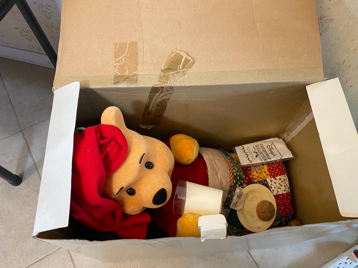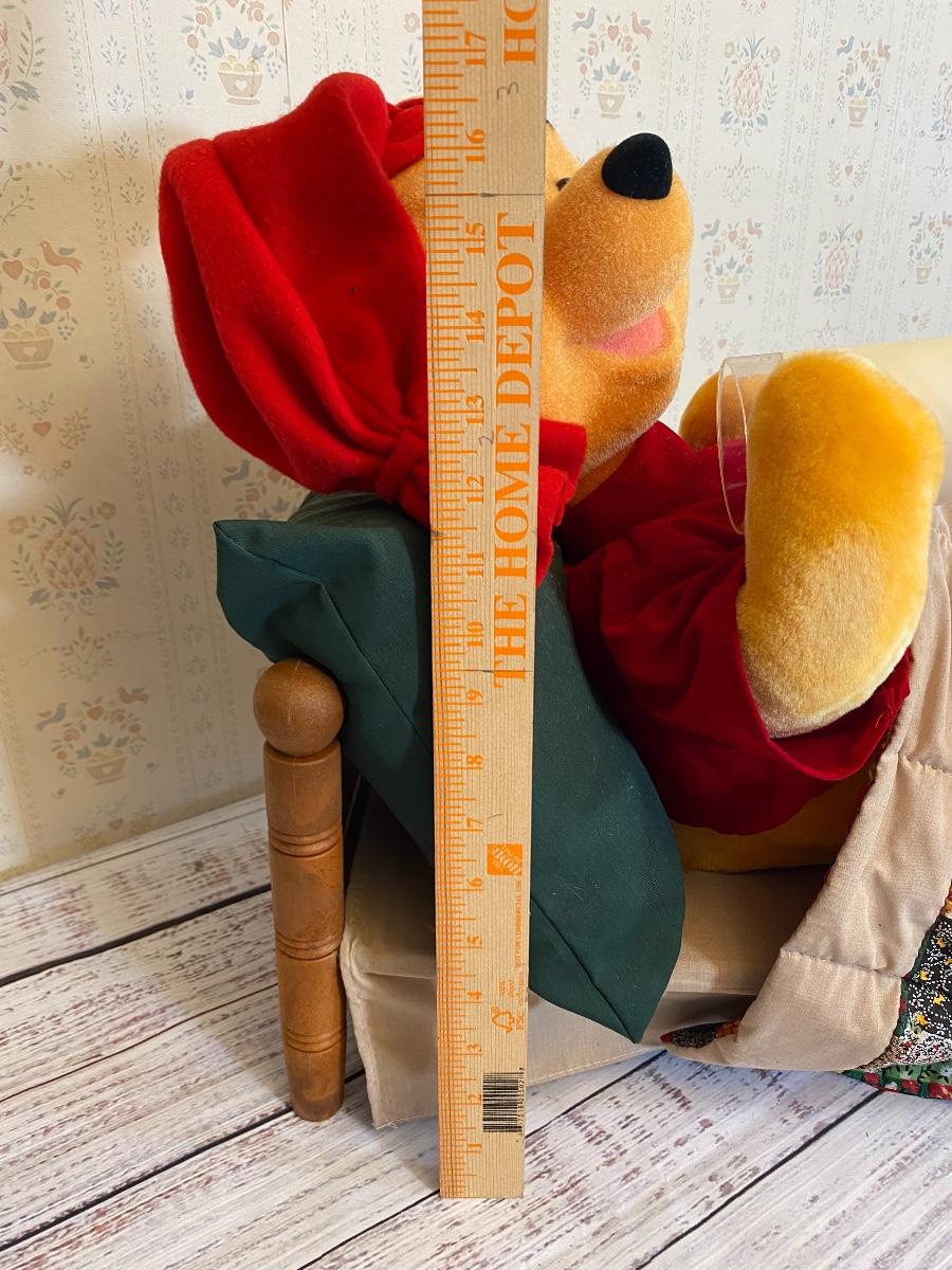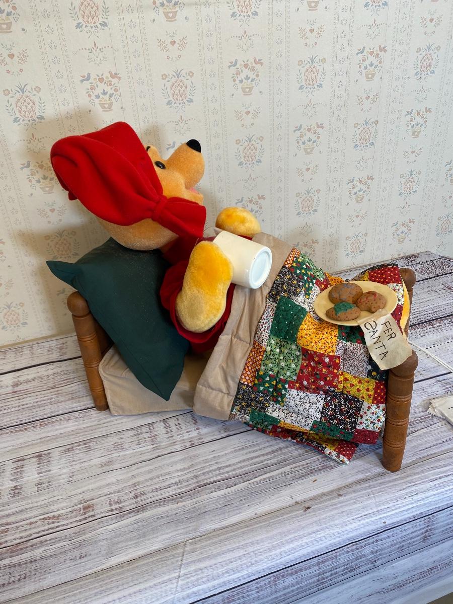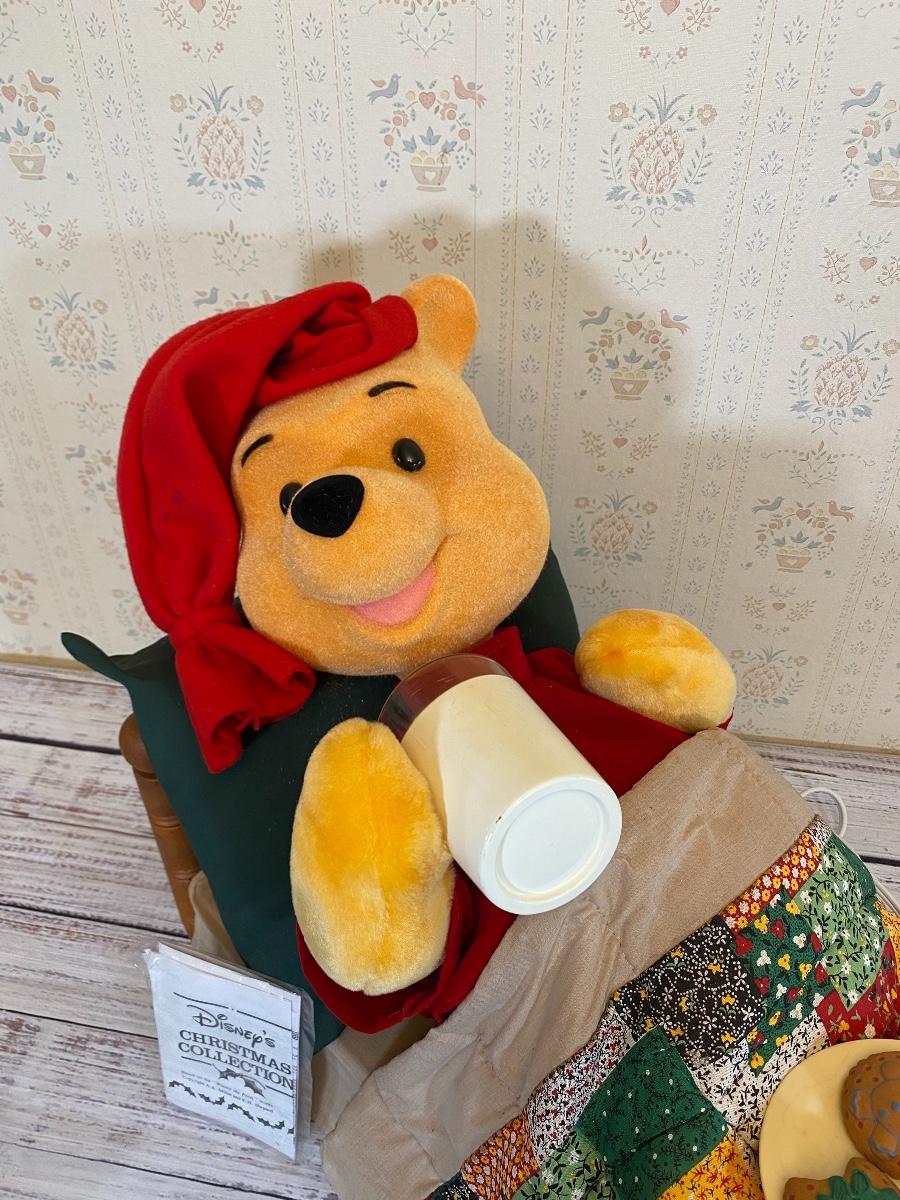 Vintage Winnie the Pooh electric Christmas decor. Animatronic Pooh is in bed waiting for Santa, his arm and head moves, plays music. Tested and works. Large size. about 20" length. Has box. #030-2016
