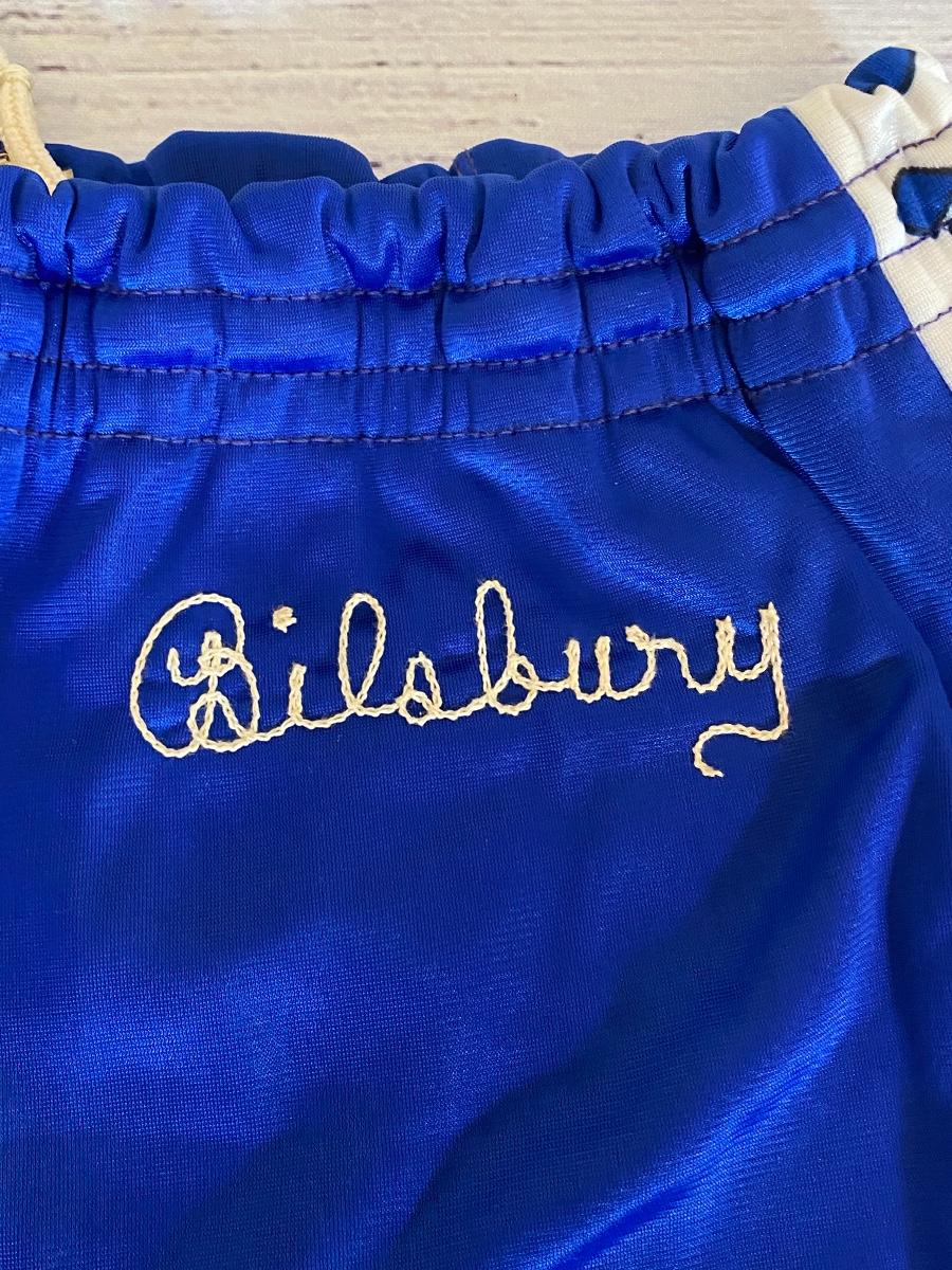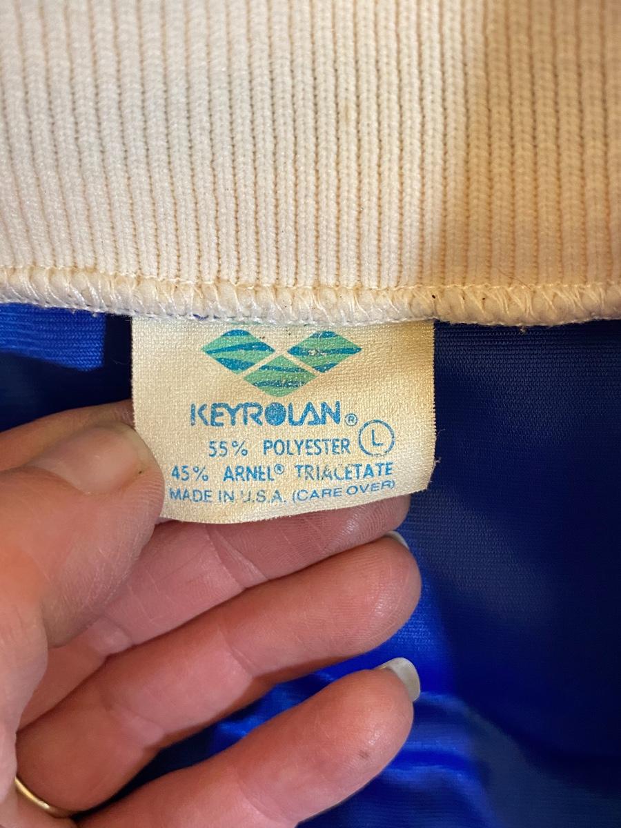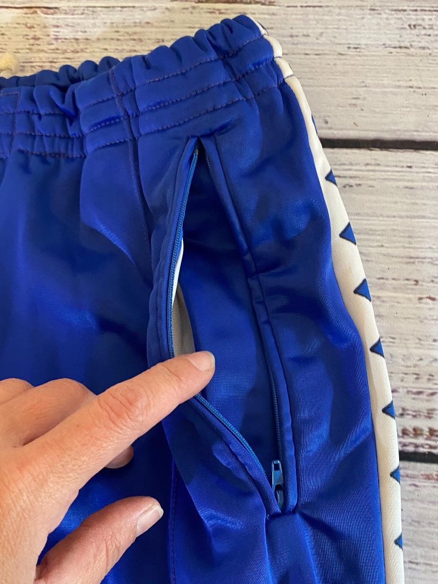 Retro nylon blend tracksuit in fair condition. Zipper moves but could not get jacket to zip together. A little discoloring on tags and elastic is a little crunchy. #030-0014
