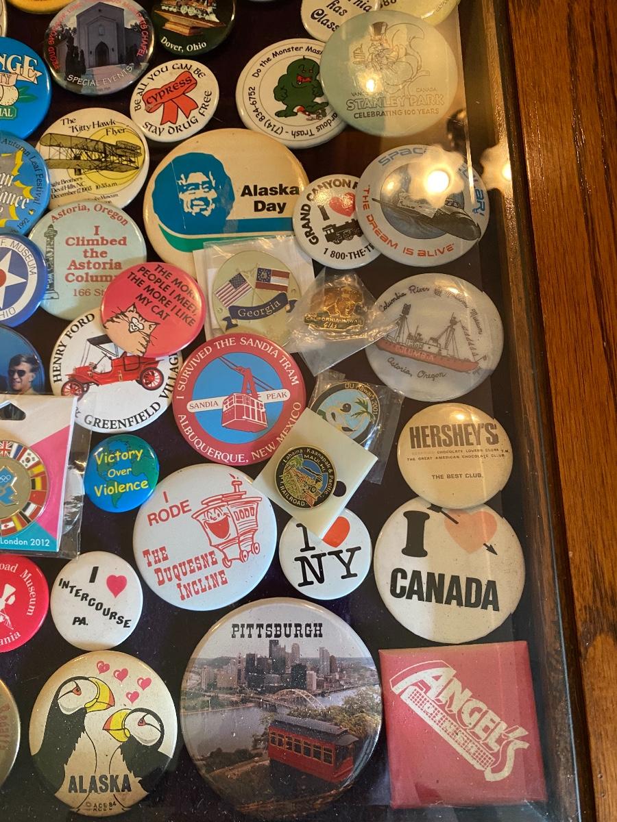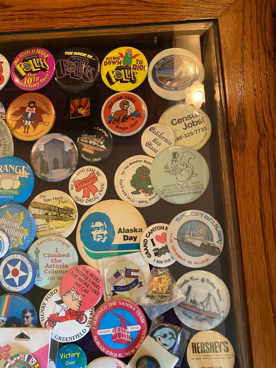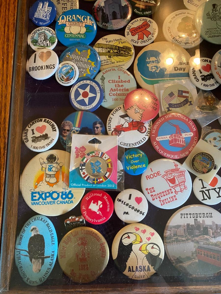 Vintage Display Coffee Table Filled with Vintage Buttons & Pins Political Disney OC Fair Misc