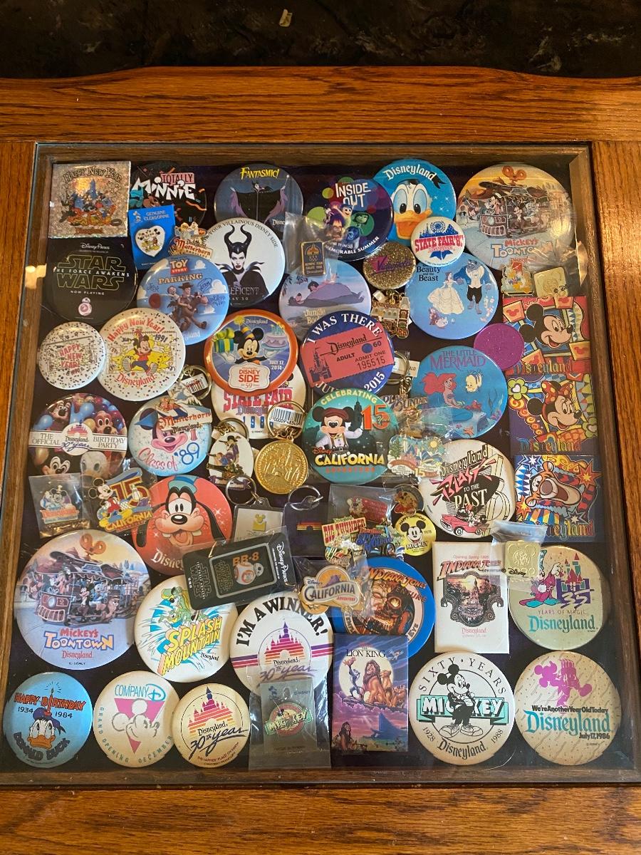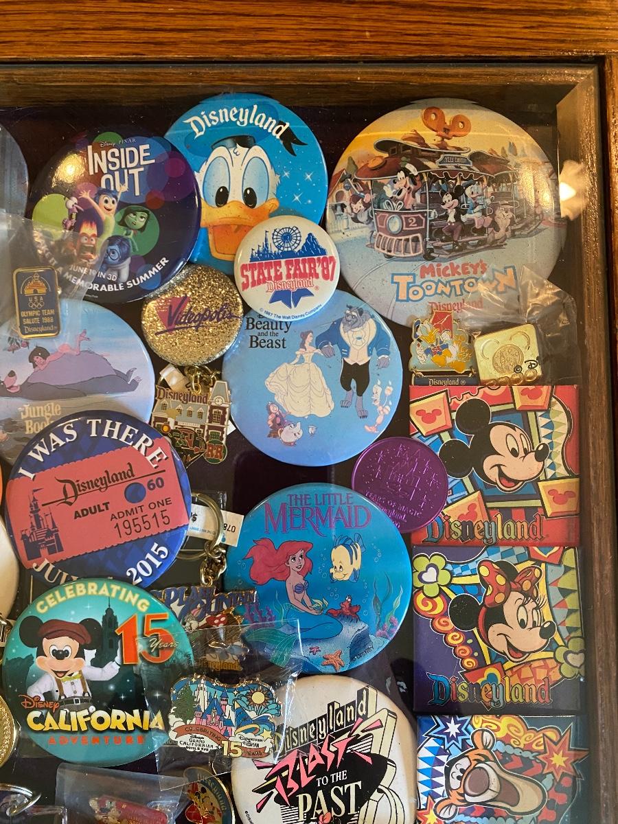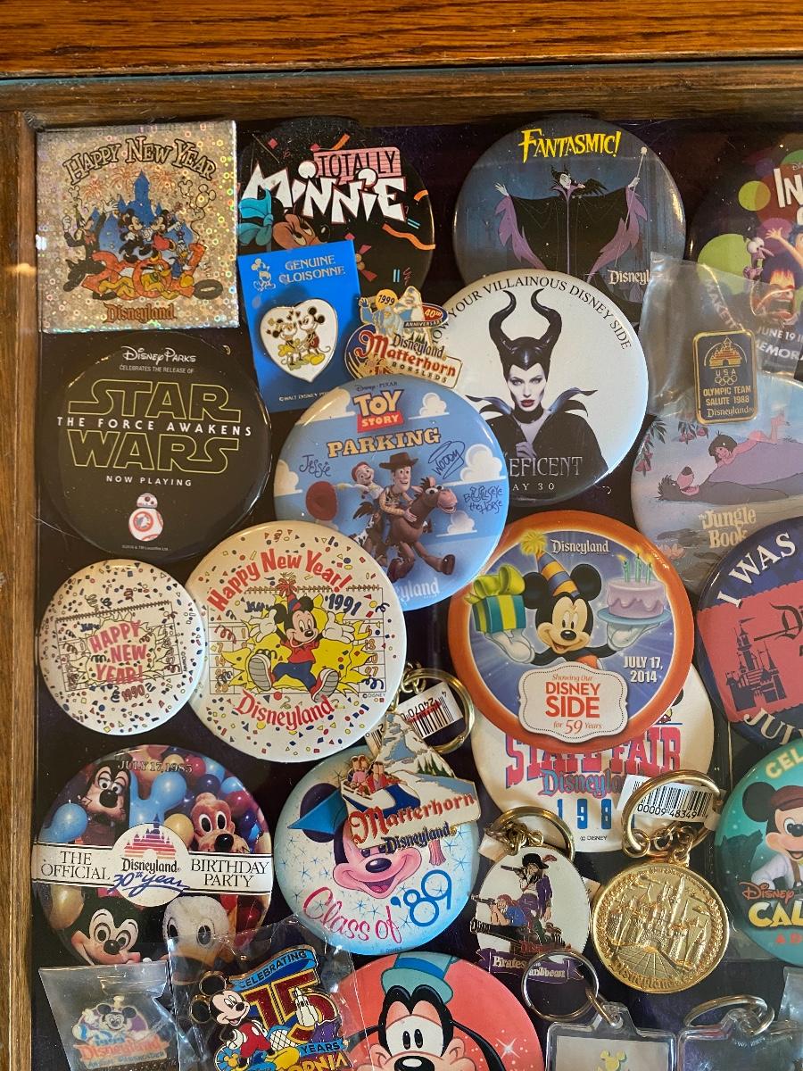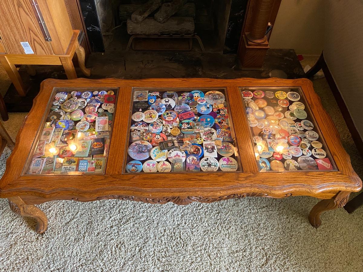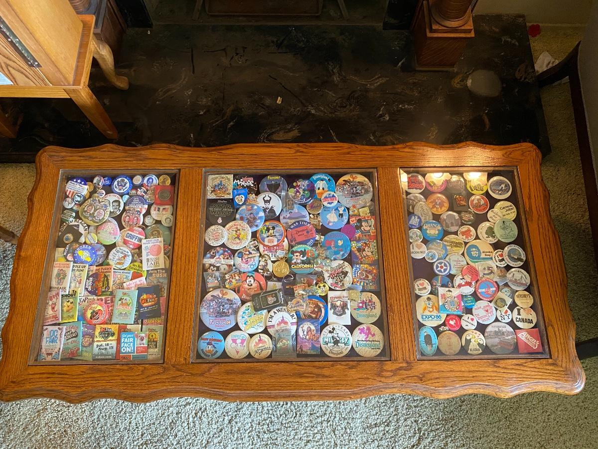 Vintage oak glass top display table filled with buttons and pins. Three separate sections completely filled. Vintage political pins and OC fair pins on one side, Miscellaneous pins and buttons on the other. The center display area is filled with Disney and Disneyland enamel pins and buttons. Must be over 100 pins maybe 150+. Average size coffee table. Pins are loose inside and will shift if tilted.