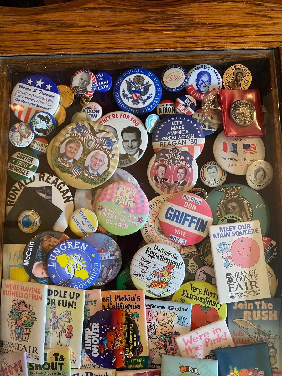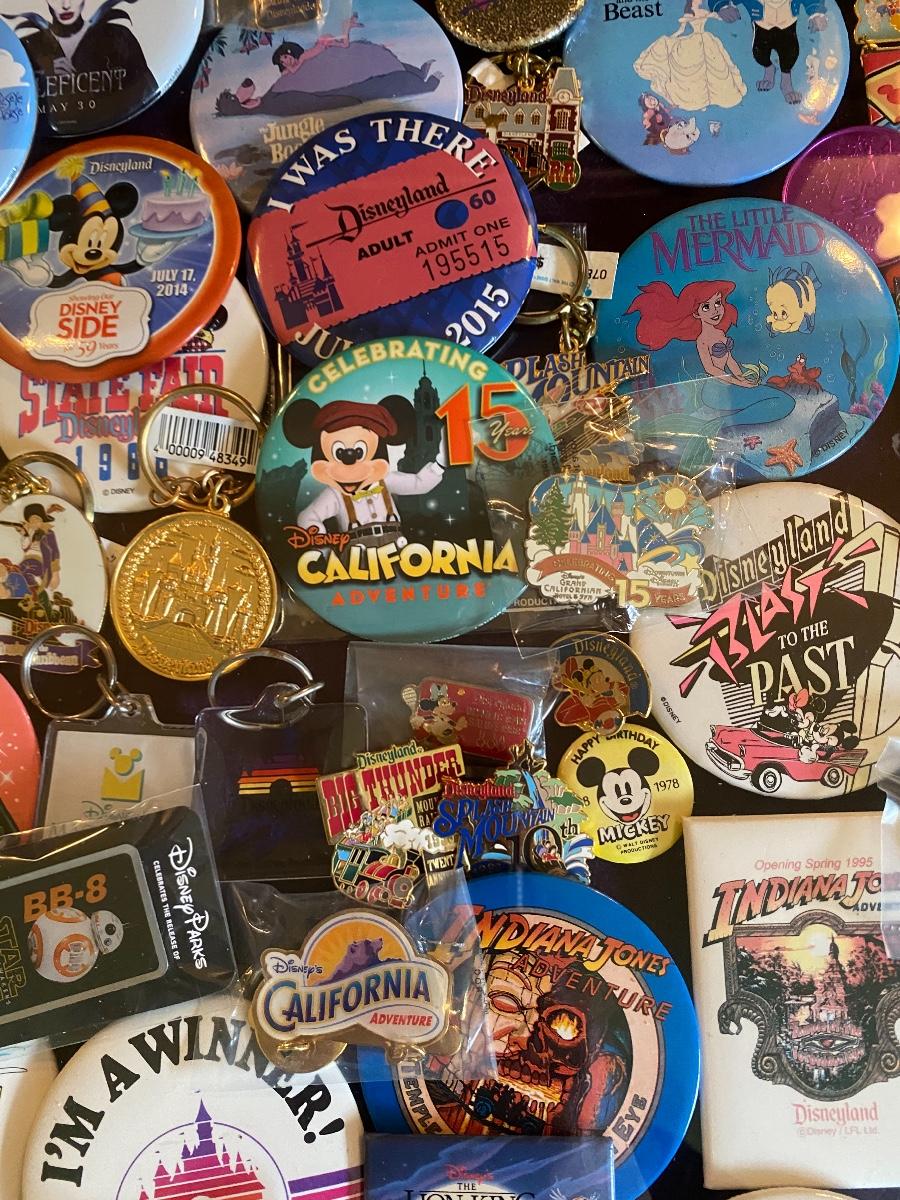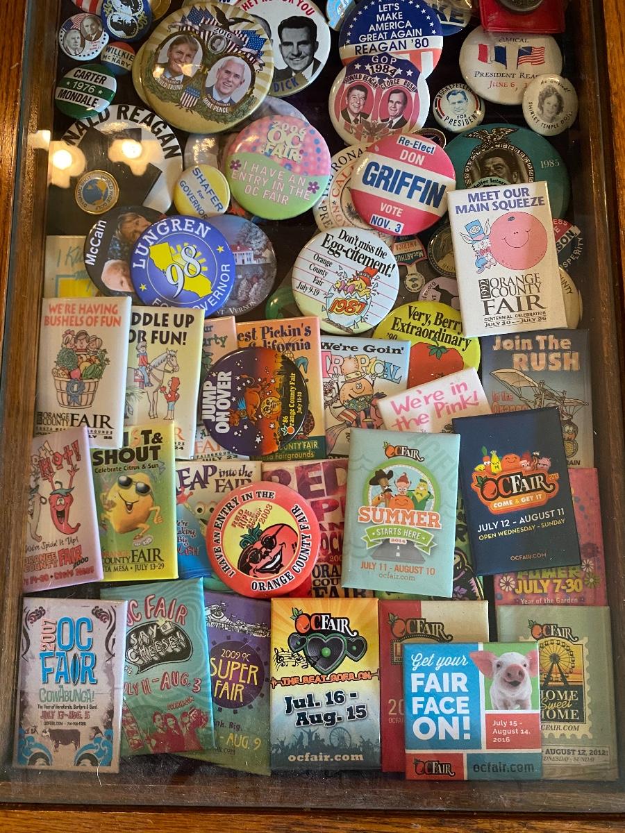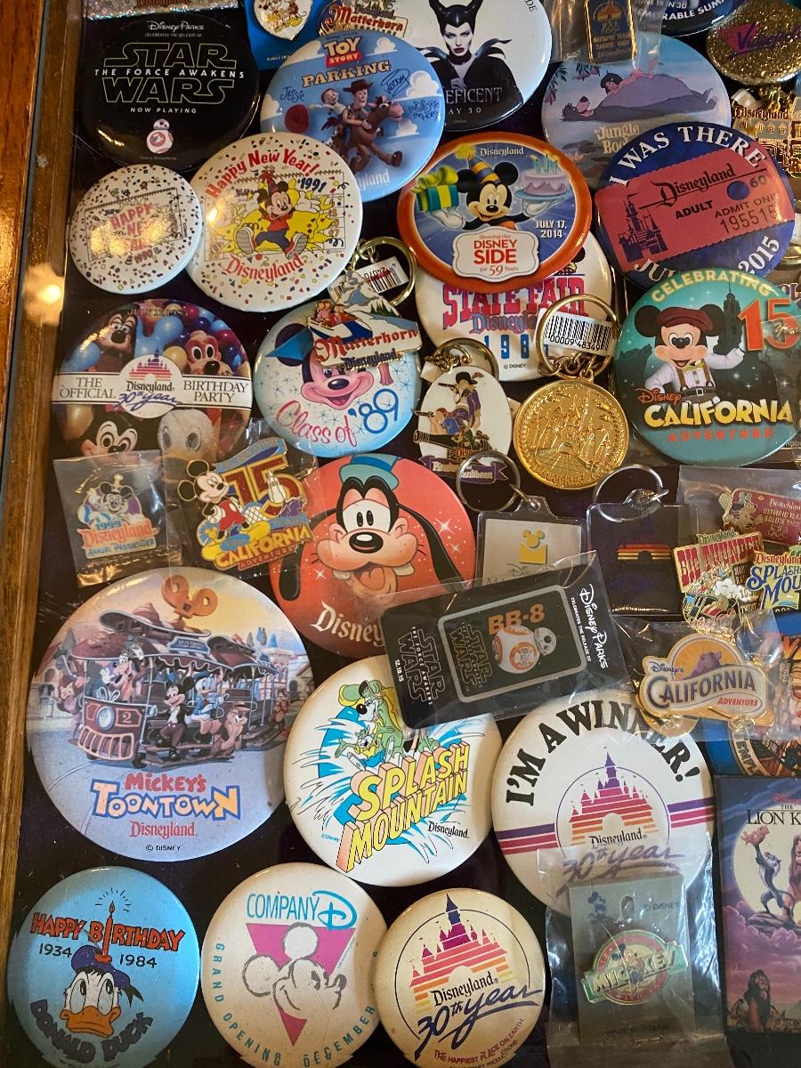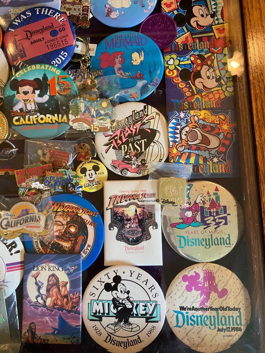 Vintage oak glass top display table filled with buttons and pins. Three separate sections completely filled. Vintage political pins and OC fair pins on one side, Miscellaneous pins and buttons on the other. The center display area is filled with Disney and Disneyland enamel pins and buttons. Must be over 100 pins maybe 150+. Average size coffee table. Pins are loose inside and will shift if tilted.
