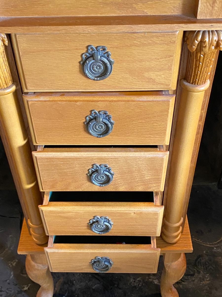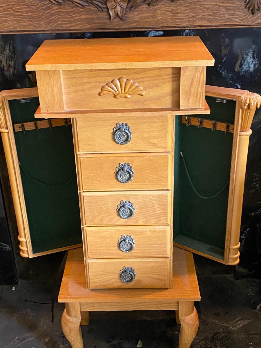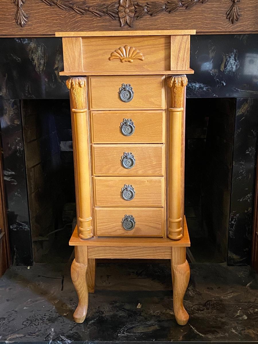 Country Blonde Oak Jewelry Armoire, Cabriolet Legs, Drawers, Side Panels swing out