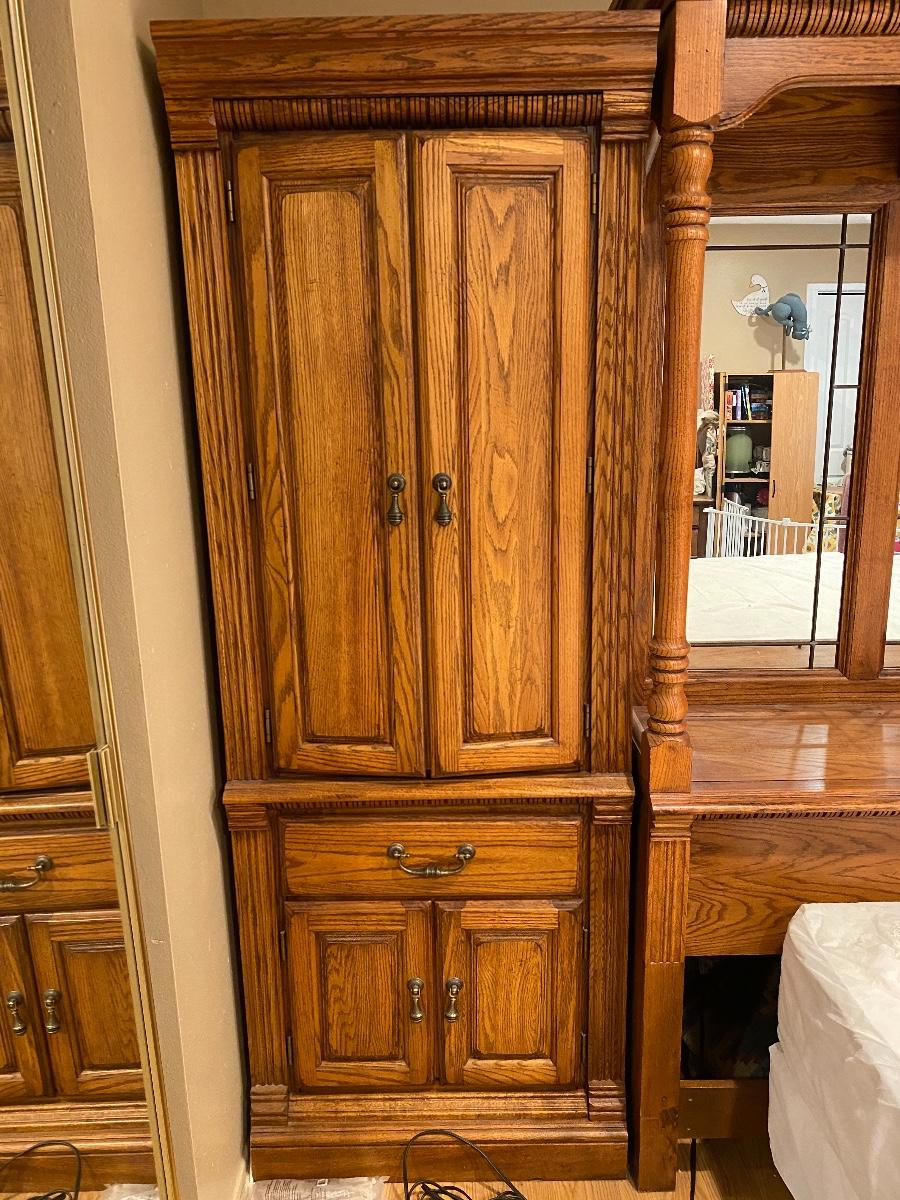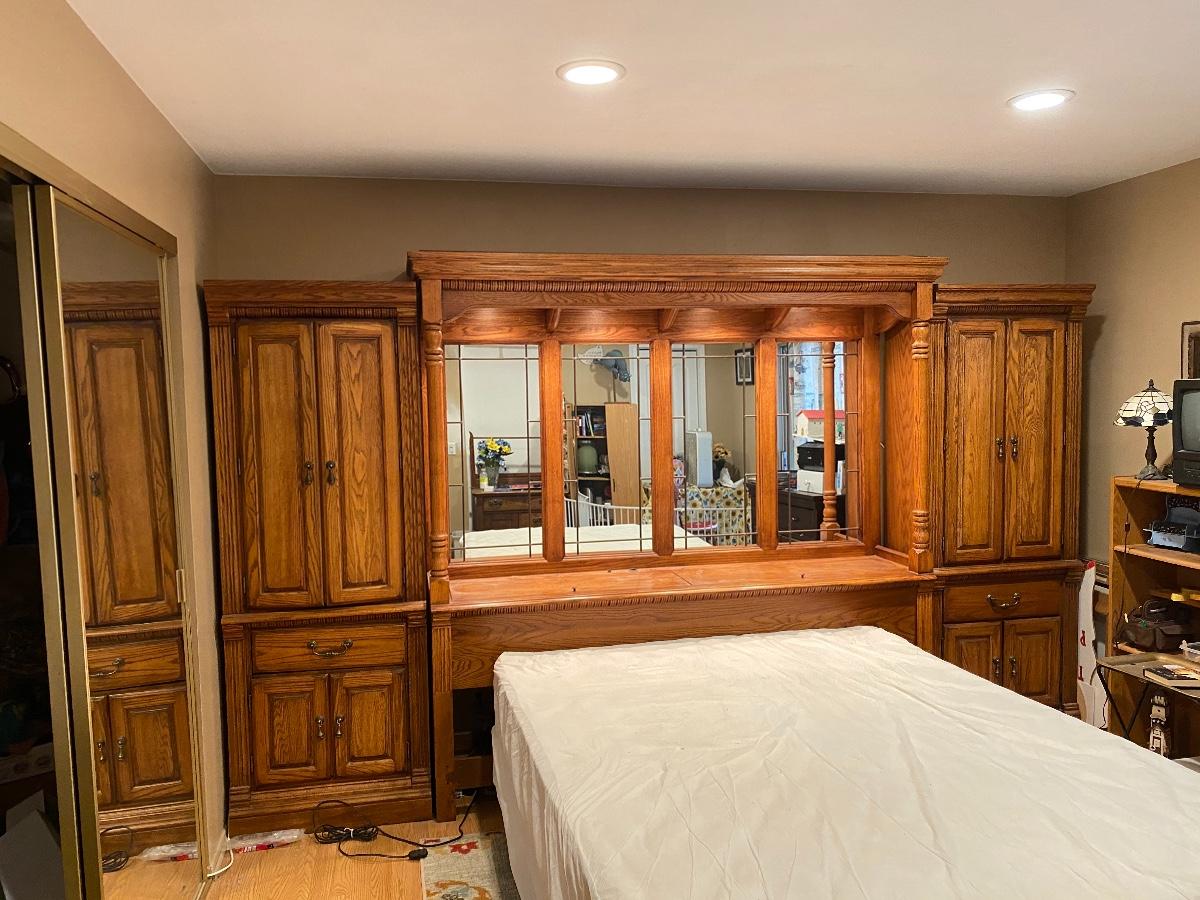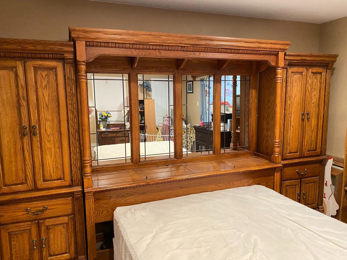 Full Double size Bedroom Set, Oak wall unit, lighted, cupboards and drawers