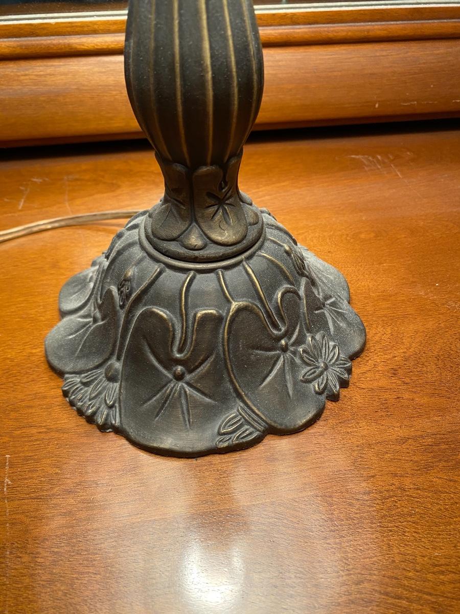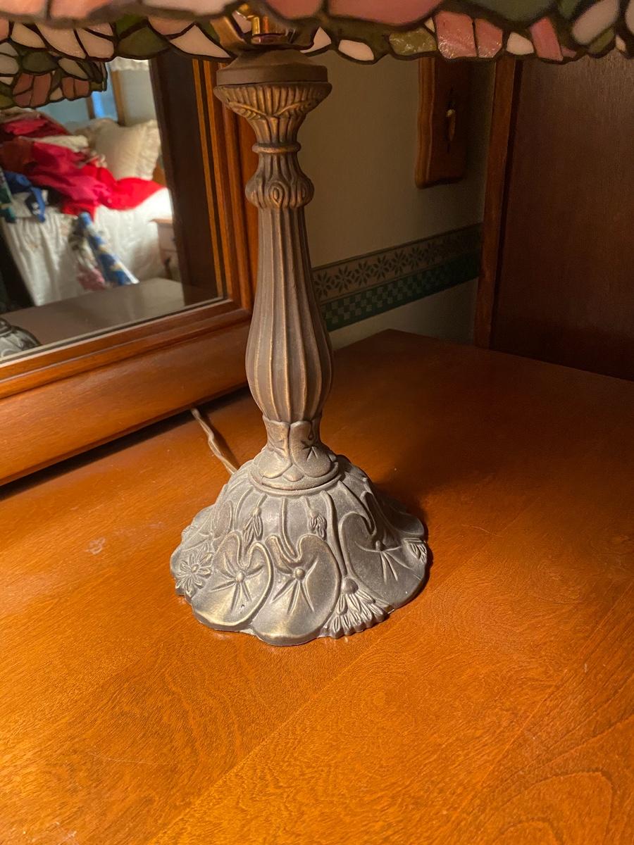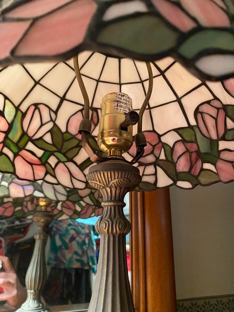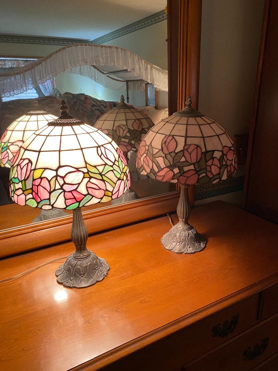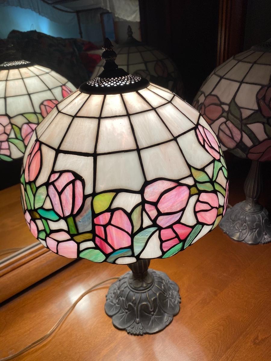 Pair of Small Stained Glass Dresser or Fireplace Lamps, pink flowers, window pane design