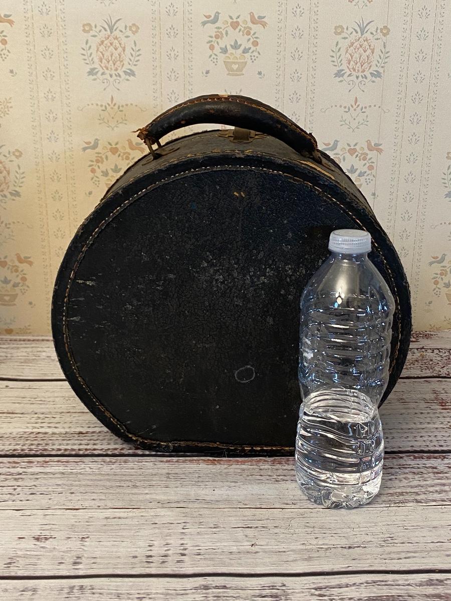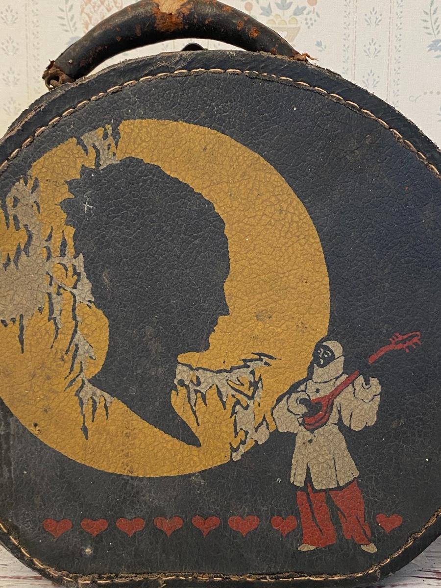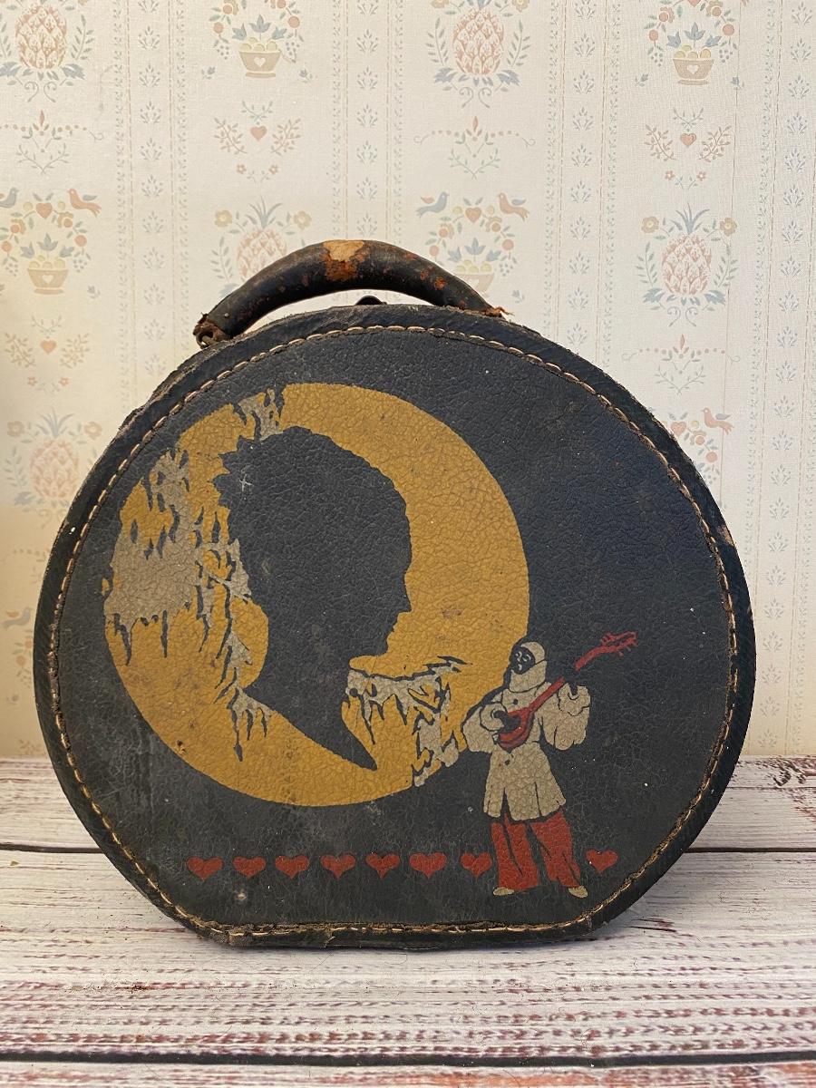 Vintage black hat box train case. Has a silhouette of a woman that is being serenaded and red hearts. Displays great. It does have signs of age and wear Water bottle for size reference.
