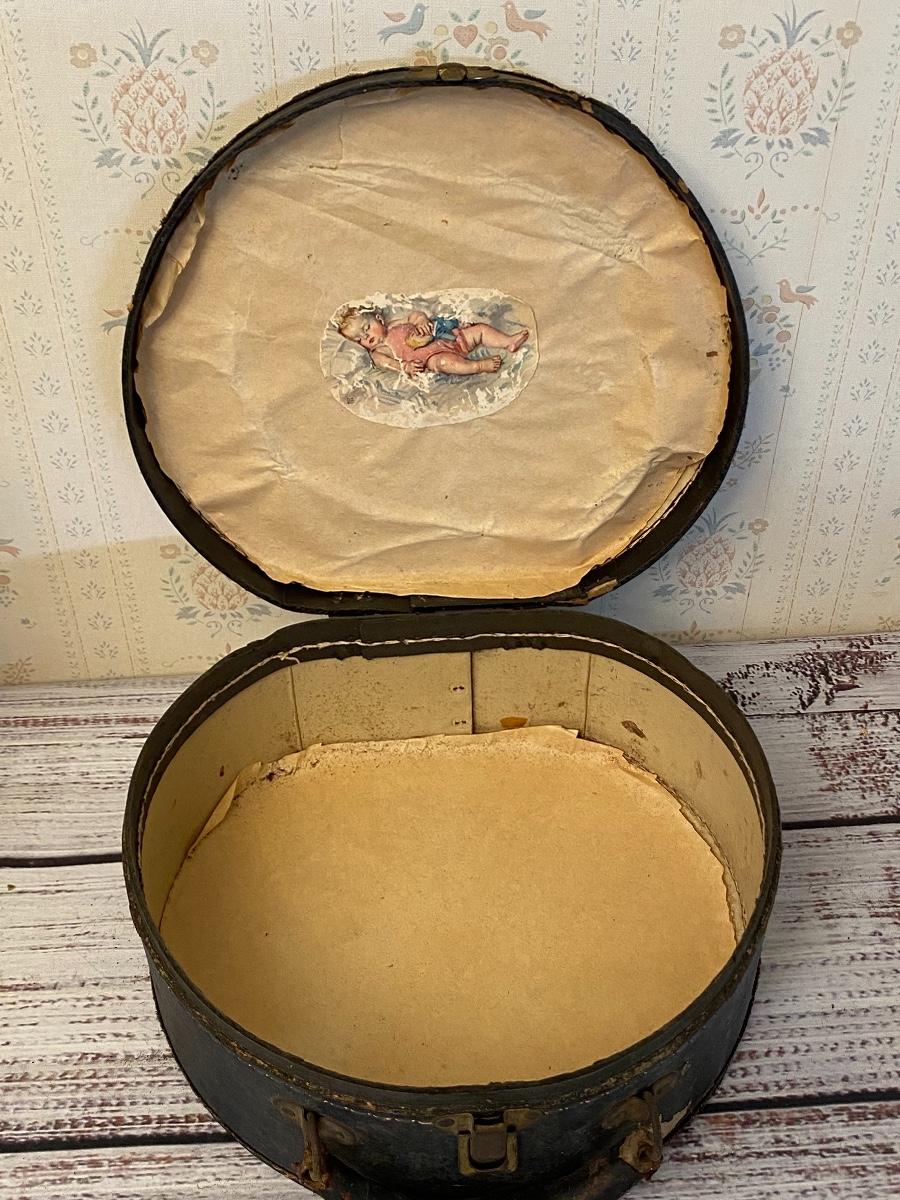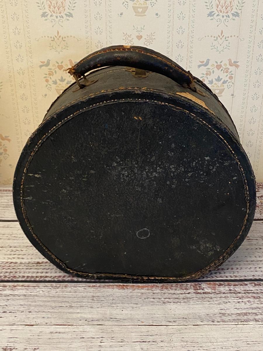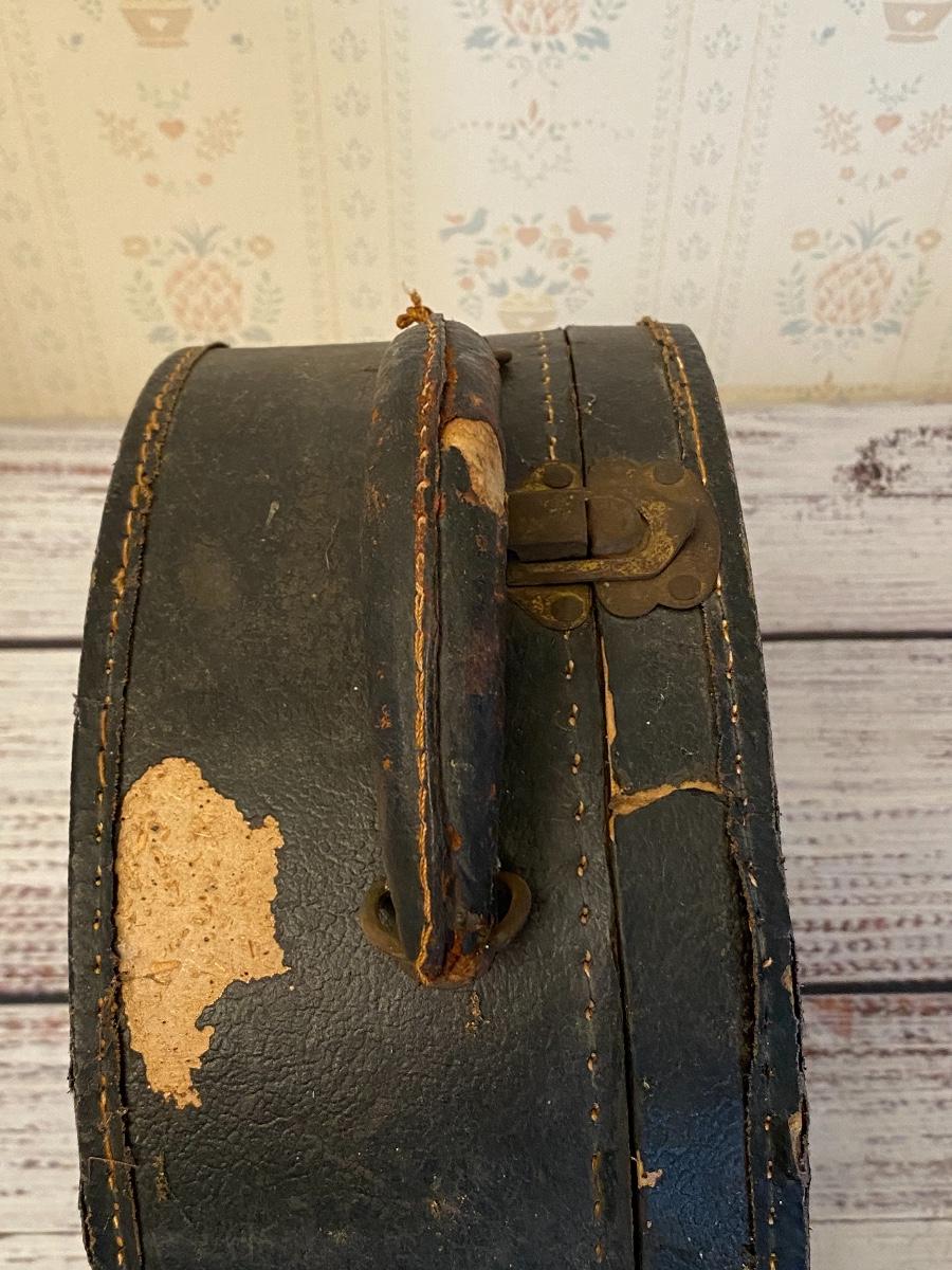 Vintage black hat box train case. Has a silhouette of a woman that is being serenaded and red hearts. Displays great. It does have signs of age and wear Water bottle for size reference.
