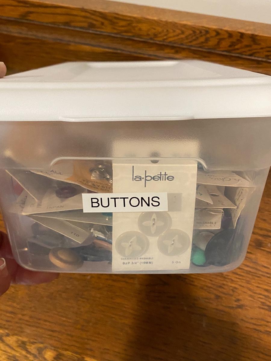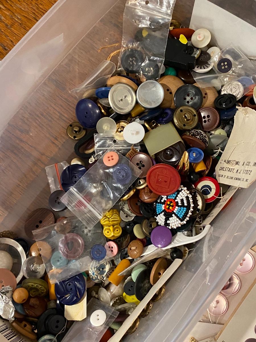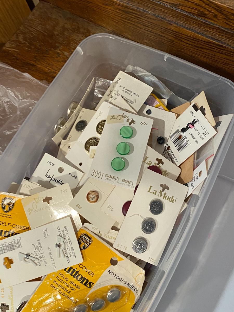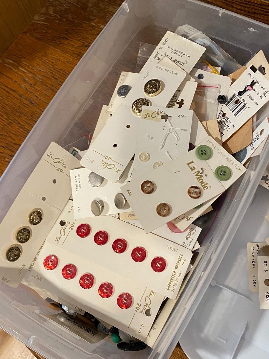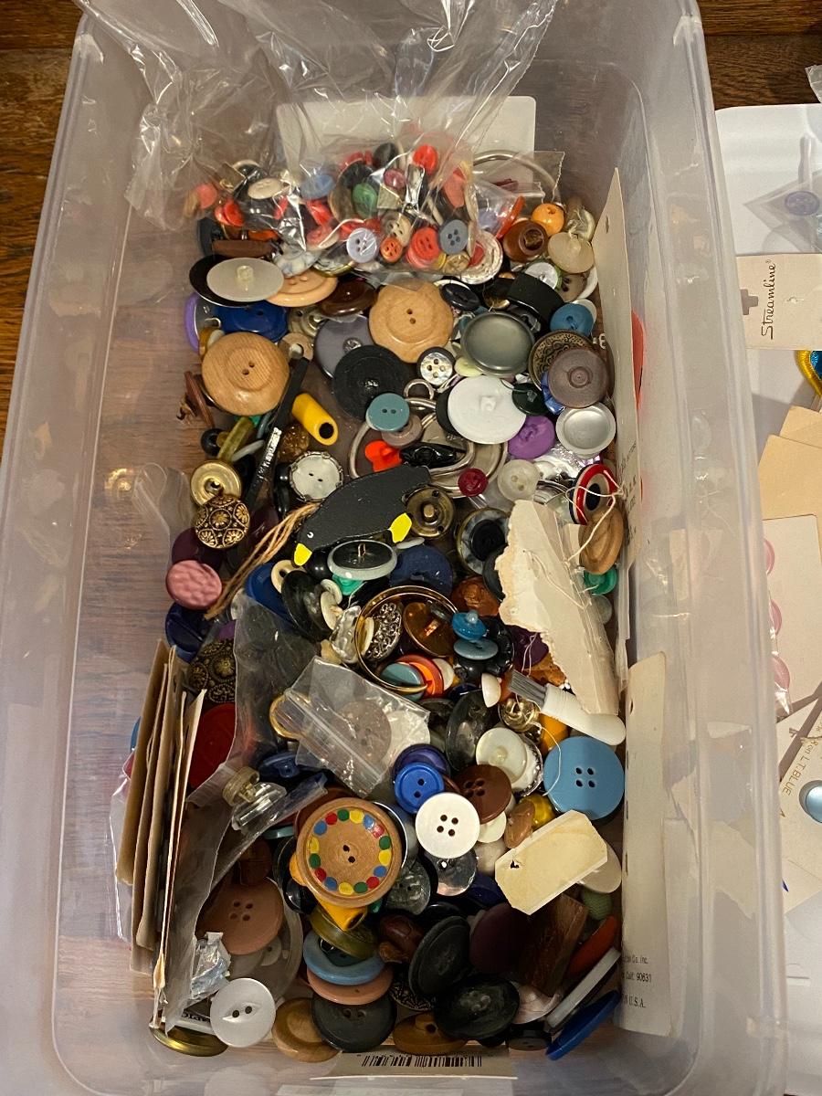 Plastic shoebox size lidded box filled with a variety of buttons. All kinds of styles and colors. Some are still on cards.
