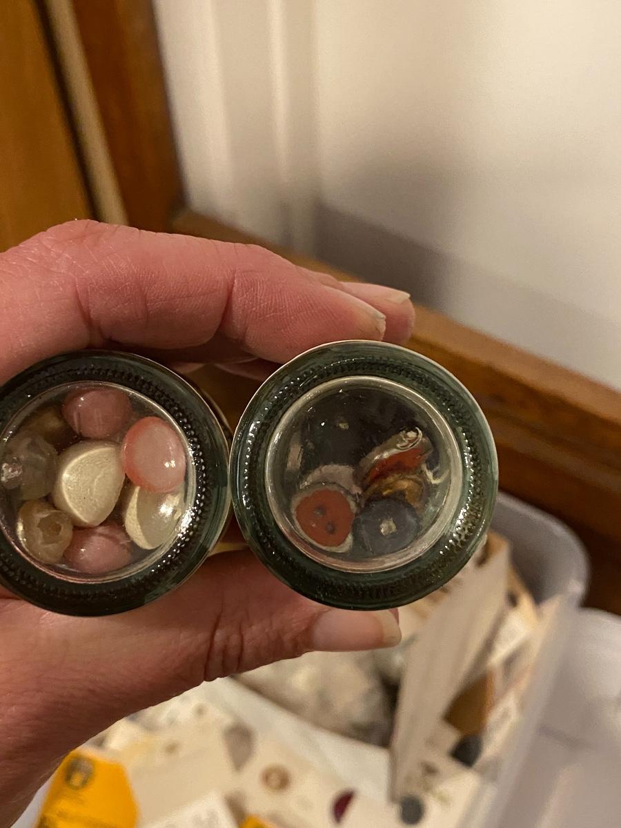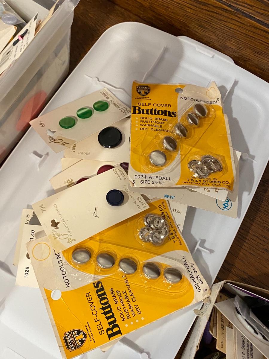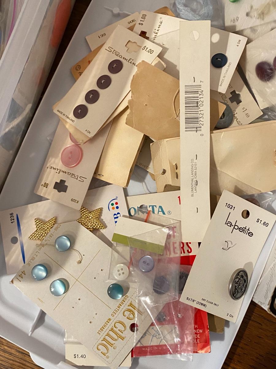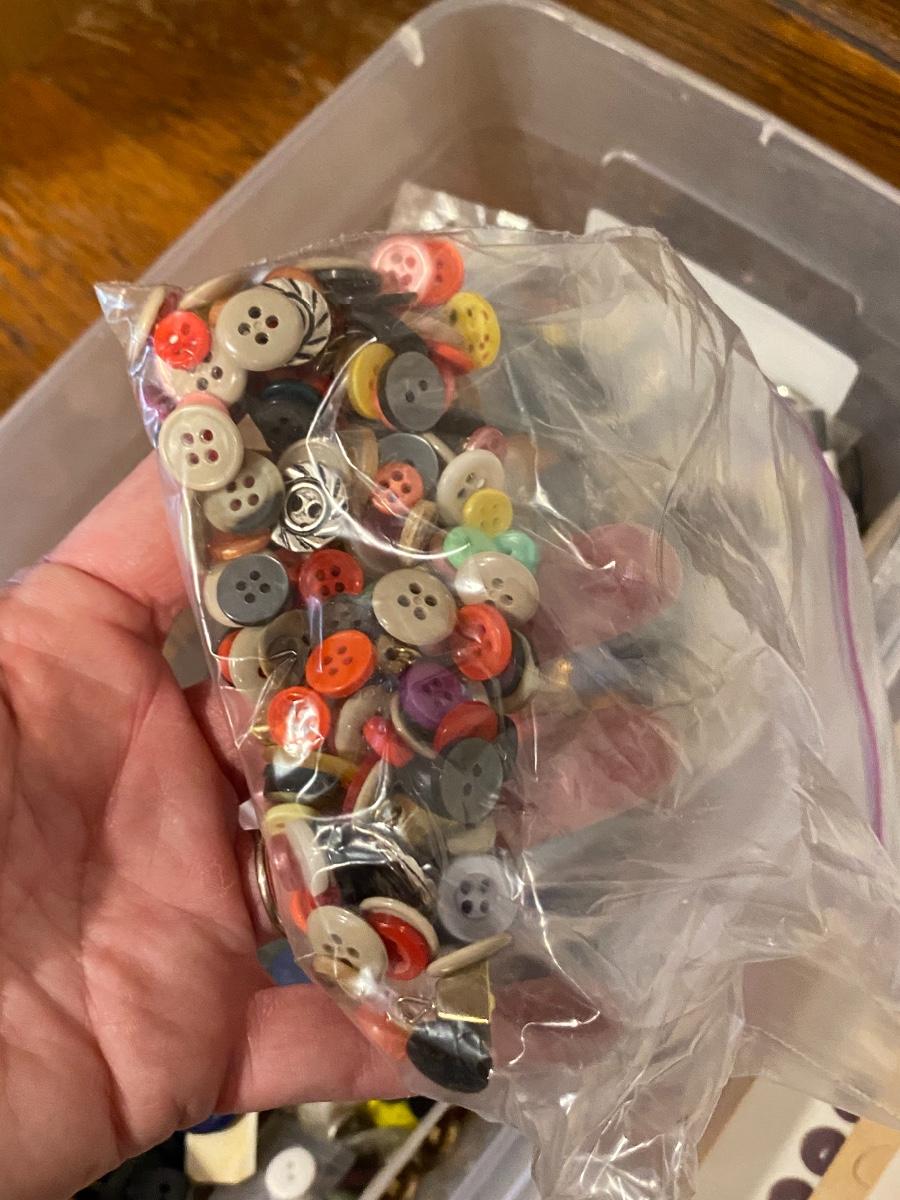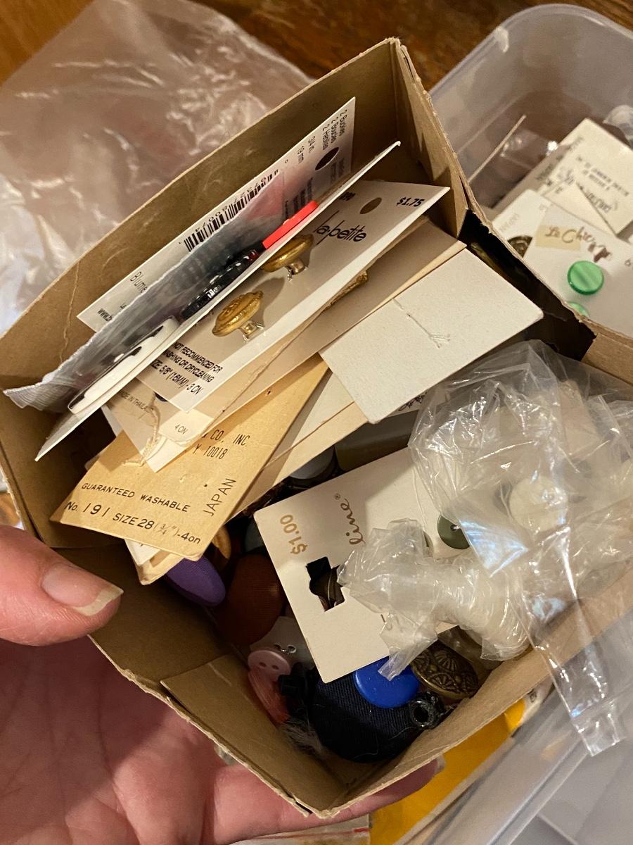 Plastic shoebox size lidded box filled with a variety of buttons. All kinds of styles and colors. Some are still on cards.