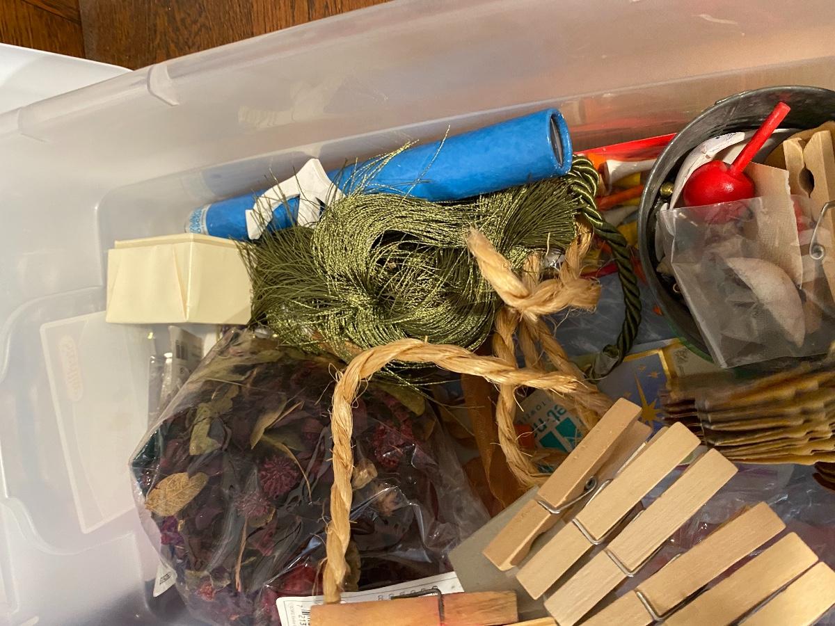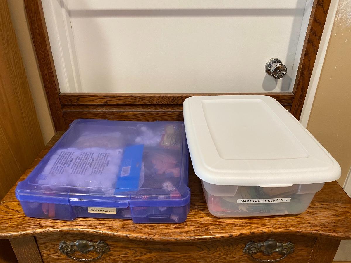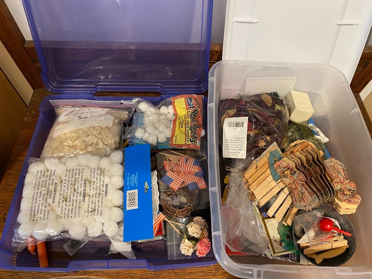 Two plastic bins filled with miscellaneous craft supplies. Bins included.