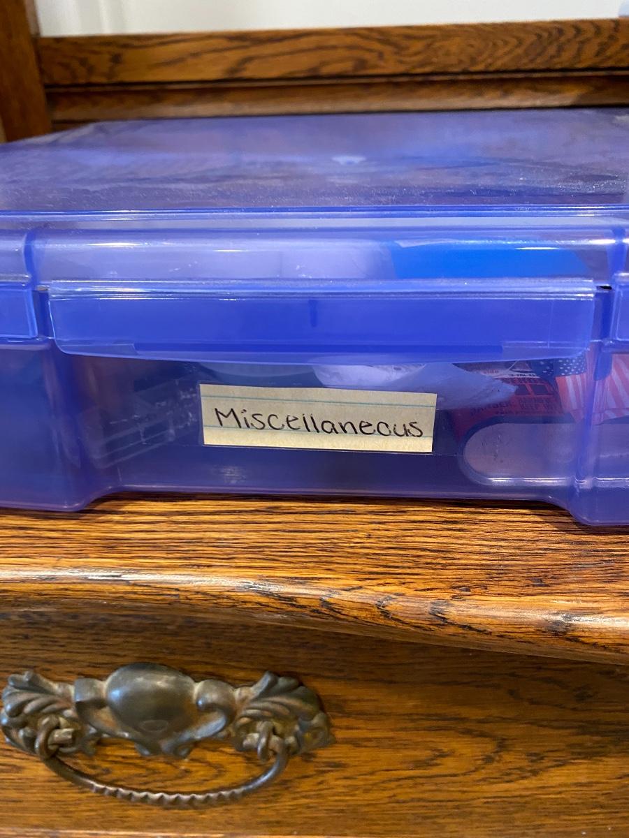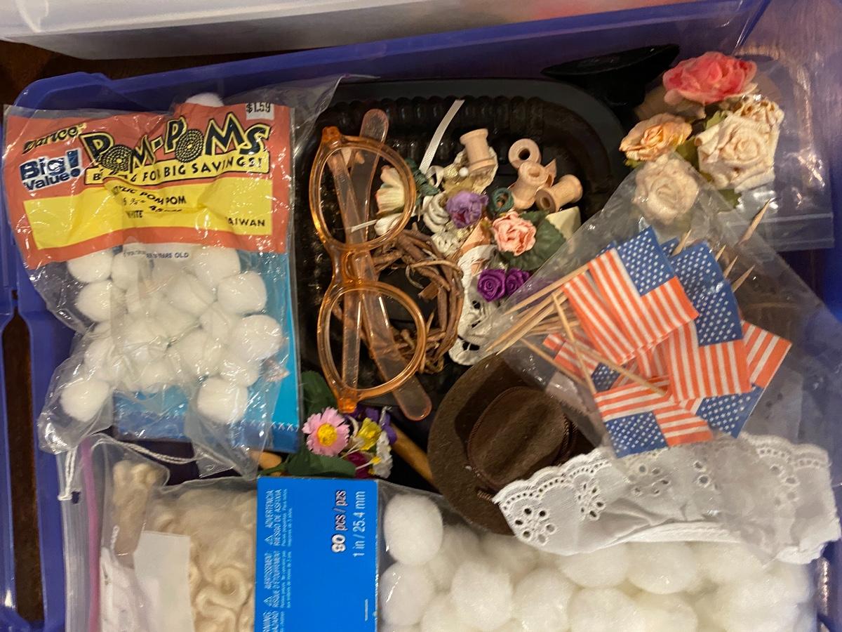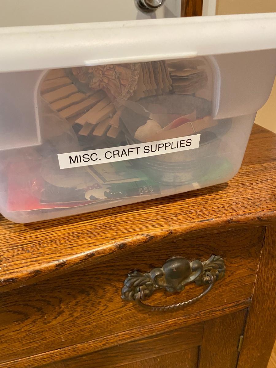 Two plastic bins filled with miscellaneous craft supplies. Bins included.