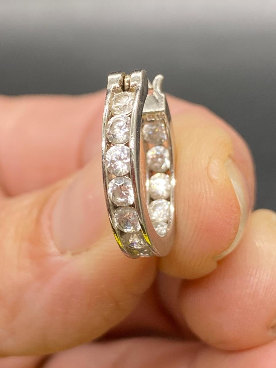 3/4" sterling silver and CZ hoop earrings. No maker mark. Good condition.
