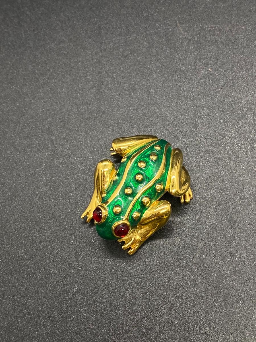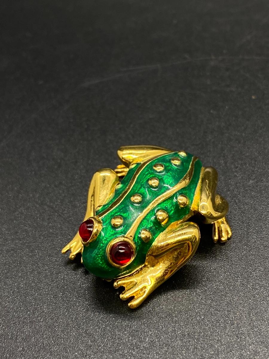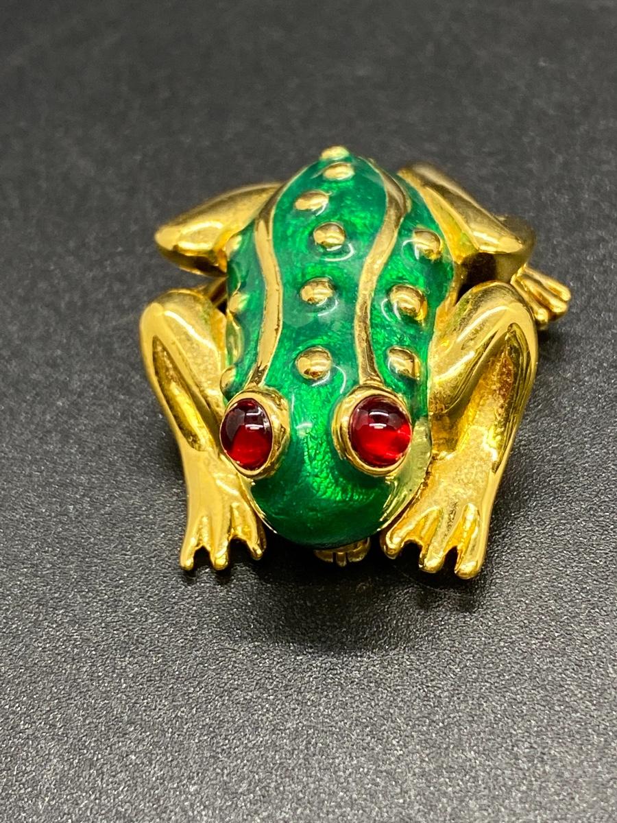Vintage Carolee goldtone and green enamel frog pin. red cabochon eyes. Cute, about 1.5" size.