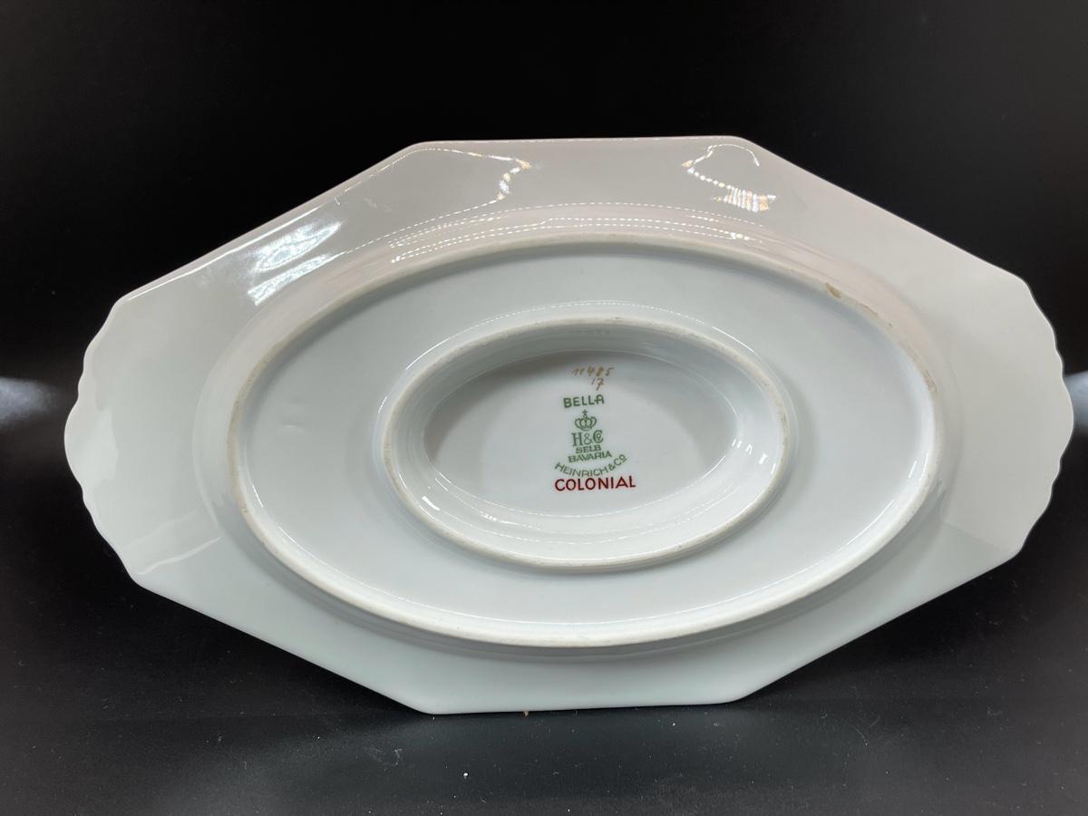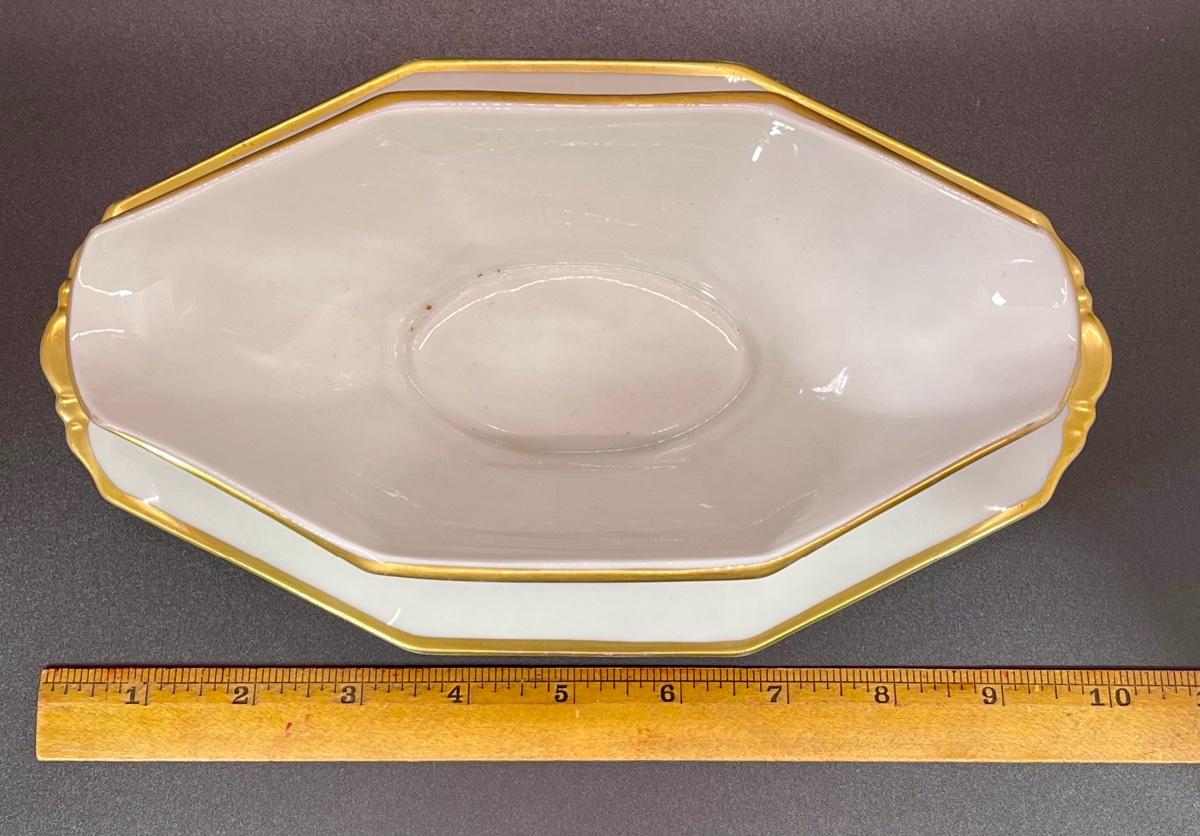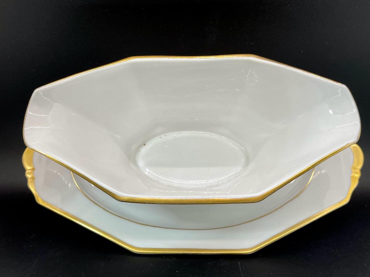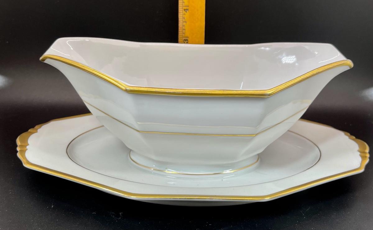 Simple but elegant Heinrich & Co white with gold trim gravy/sauce boat. Has plate base attached. Good condition.