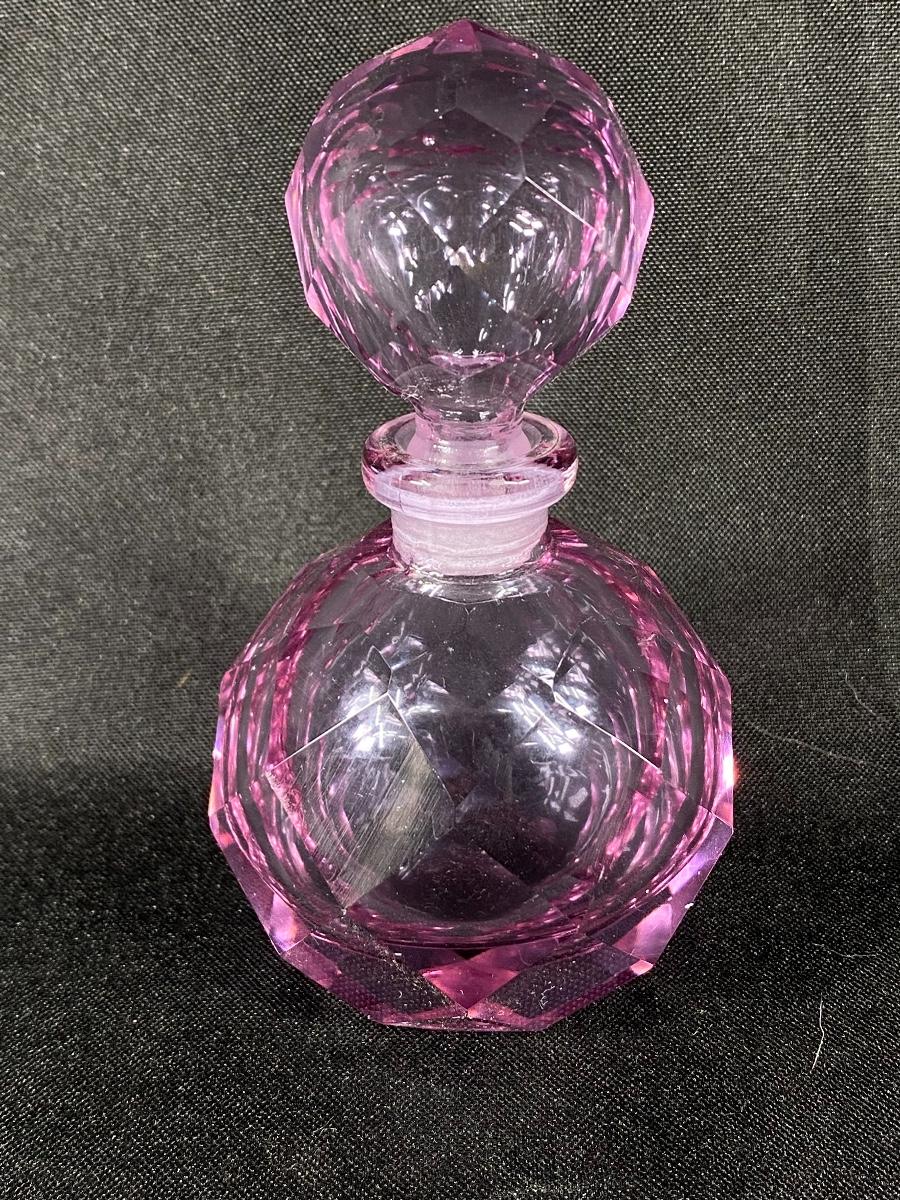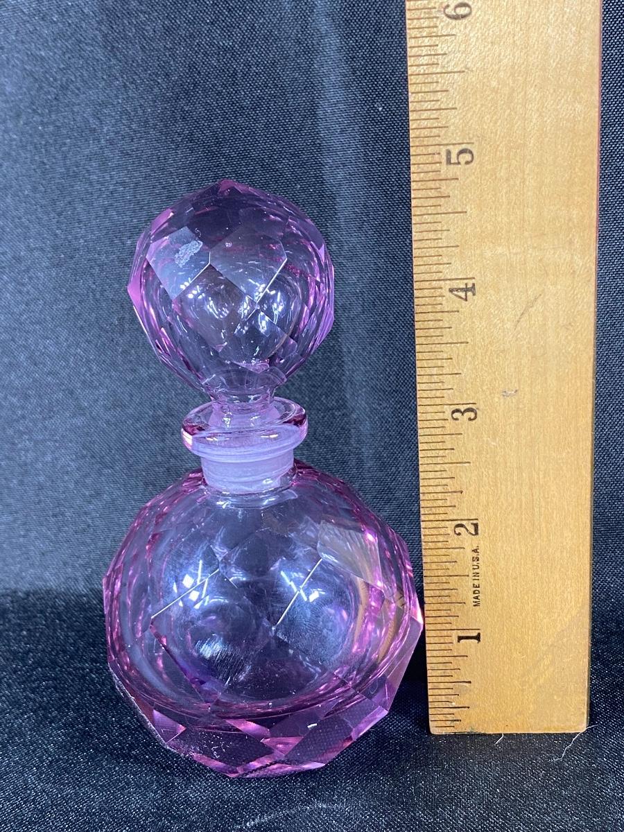 Bright pink glass perfume bottle. Good condition. Under 5" size.