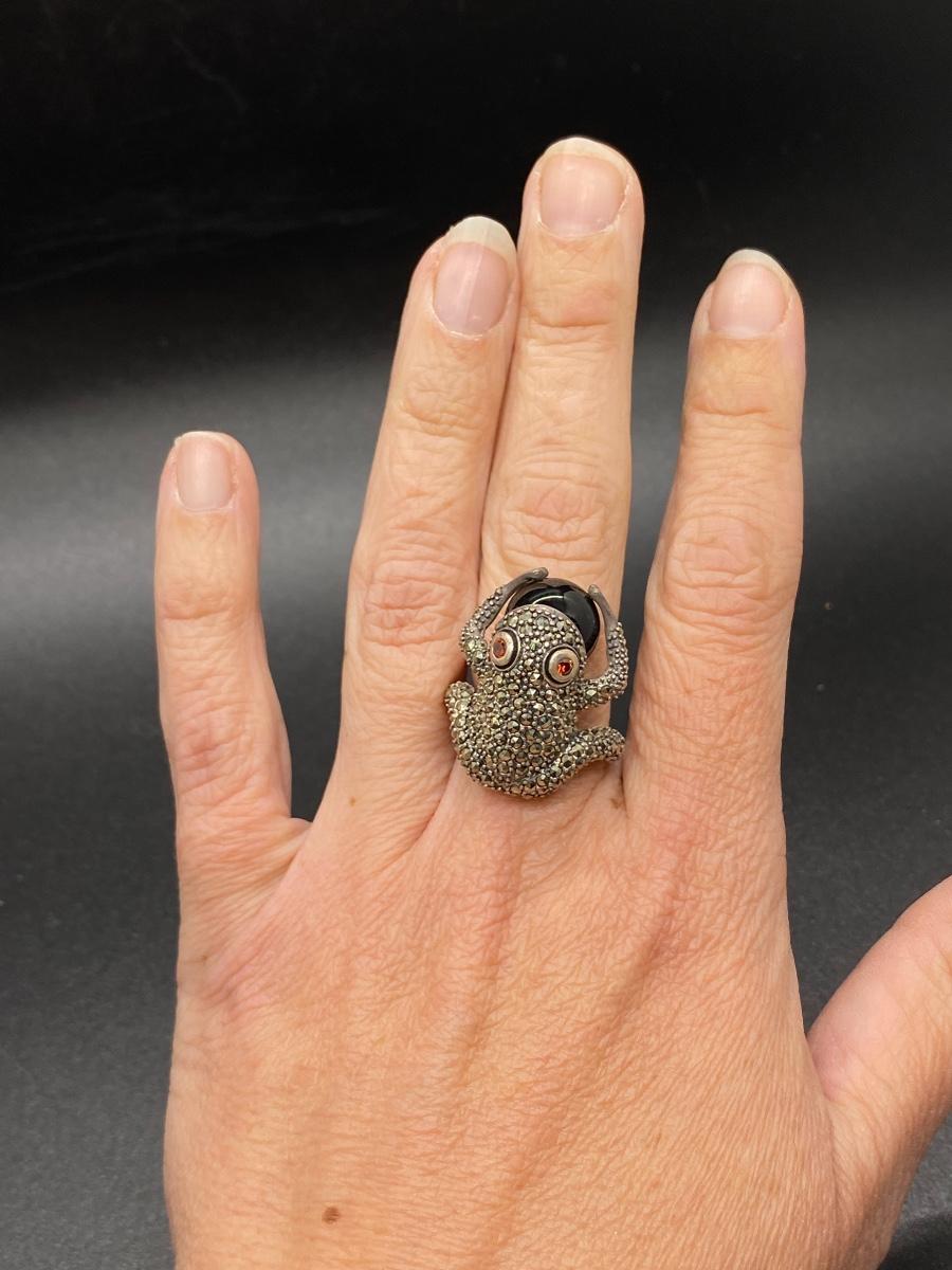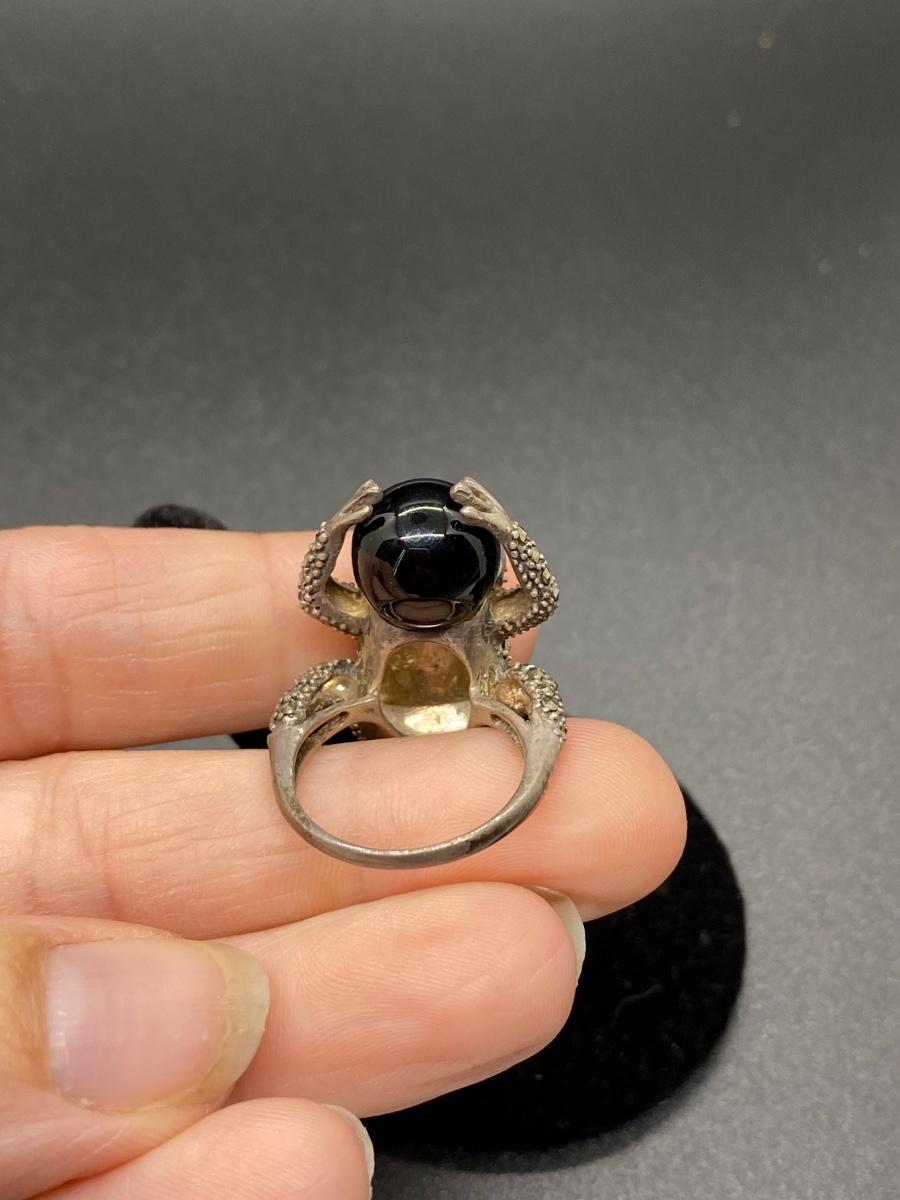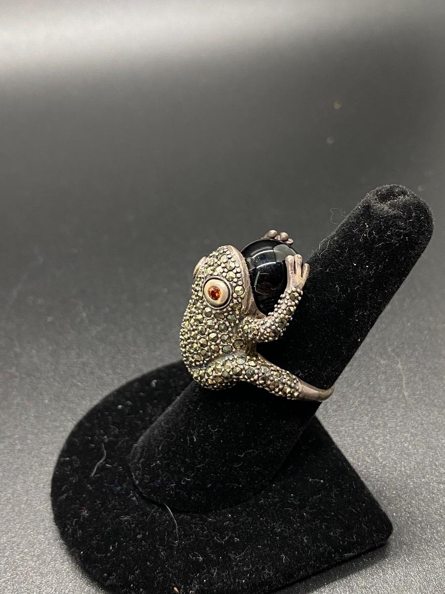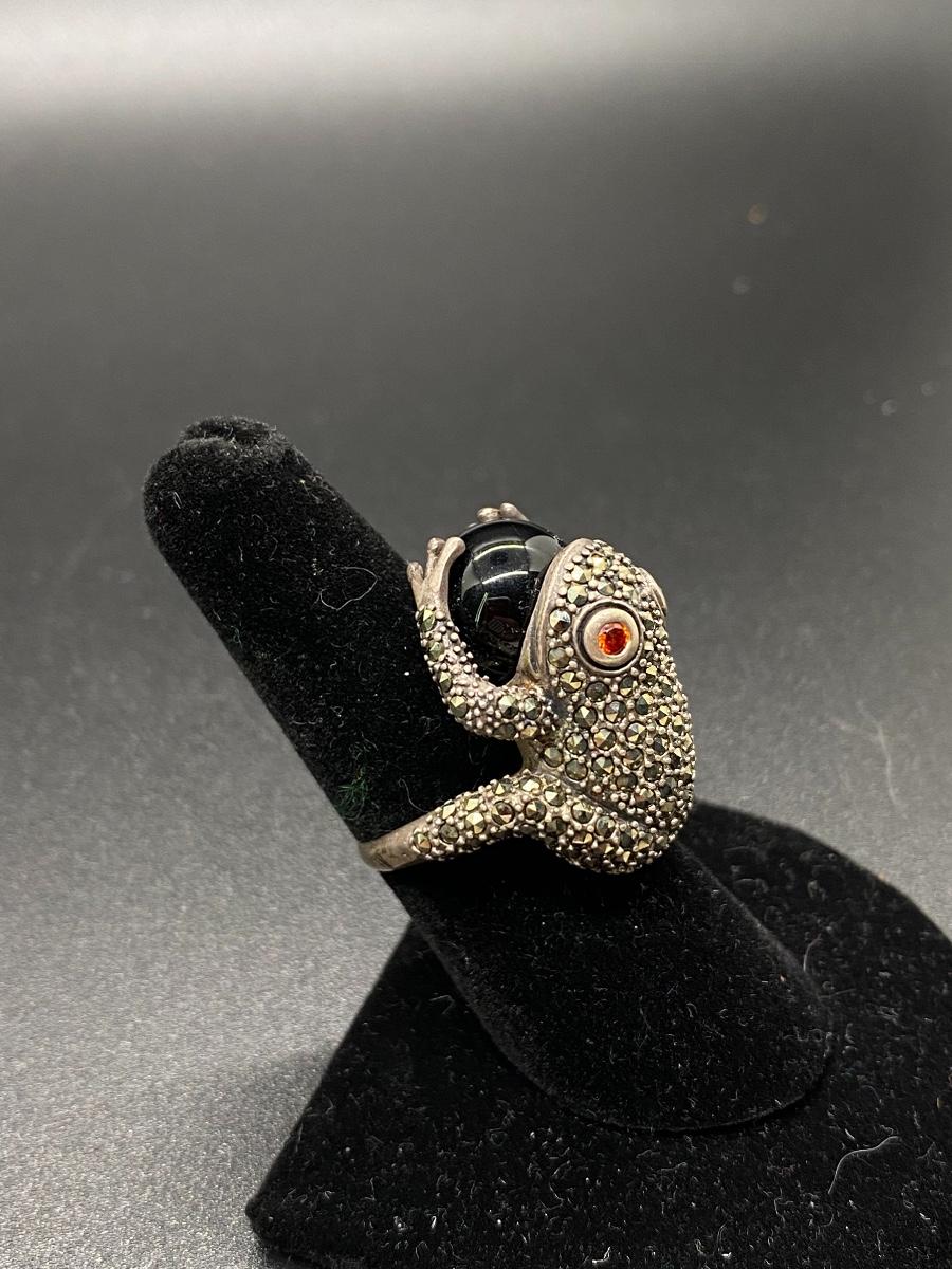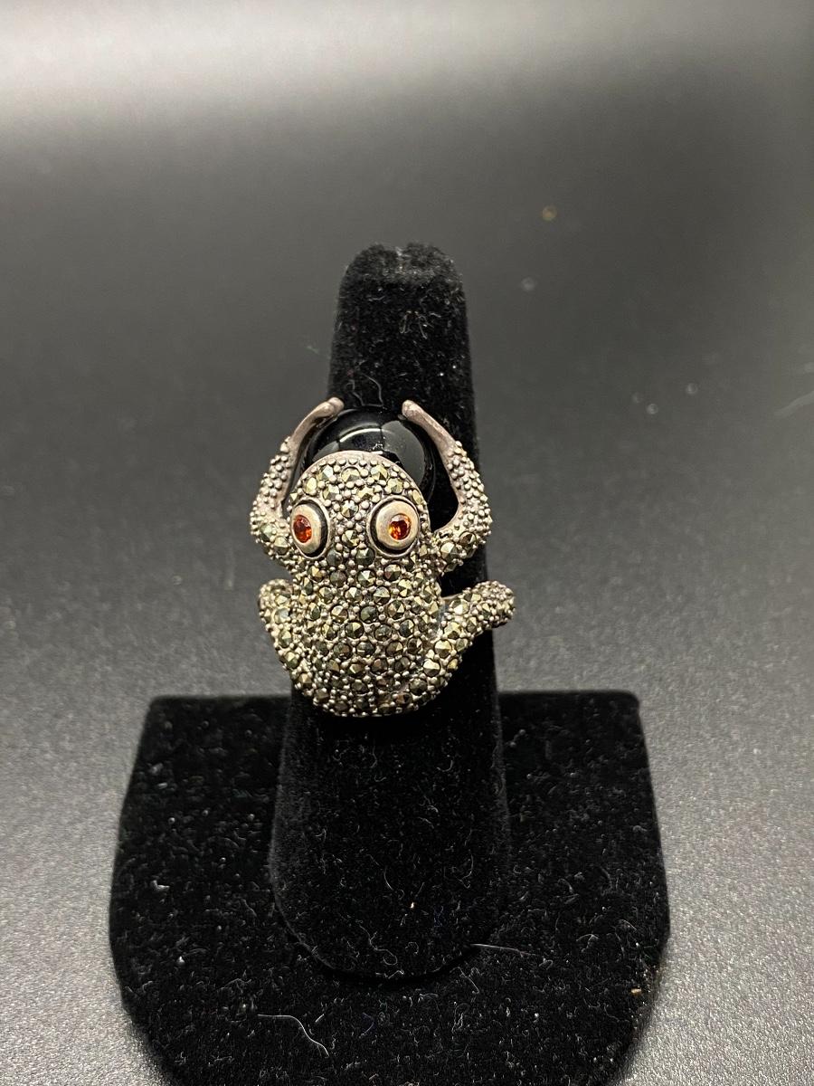 Marcasite covered sterling silver frog ring. Frog is holding a black onyx/glass marble. Large size, maybe an 8, fit loose on middle finger. No missing stones.