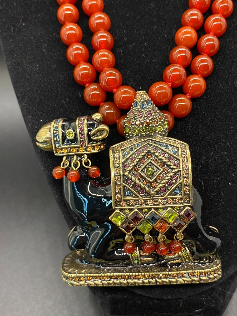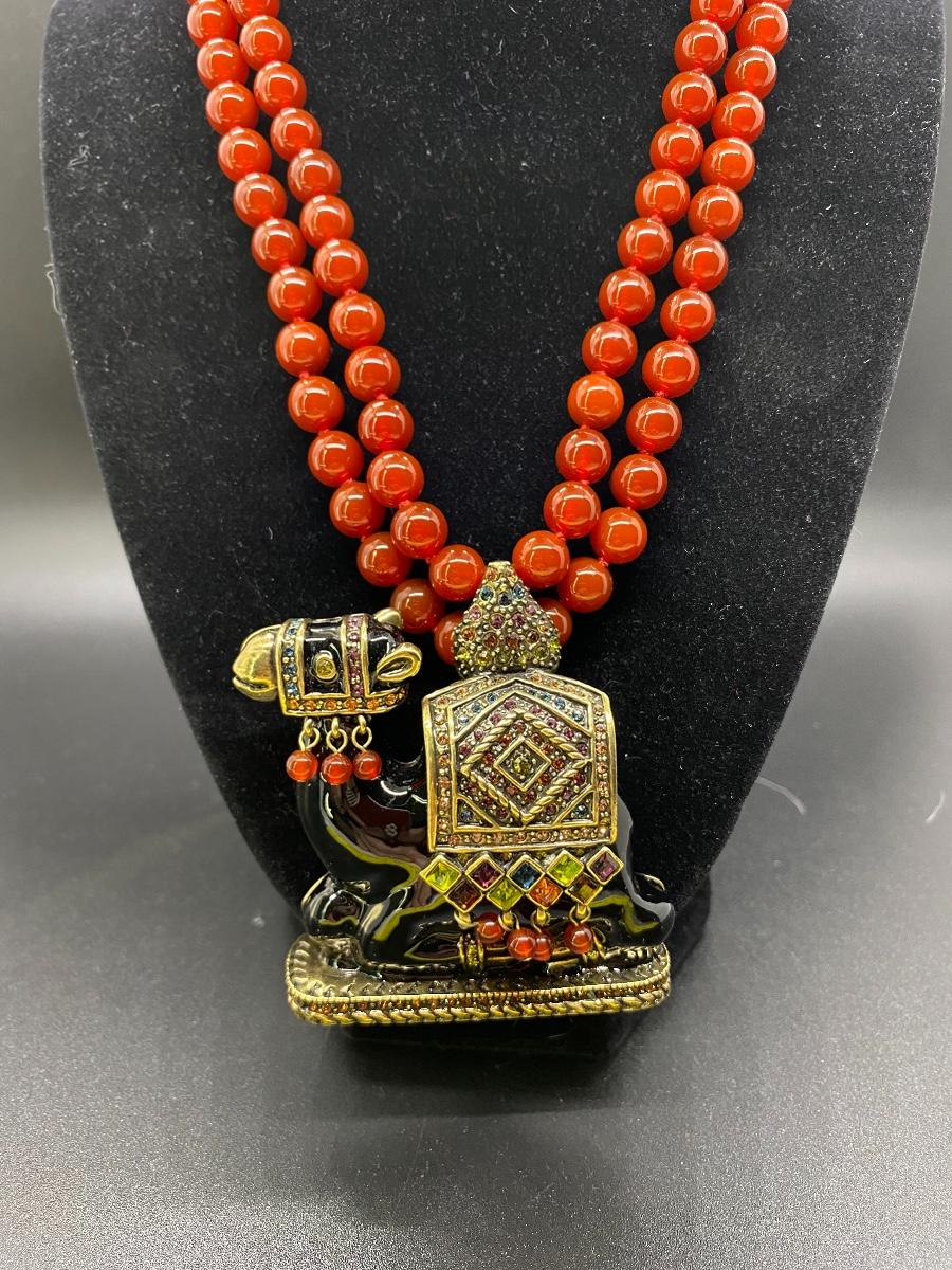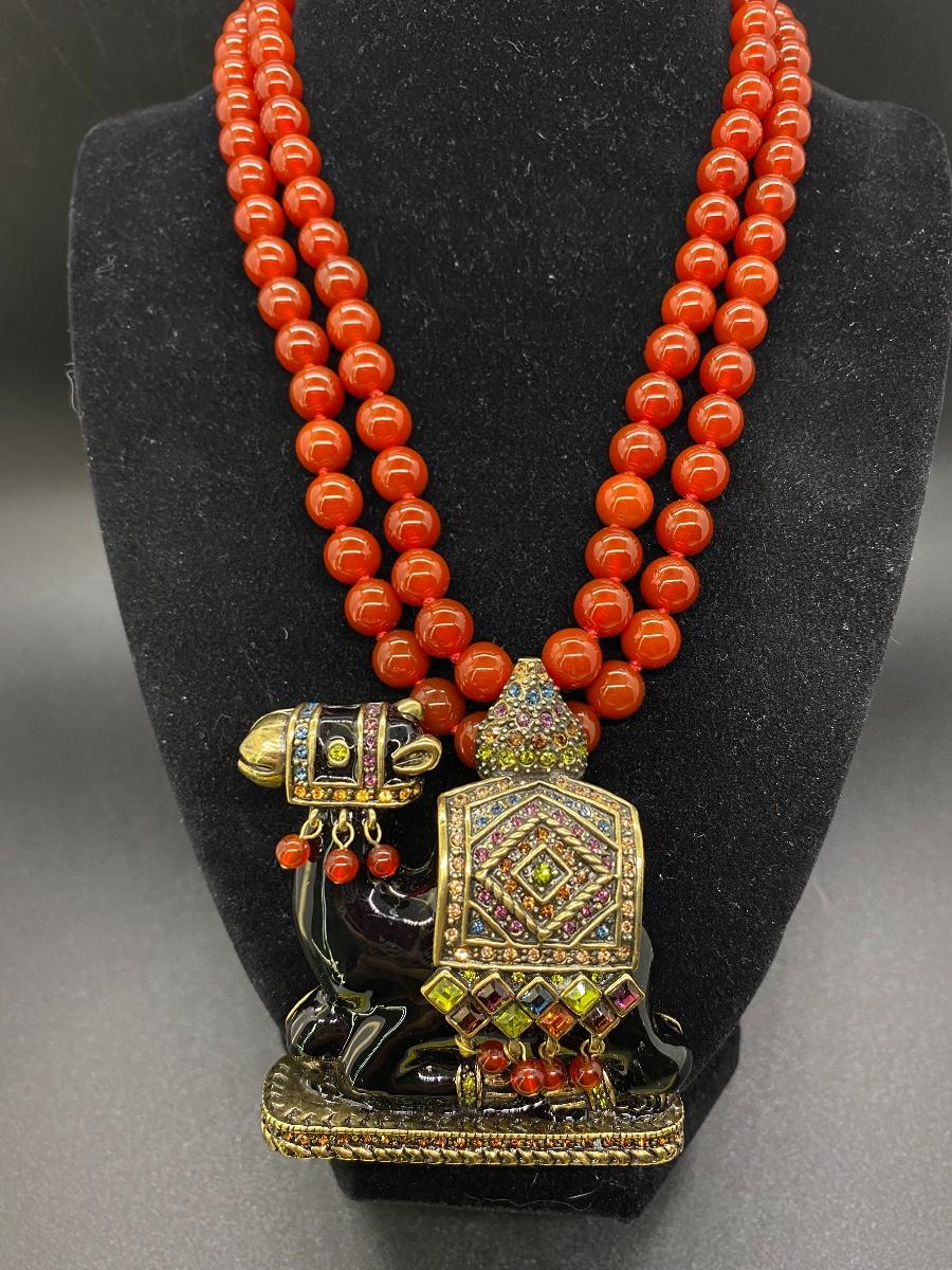 Heidi Daus Swarovski rhinestone and enamel camel double strand necklace. Beautifully decorated pendant with red orange glass beads. Choker/collar bone length. Heavy pendant, no missing stones. A statement piece.