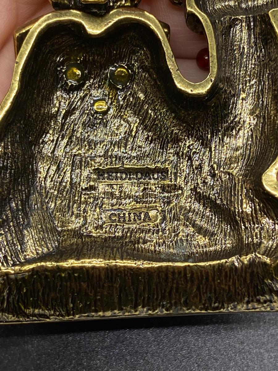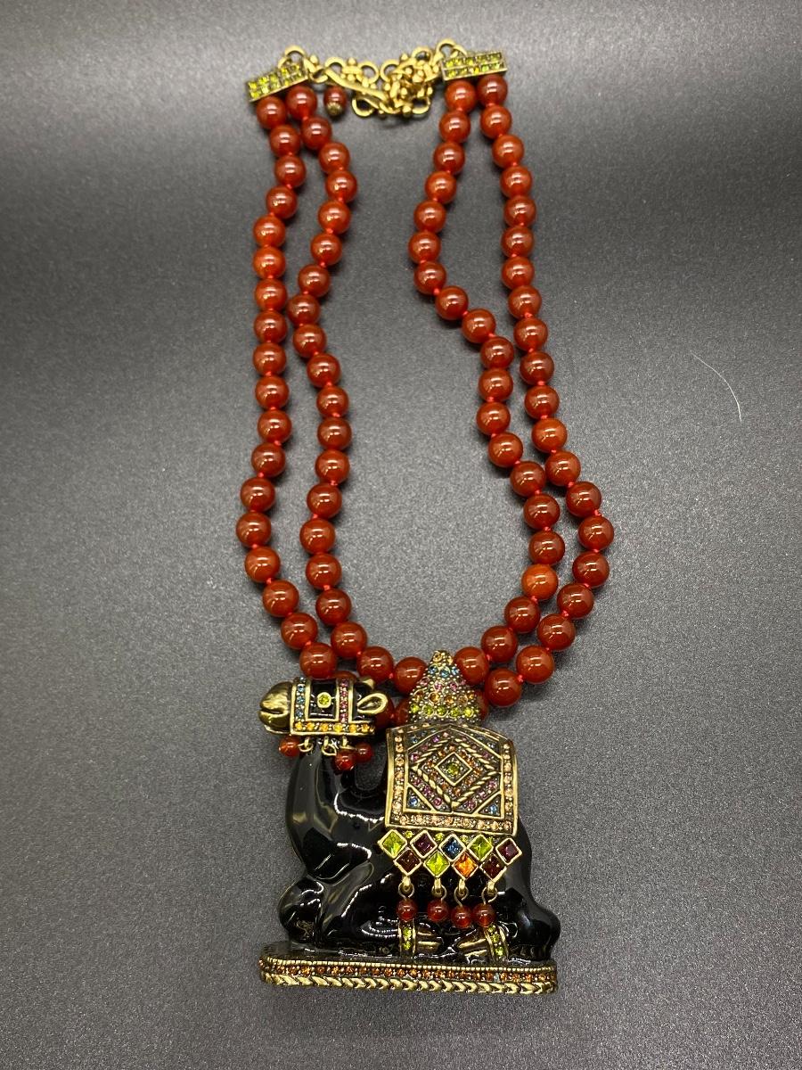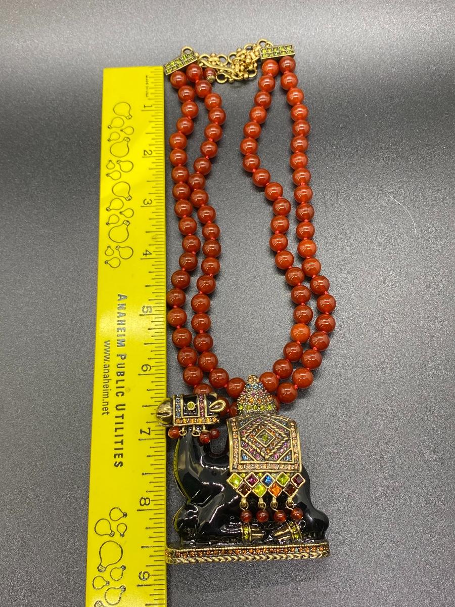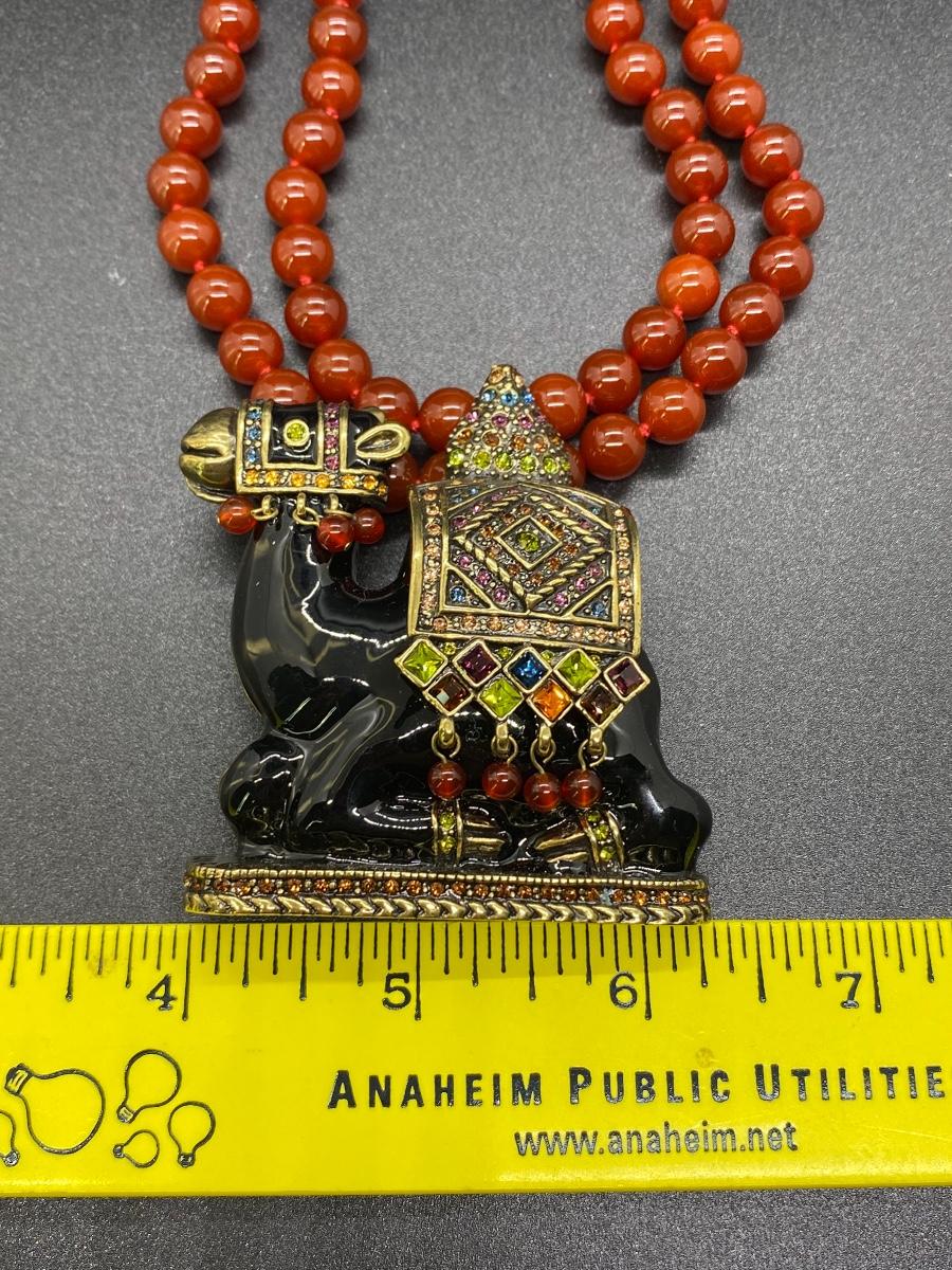 Heidi Daus Swarovski rhinestone and enamel camel double strand necklace. Beautifully decorated pendant with red orange glass beads. Choker/collar bone length. Heavy pendant, no missing stones. A statement piece.