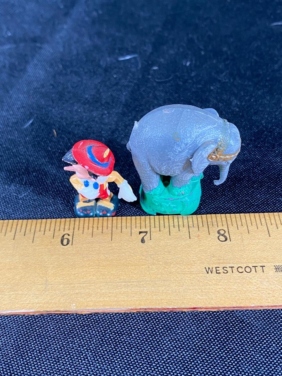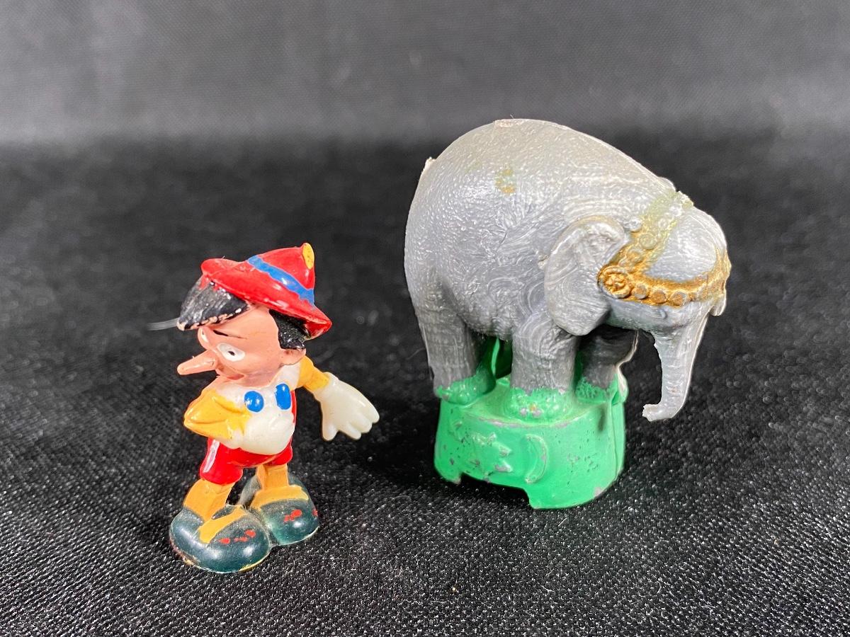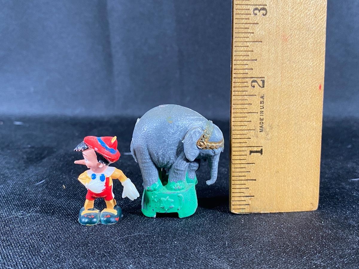 Miniature plastic Pinocchio and circus elephant figurines. About 1.5" size. Age unknown but they look older.