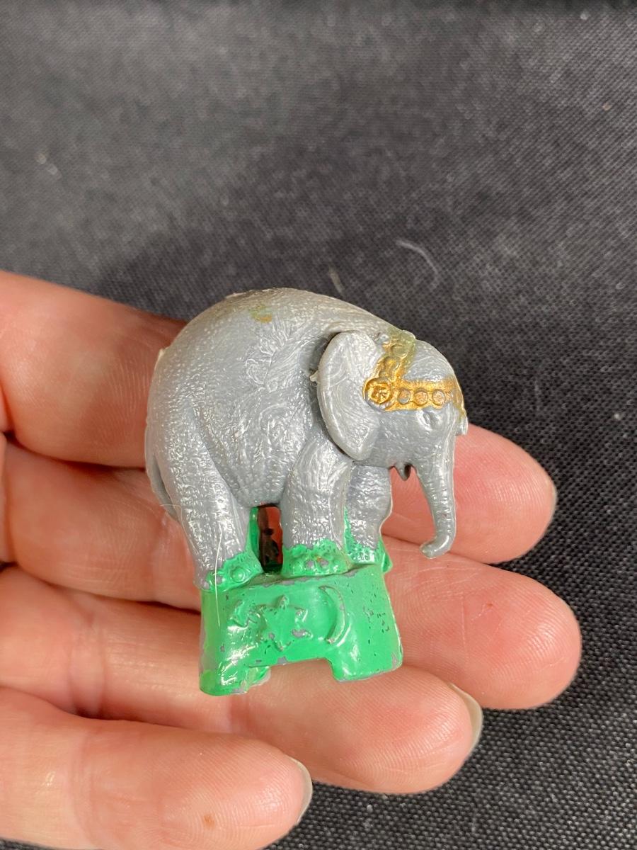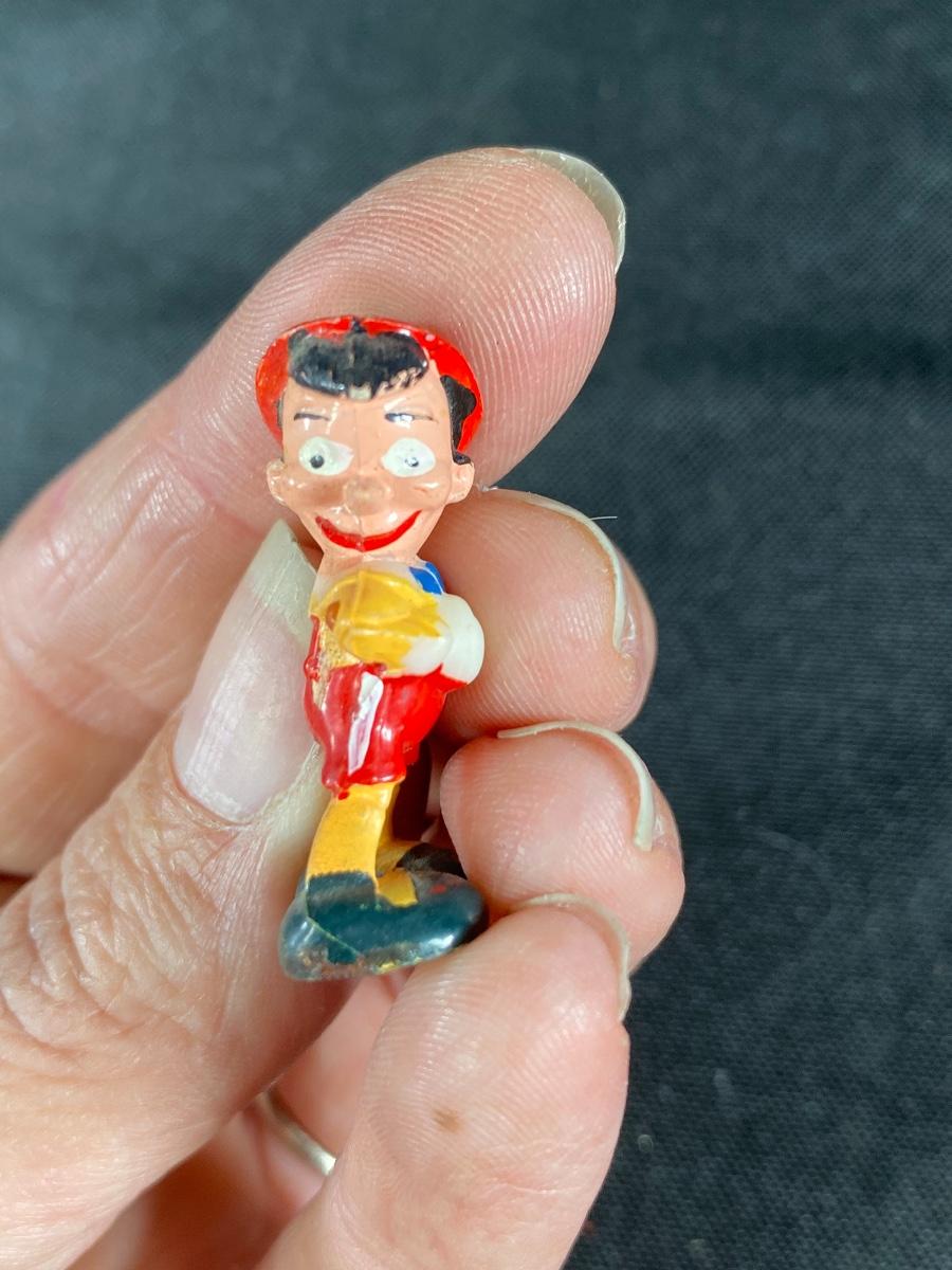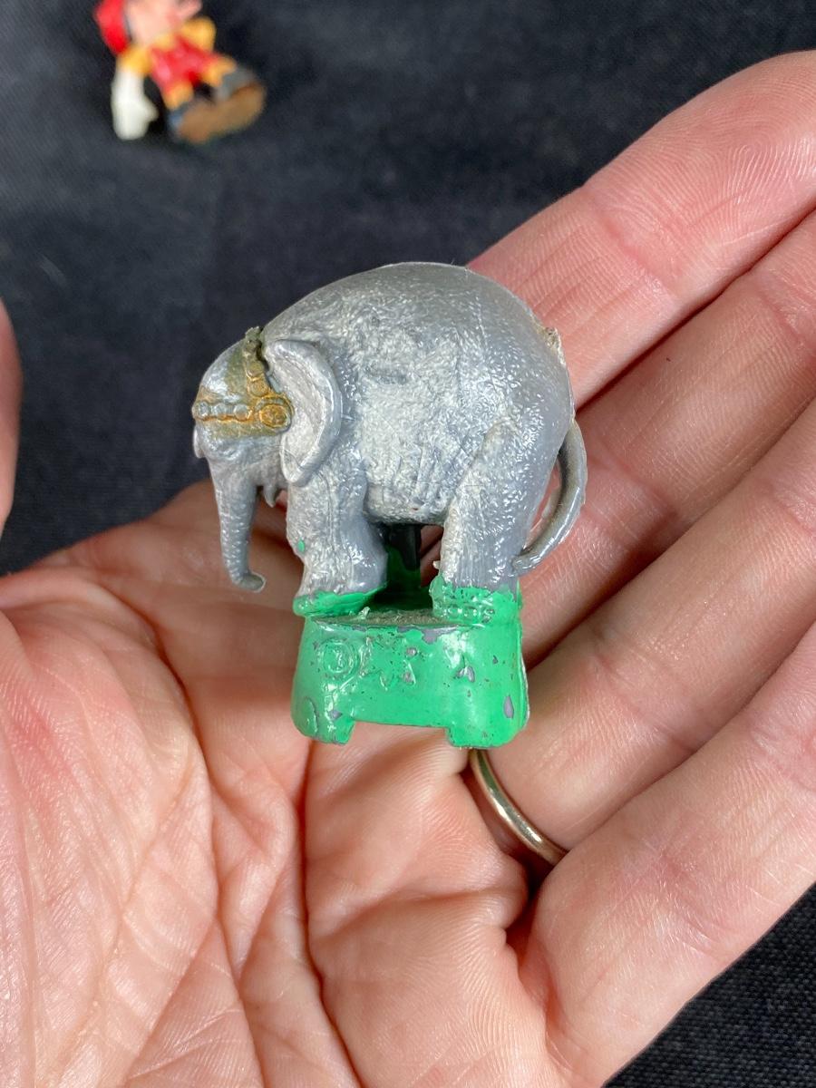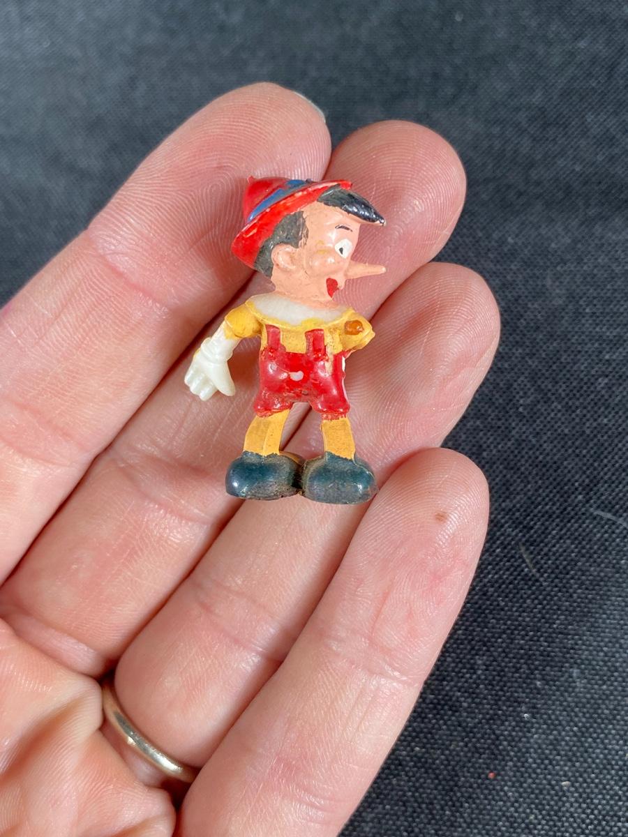 Miniature plastic Pinocchio and circus elephant figurines. About 1.5" size. Age unknown but they look older.
