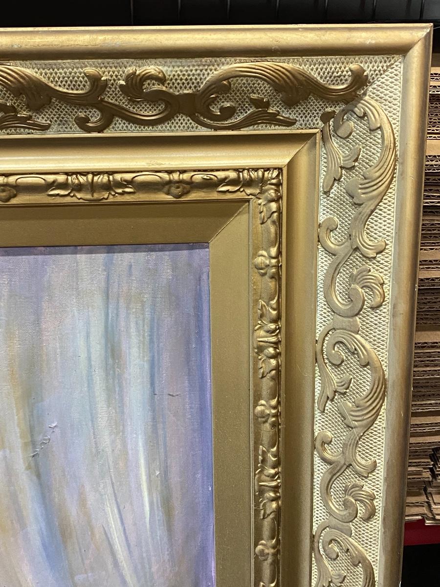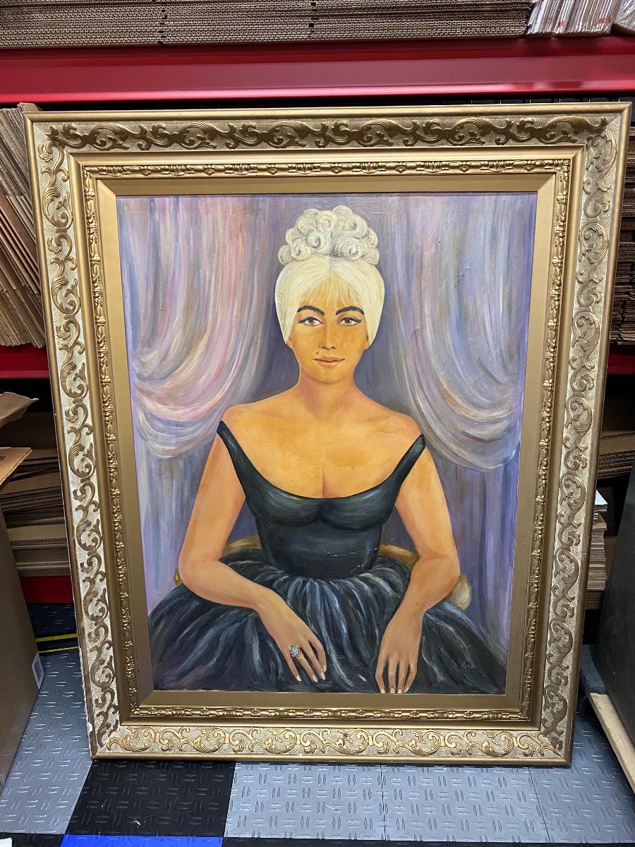 Vintage portrait painting of a woman in a black dress. Large framed painting measures about 40"x51". Signed in the bottom corner. Frame has a few scuffs from storage.