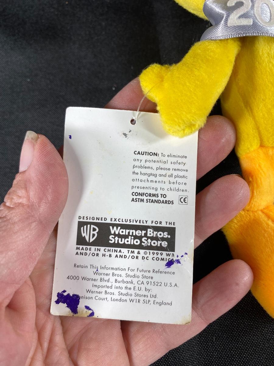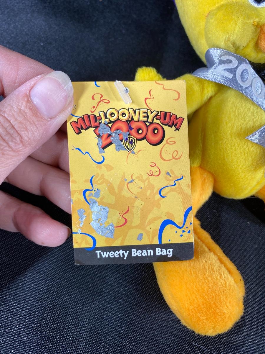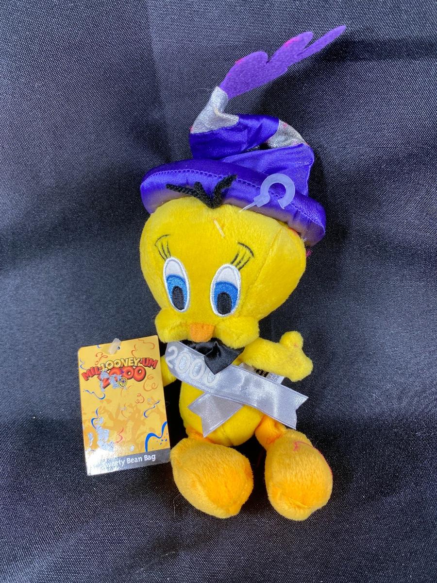 Universal Studios Tweety Bird bean bag plush celebrating the year 2000. Has original tag. The silver material on hat is degrading from age and is tacky feeling.