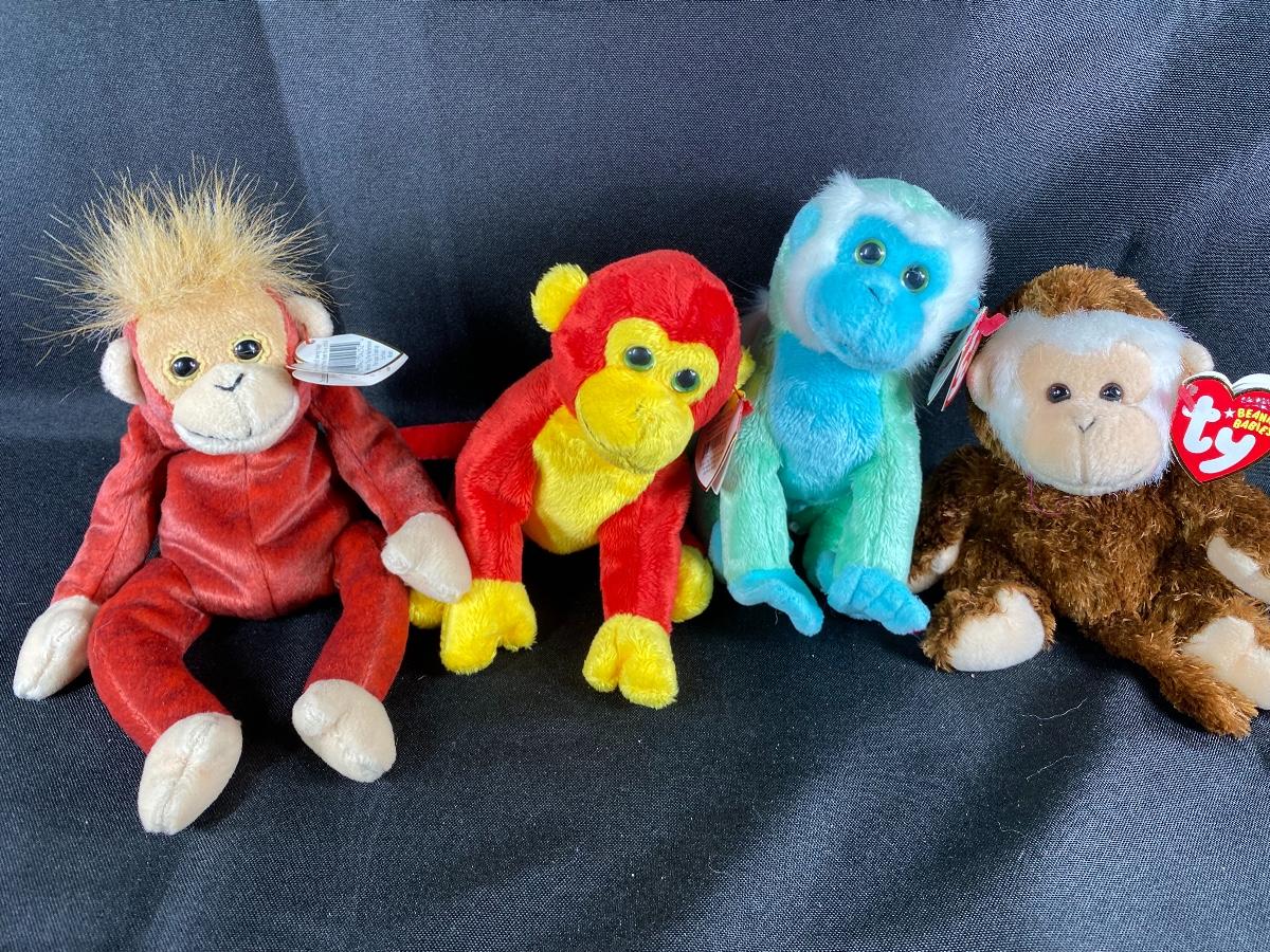 Lot of 4 monkey beanie babies. All are in good condition and have tags.