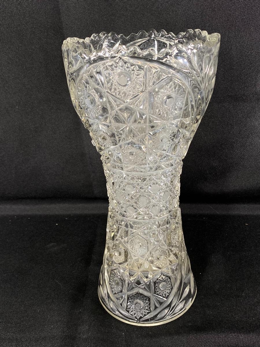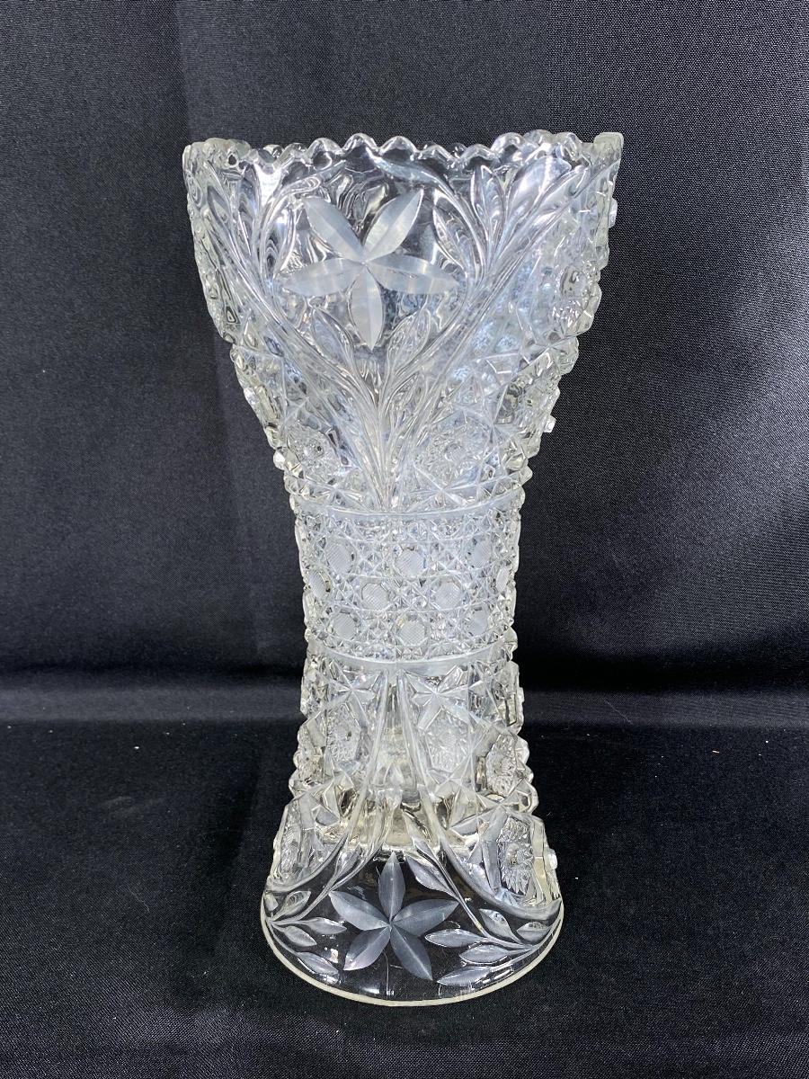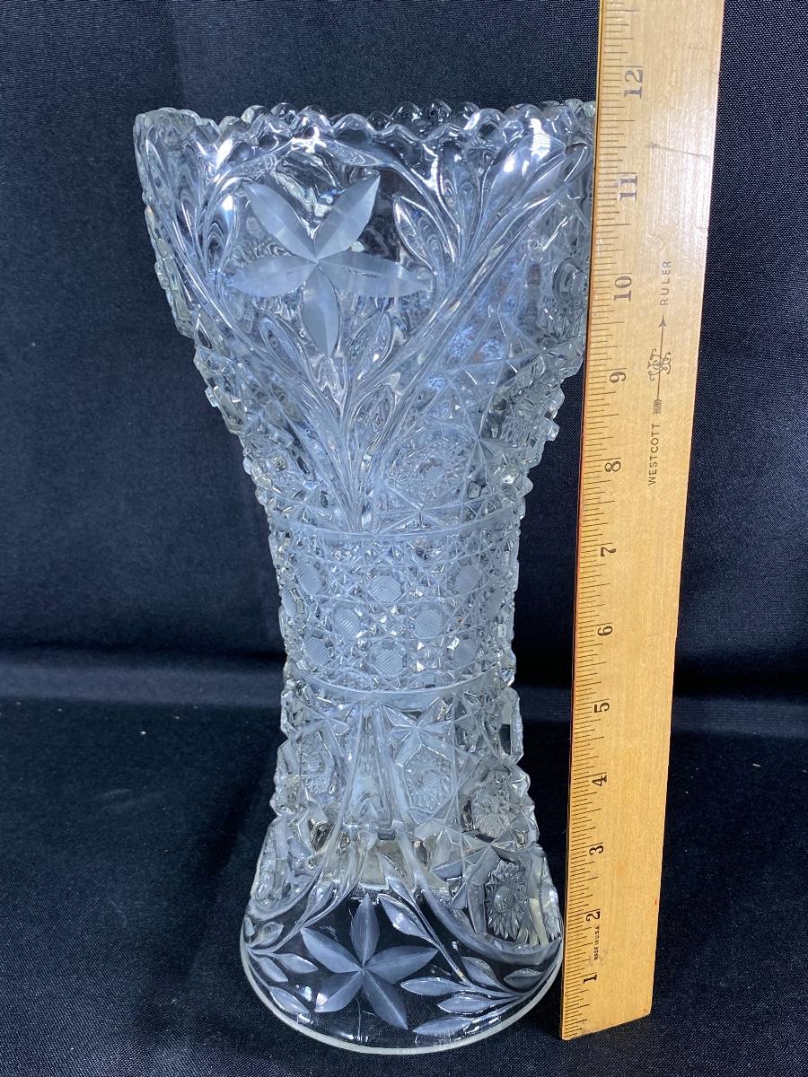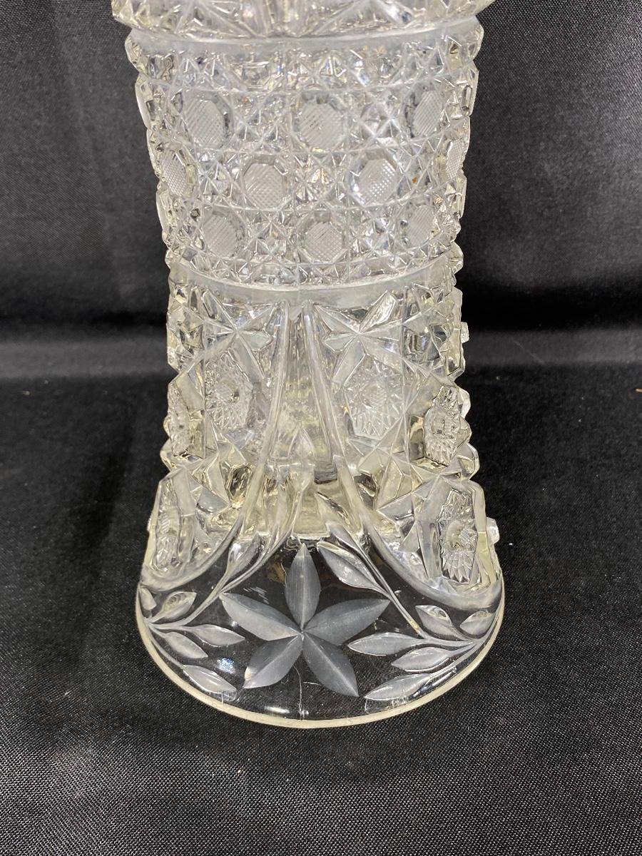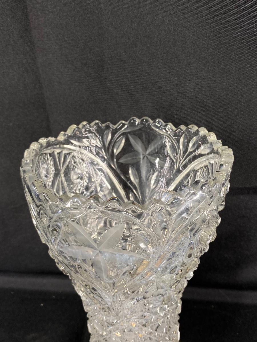 Vintage cut glass flower vase. Soft saw tooth edge, ornate cut pattern. Needs to be cleaned good, well used.