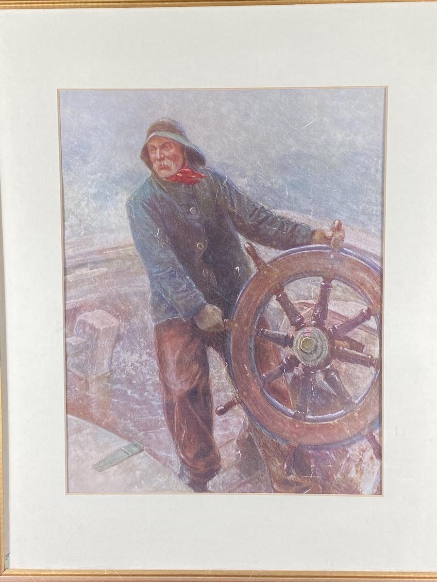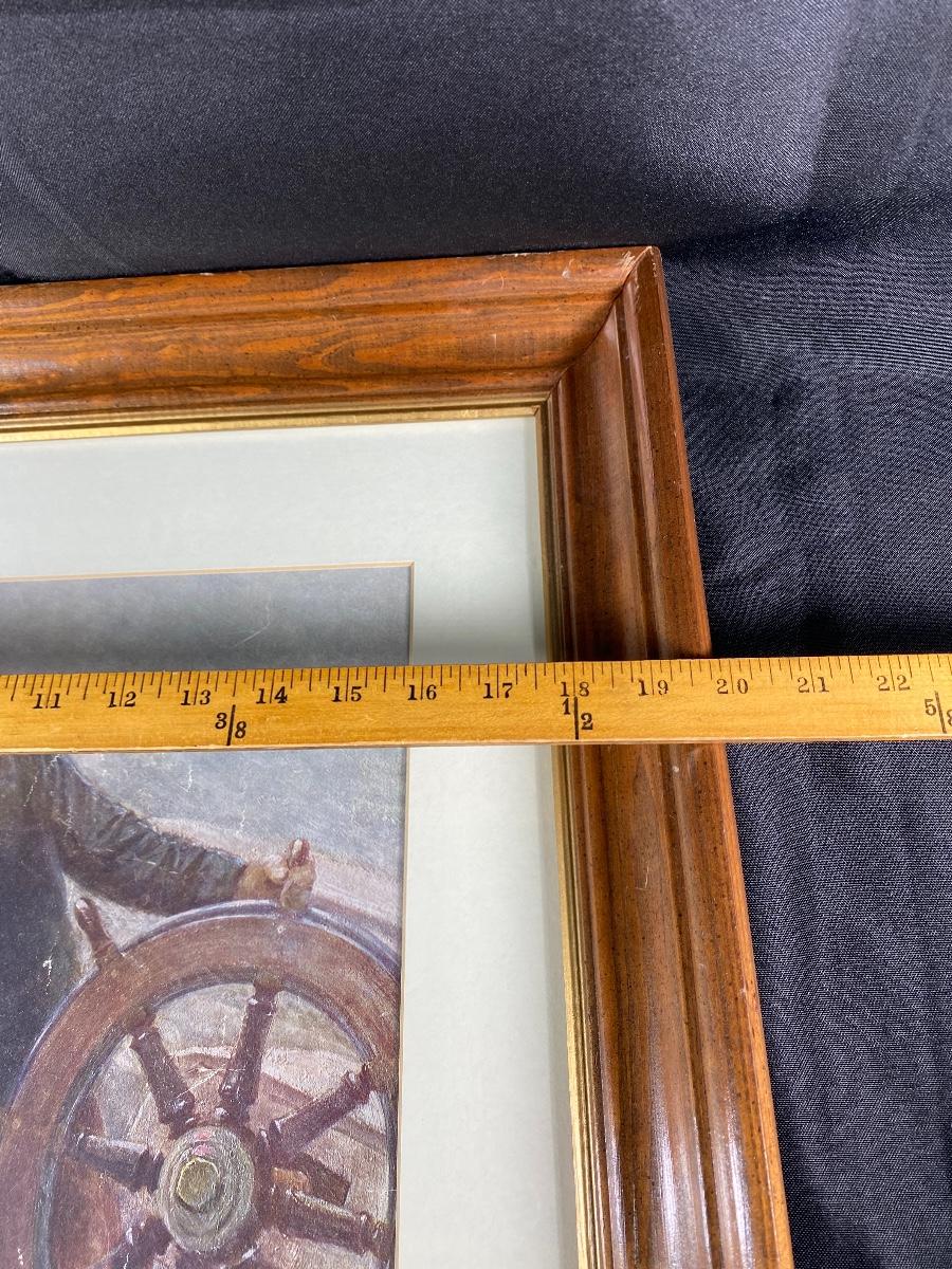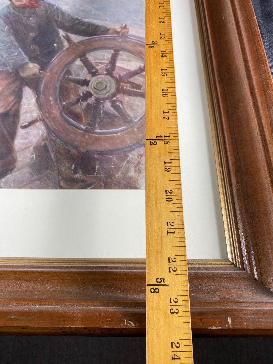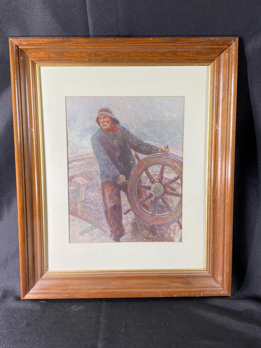 Framed sea captain at the helm framed print. Nicely framed. No signature. About 20"x24".