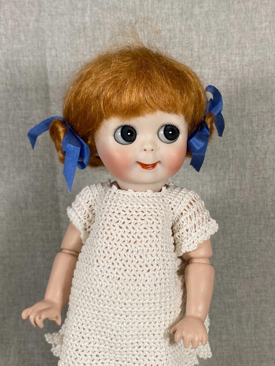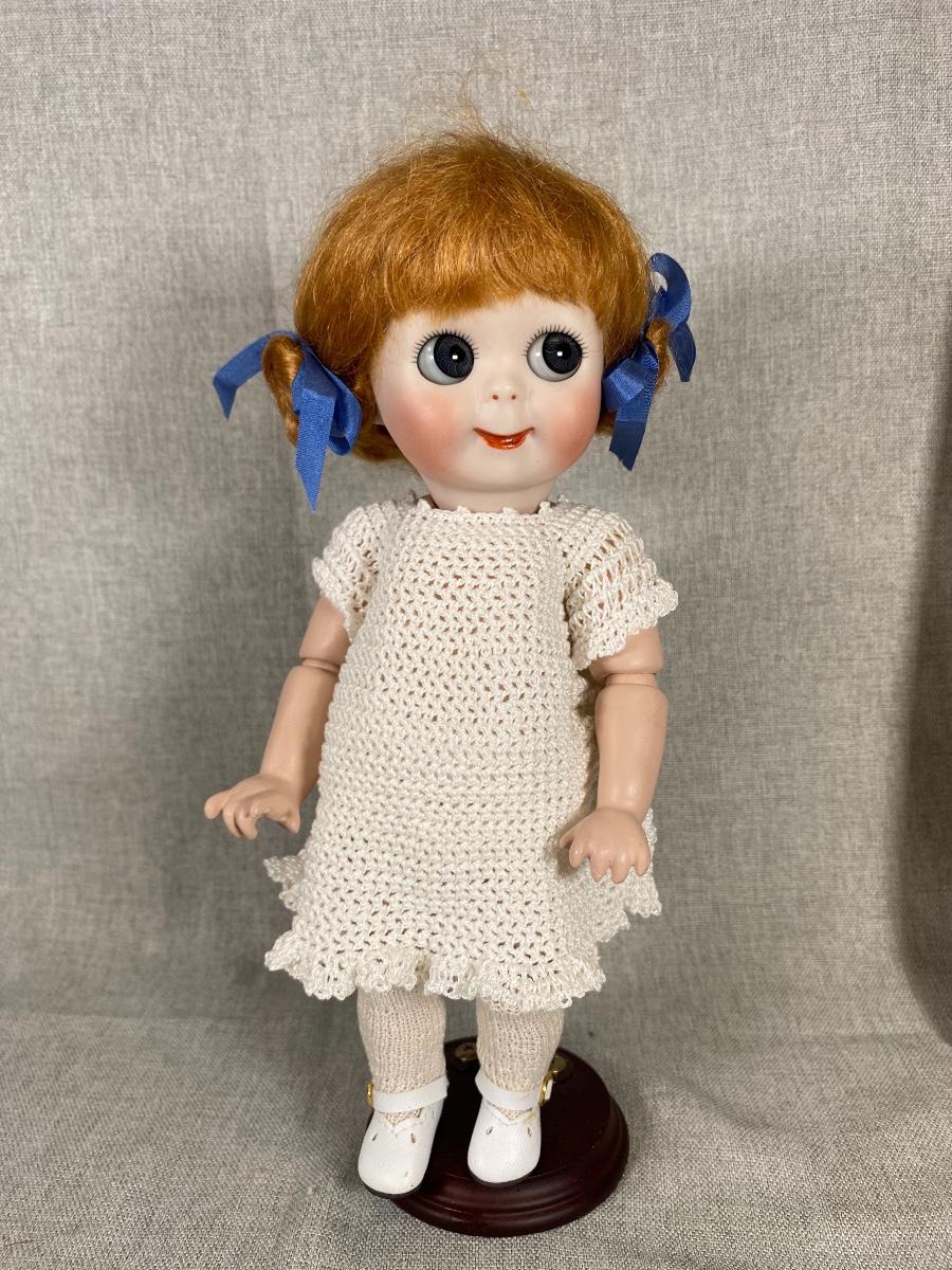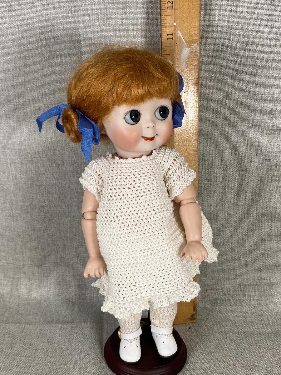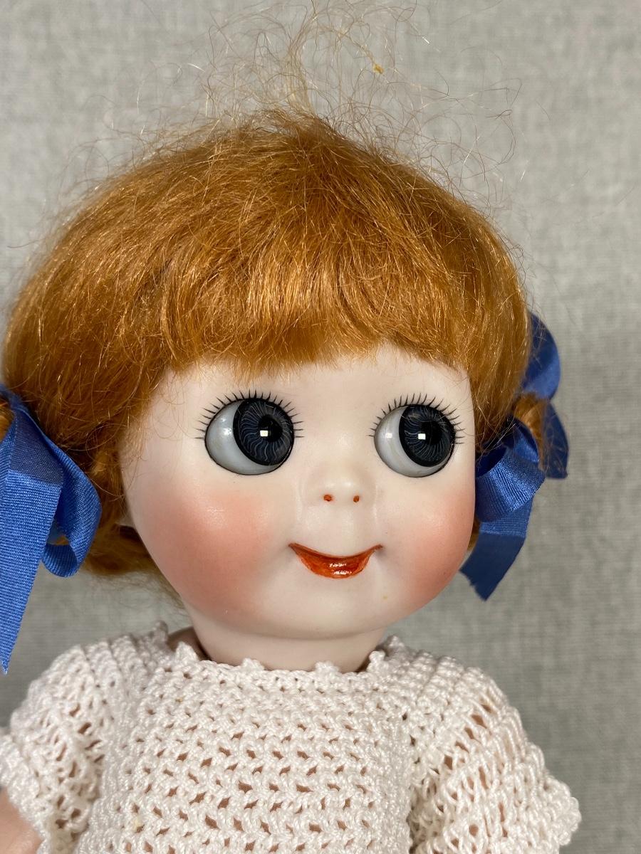 Adorable googly eye reproduction doll. Bisque and composite in good condition. Big eyes and a watermelon smile. Super cute. Signed McKenzie 20. Under 10" size, comes with stand.