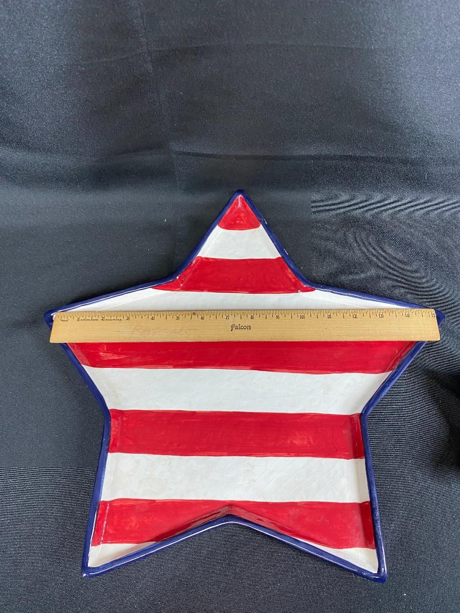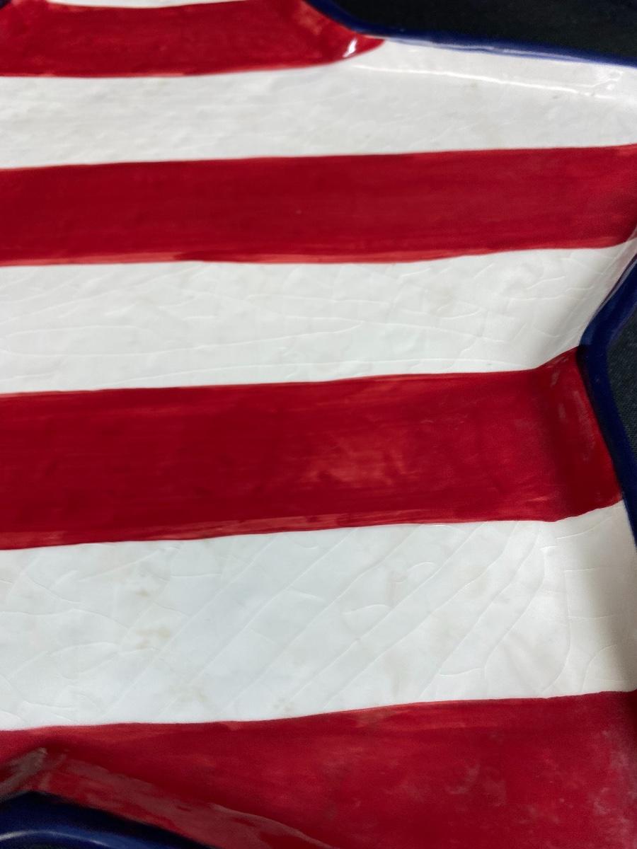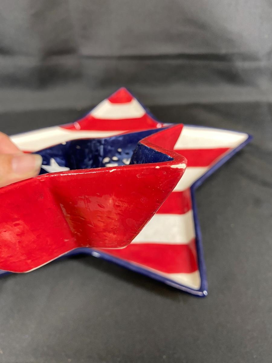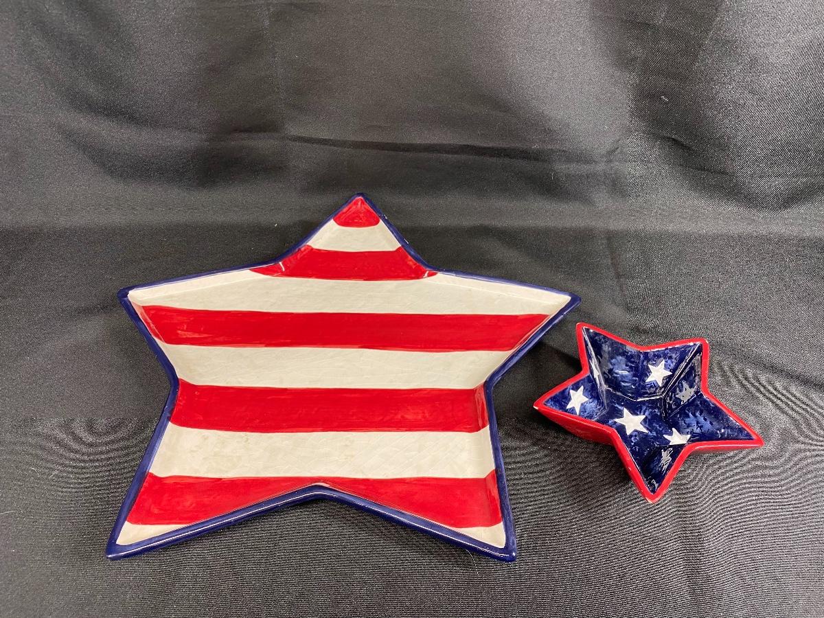 Red, white, and blue star shaped platter and dip bowl. A couple small chips in edge and crazing but great for summertime parties.