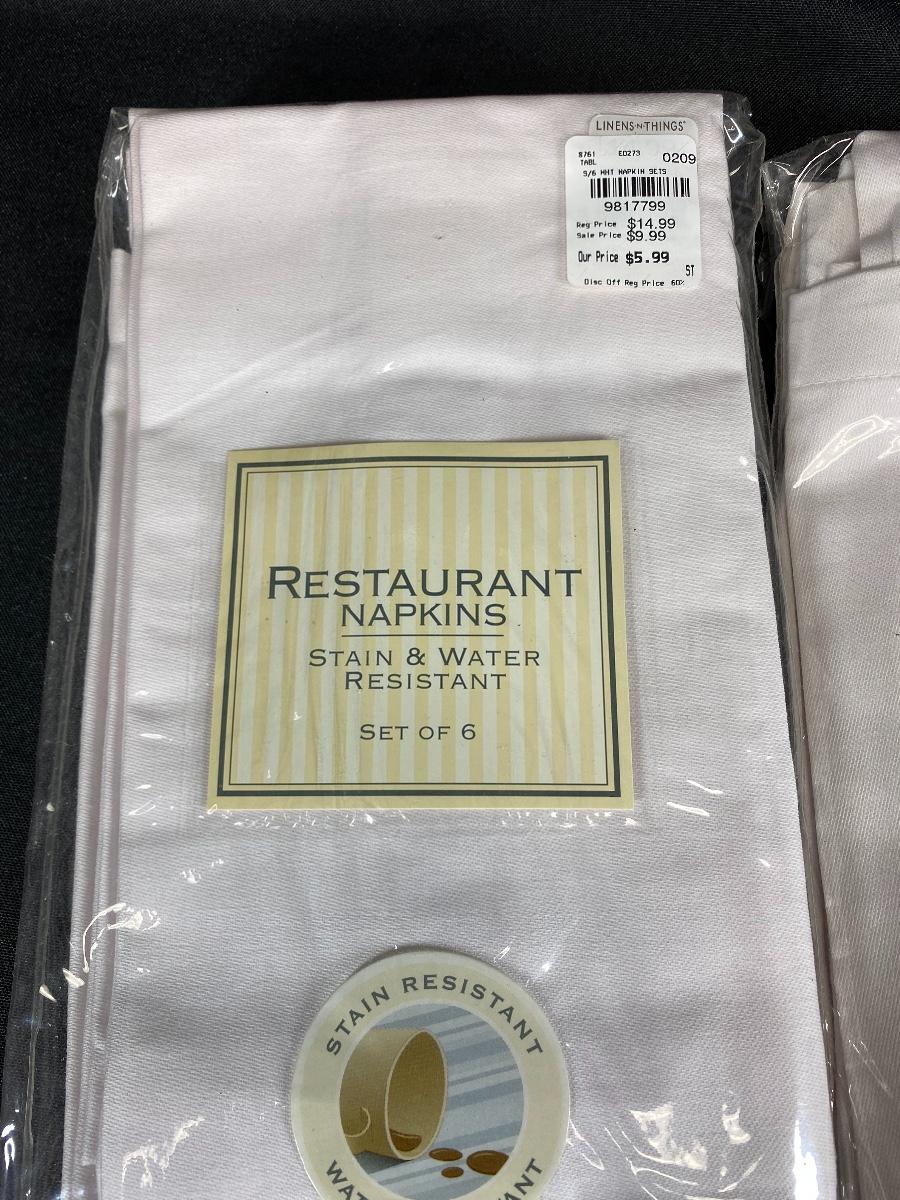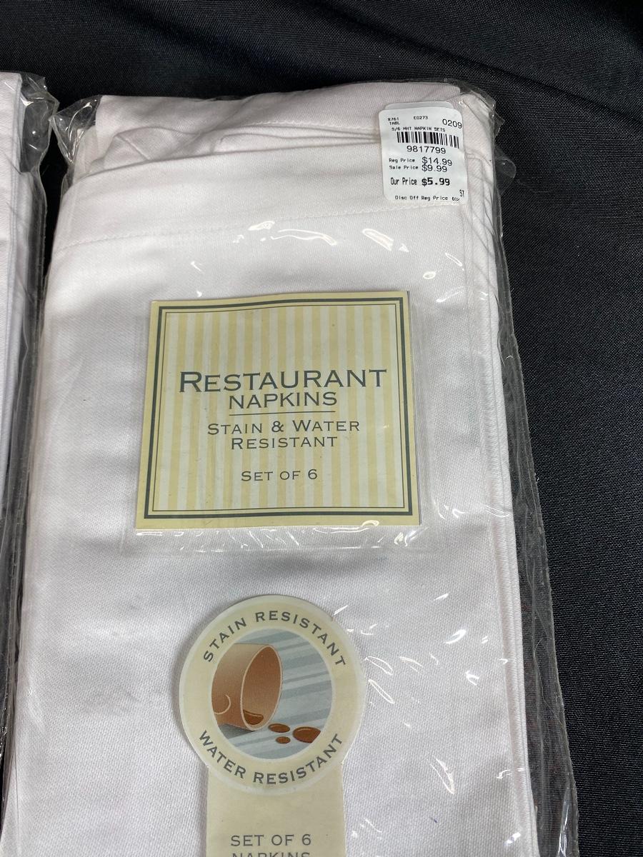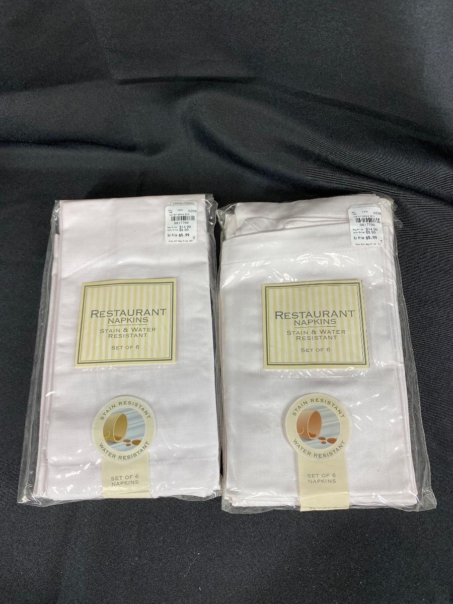 Two sets of white linen napkins. Unopened packs of 6, total of 12.
