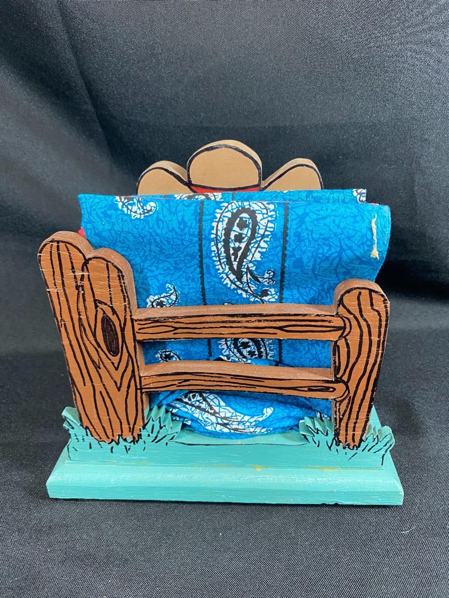 Precious Moments style cowboy napkin holder. Handmade by previous owner. Comes with bandanas.