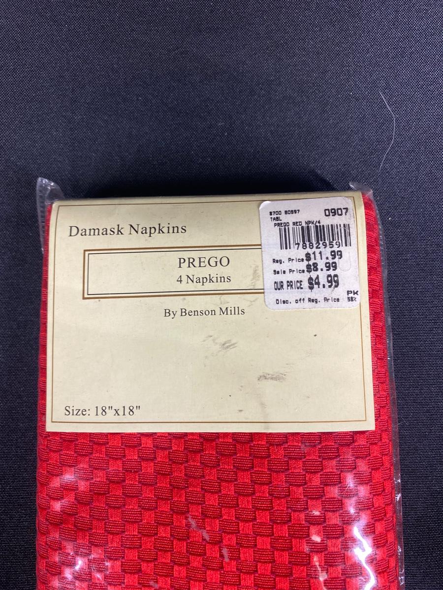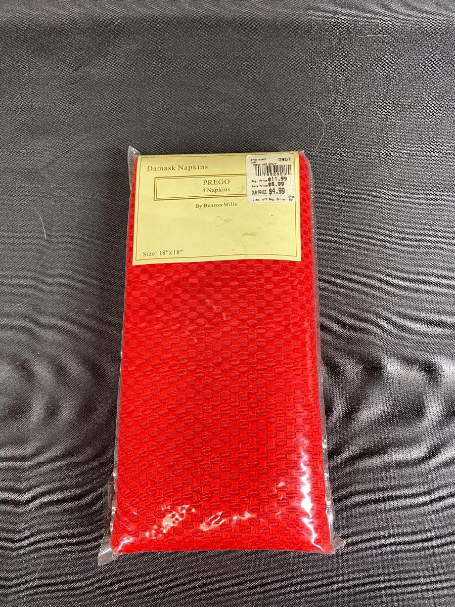 New in the package, set of 4 red damask napkins. Large 18x18 size.