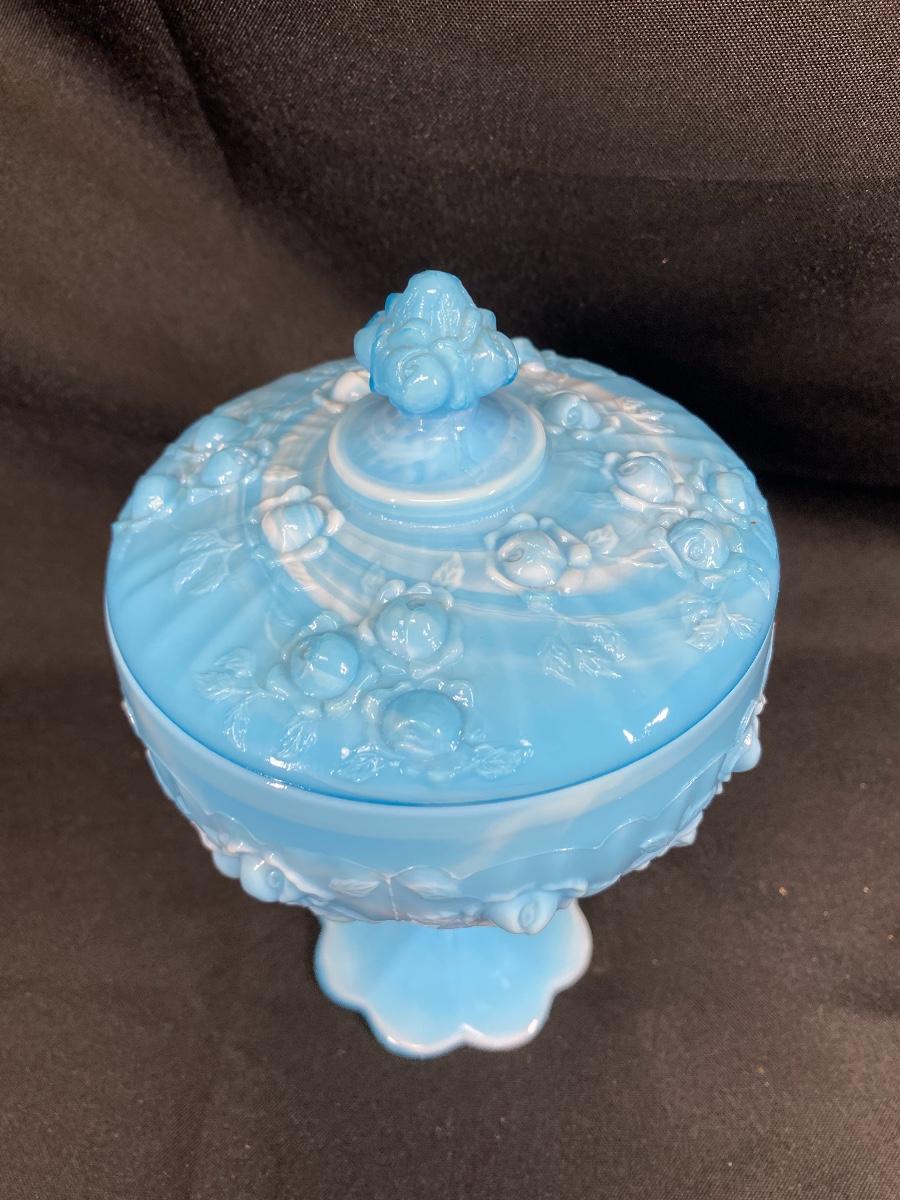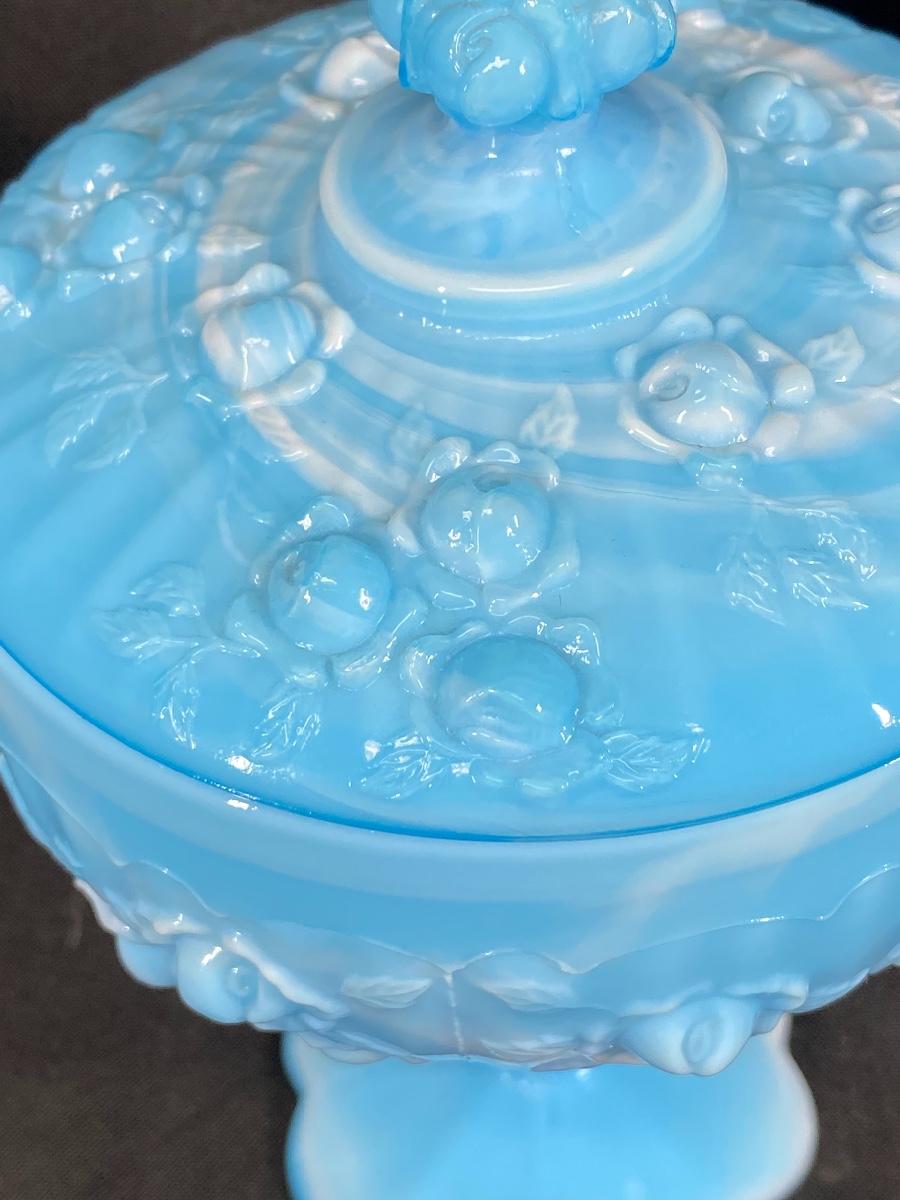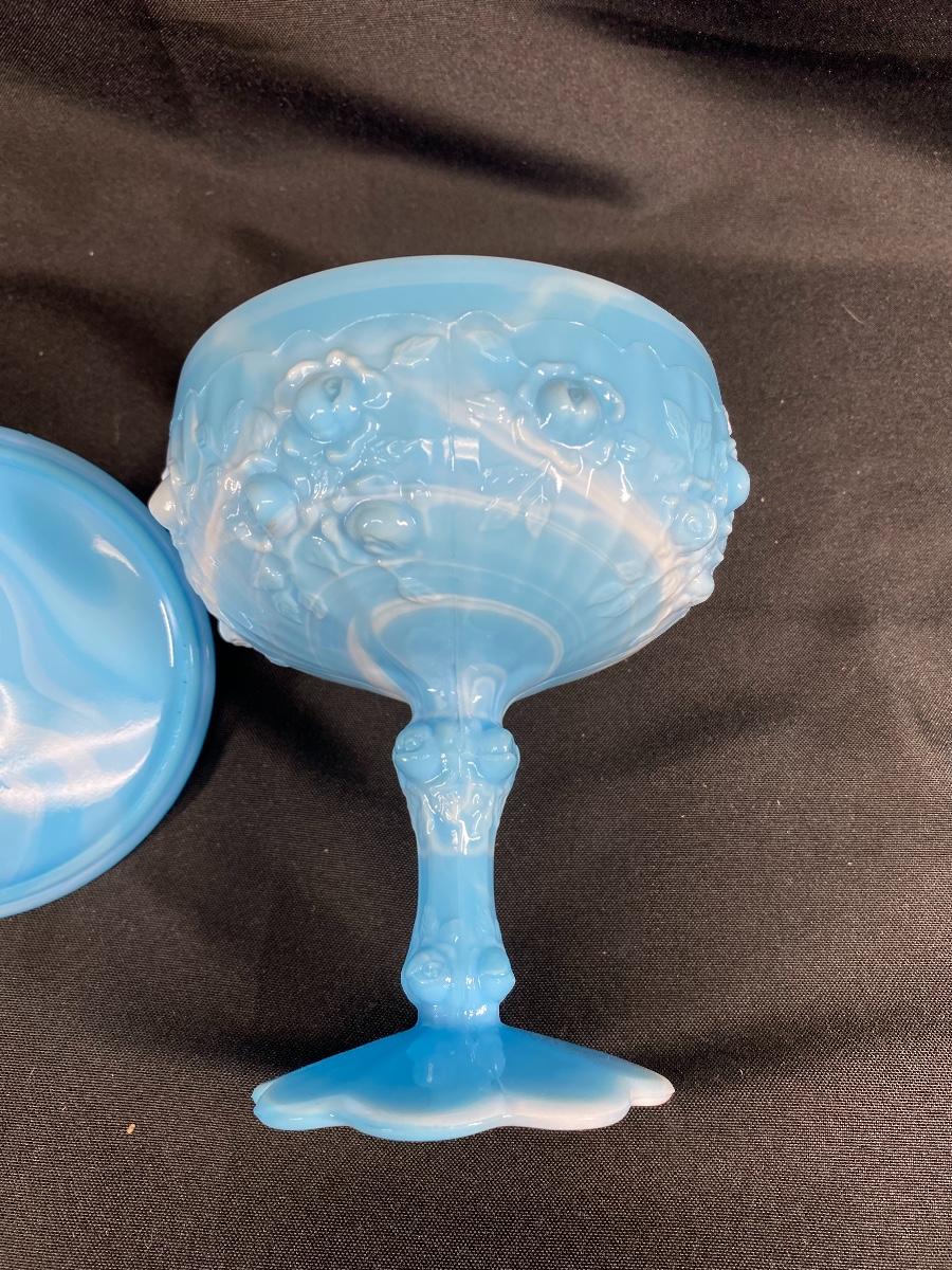 Turquoise blue and white slag glass candy dish. Pedestal style with embossed floral pattern. In good condition. About 8" tall.
