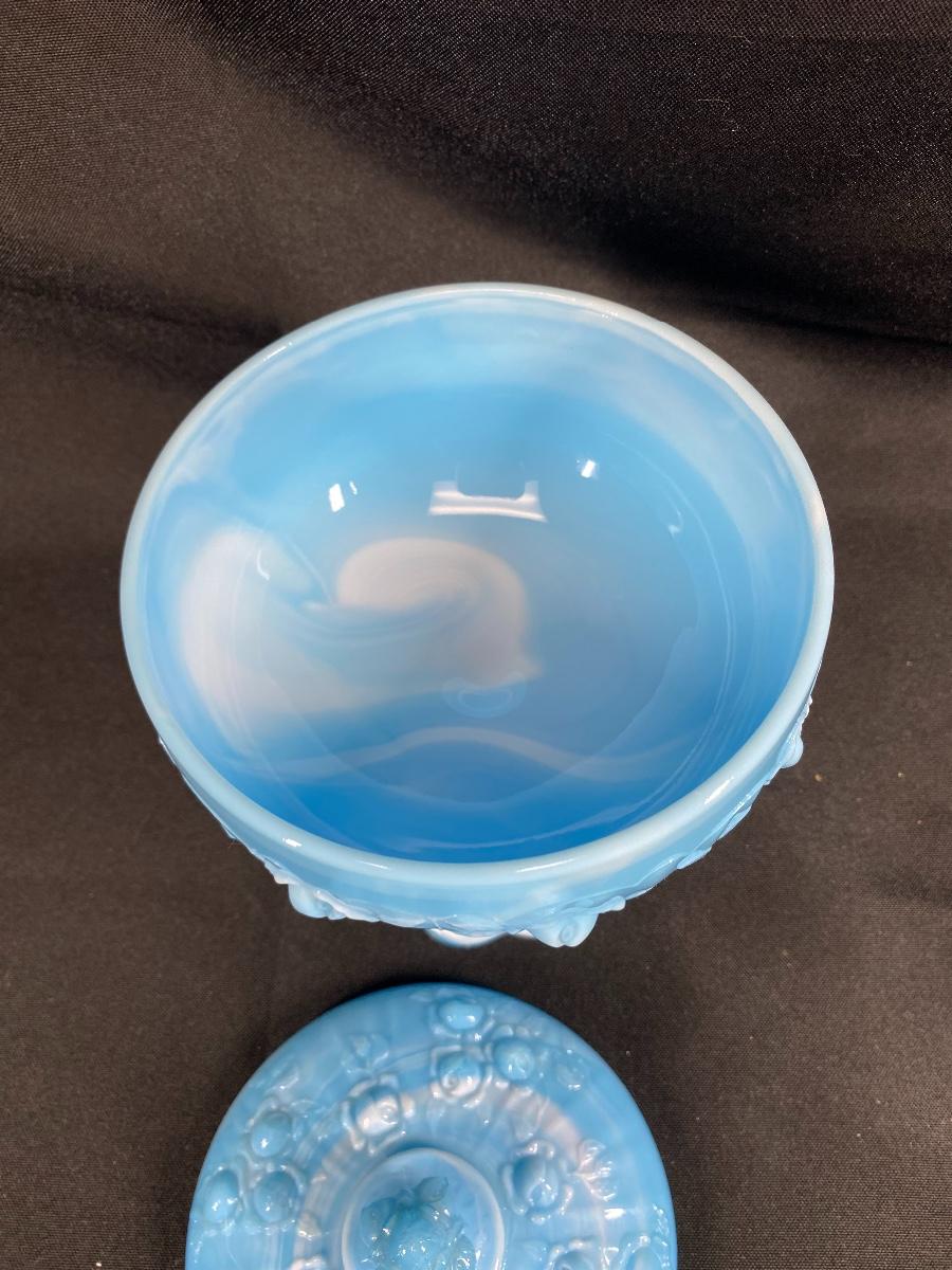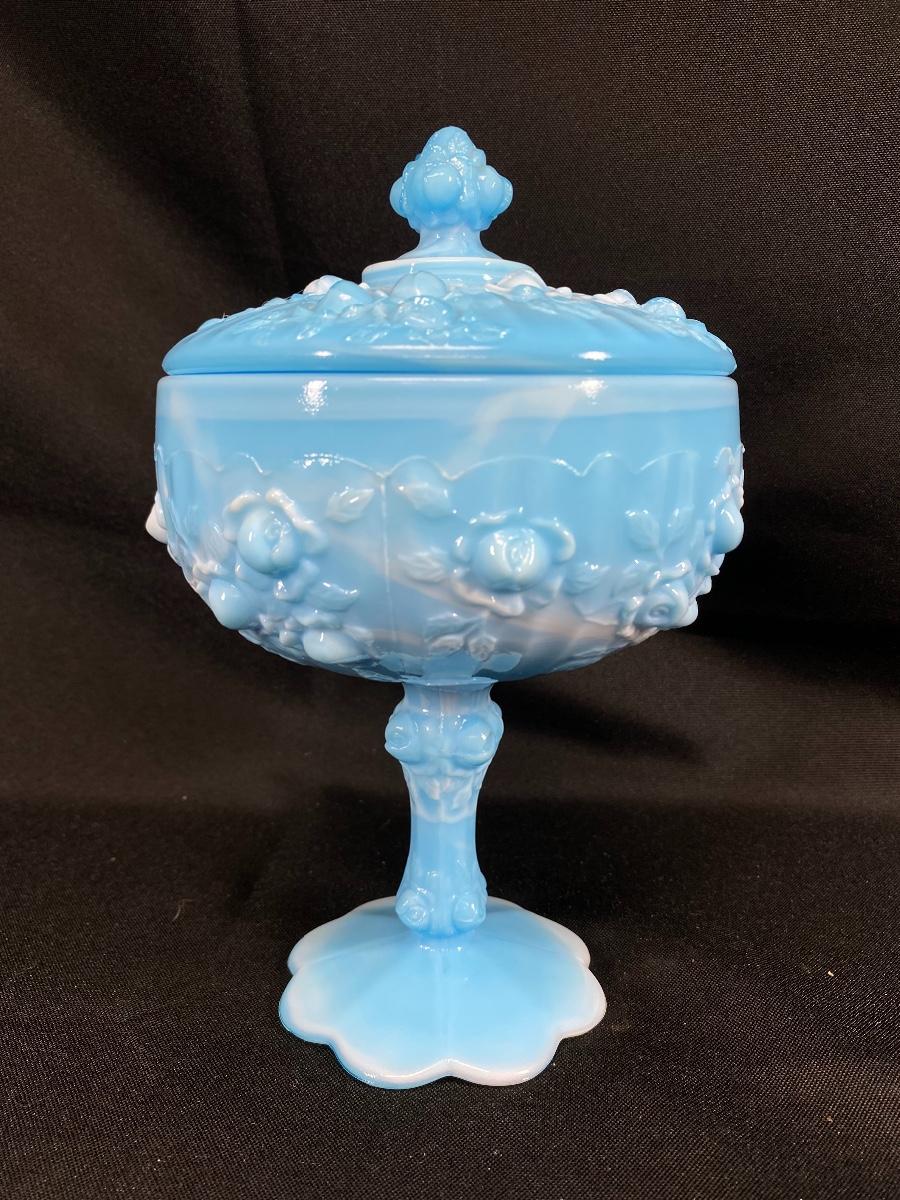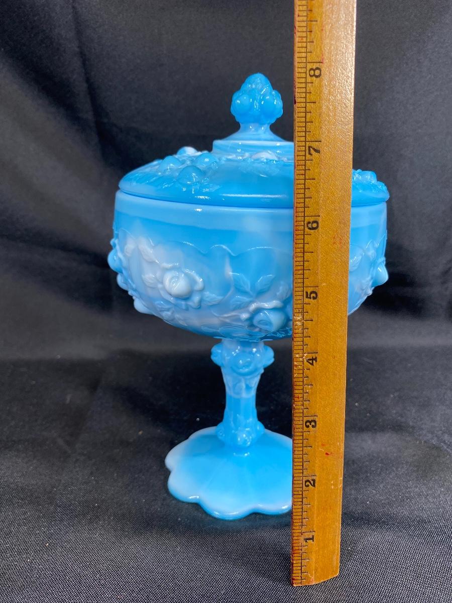 Turquoise blue and white slag glass candy dish. Pedestal style with embossed floral pattern. In good condition. About 8" tall.