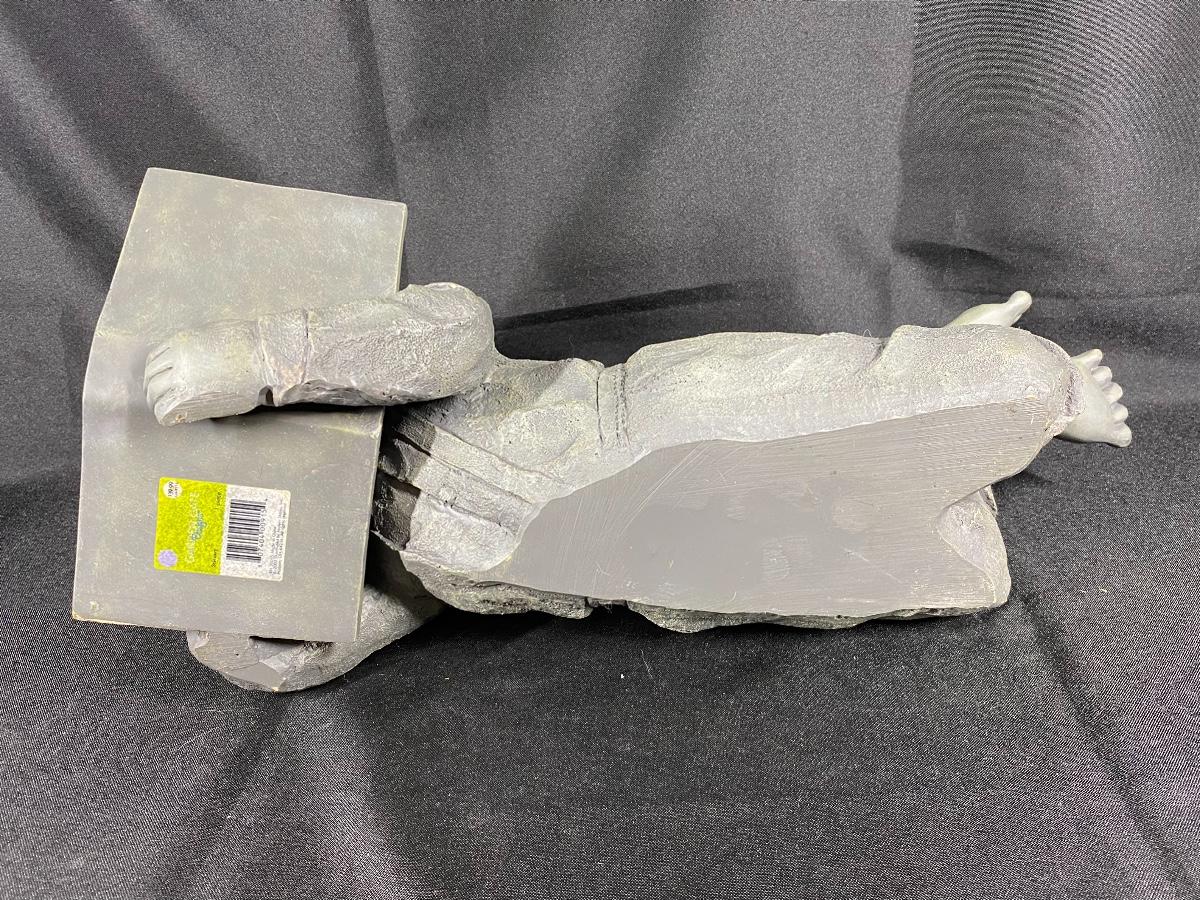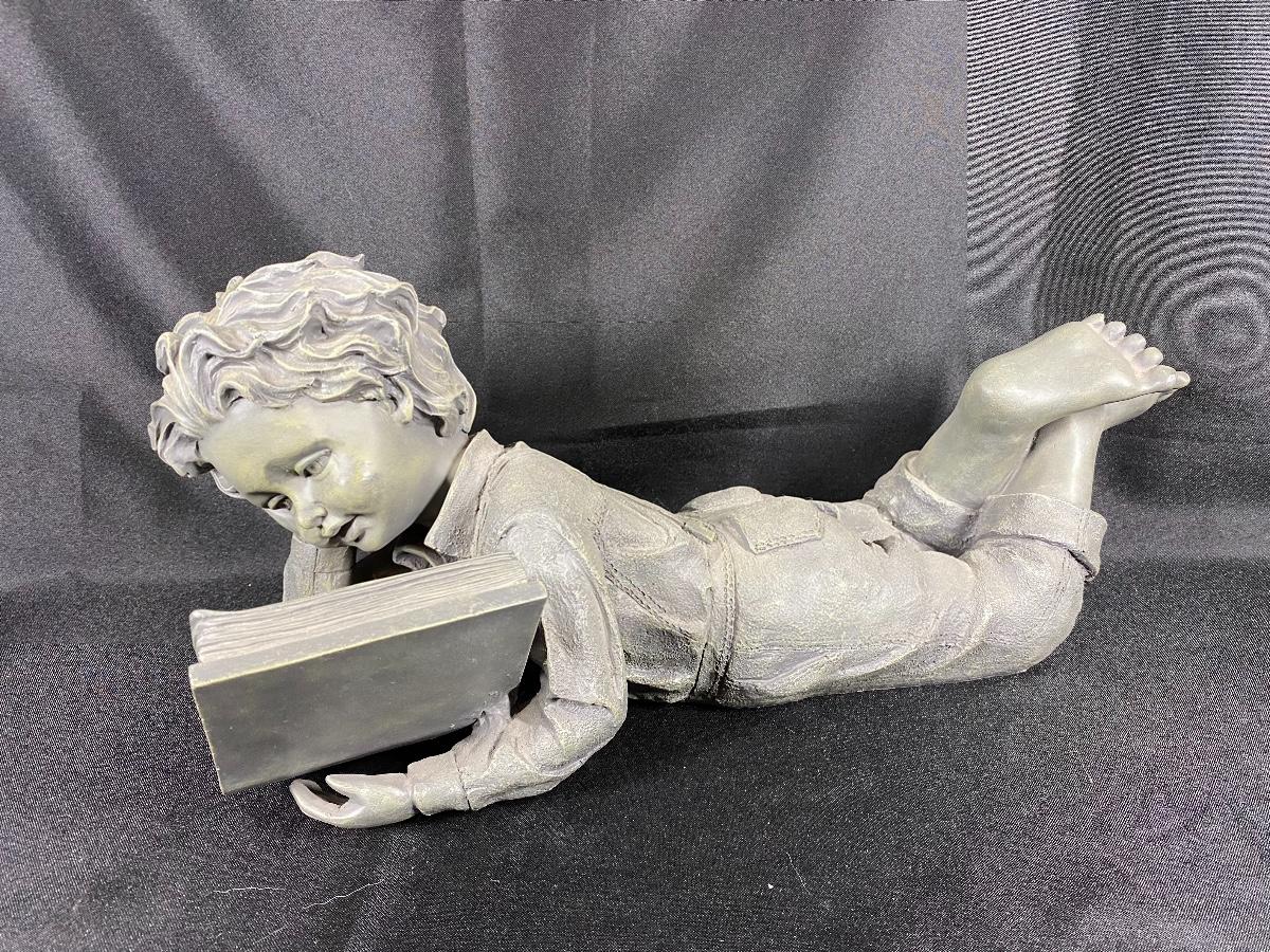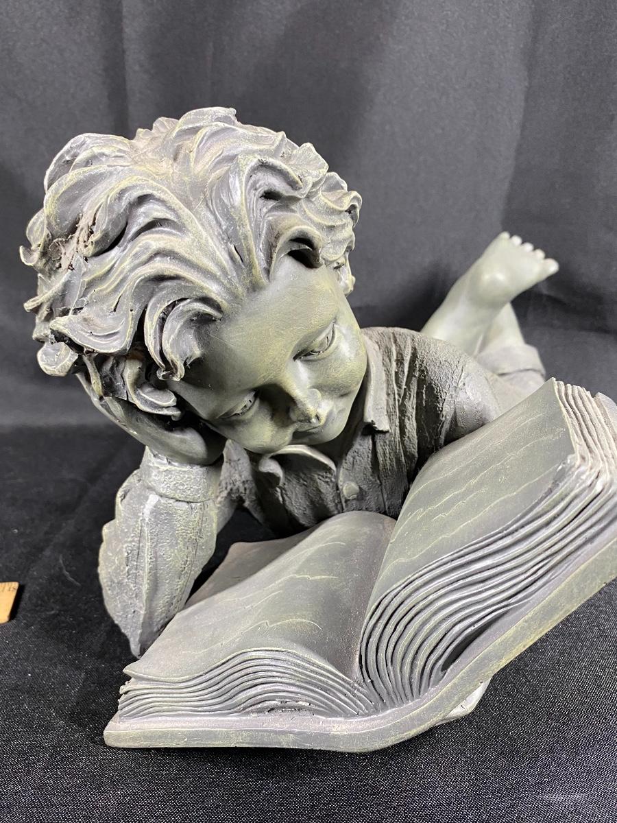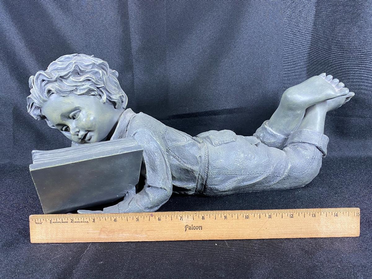 Boy laying down reading garden yard art statue. Heavy but feels like resin not stone or cement. Good condition. 15" size.