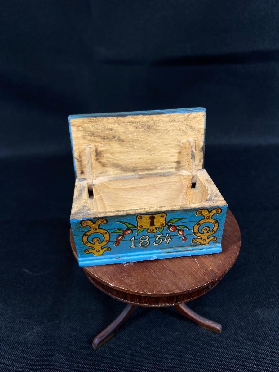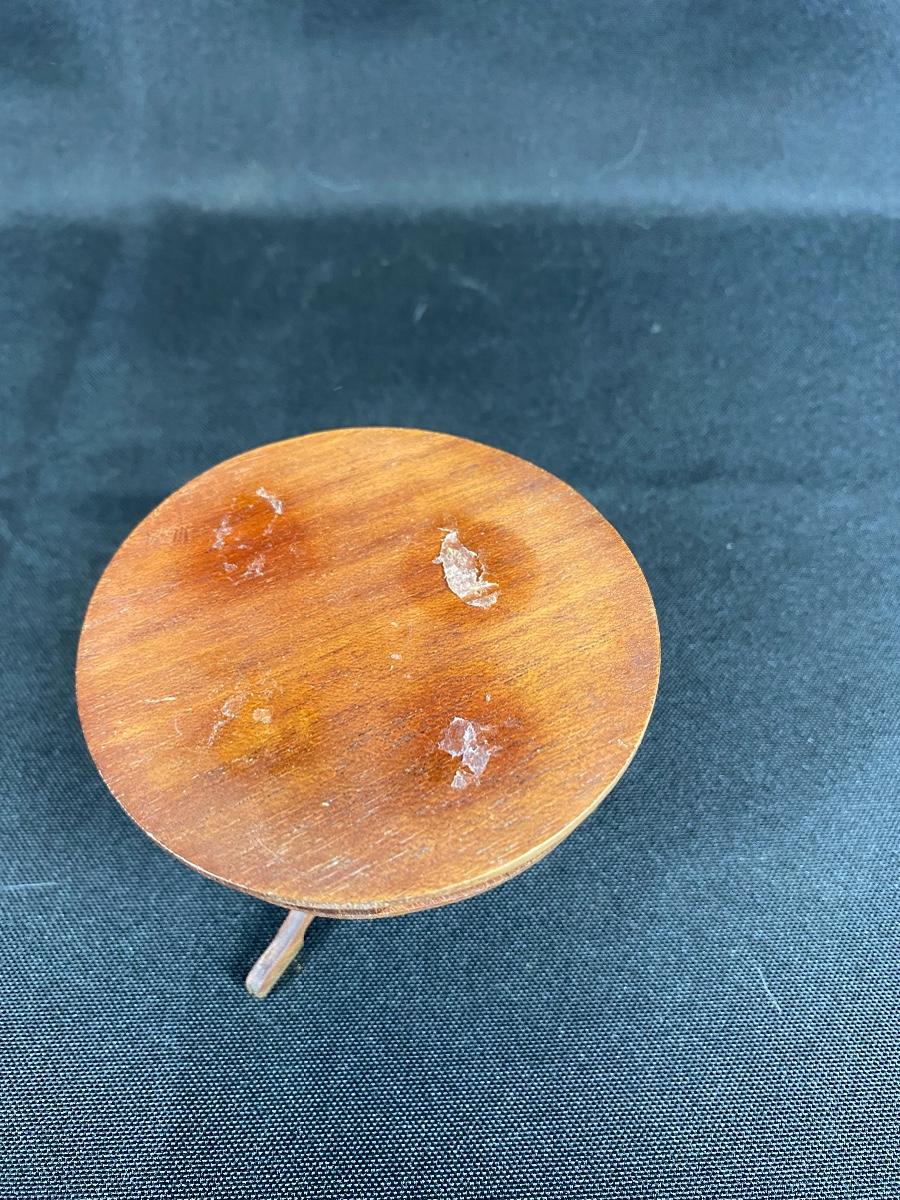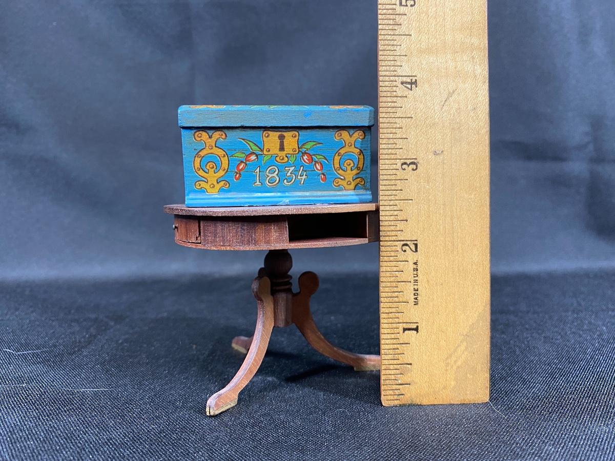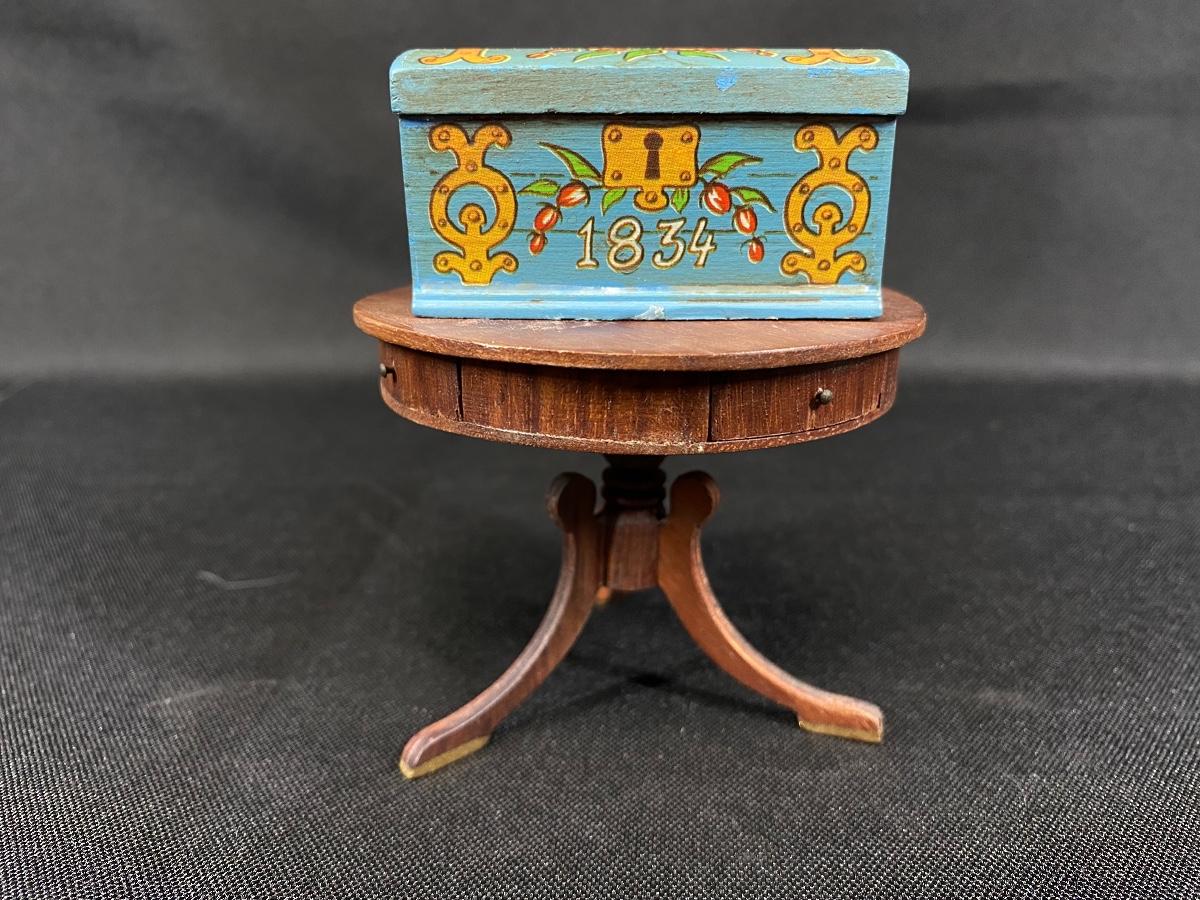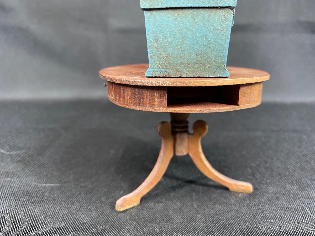 NOTE: this item was damaged after it received 1st bid. It jumped off a shelf and one of the legs broke at the halfway point. PLEASE BE AWARE OF DAMAGE before bidding again. Dollhouse miniature round side table and toy box chest. Table has faux drawers around the edge but one is missing. Toy box is painted, with a hinged lid. There is some putty on table from previous owner sticking items to it, can probably be scrapped and repainted.