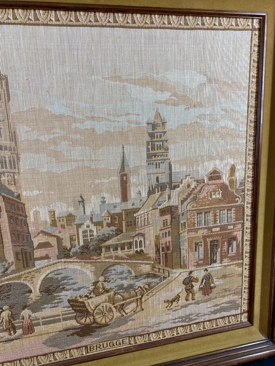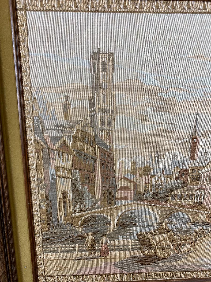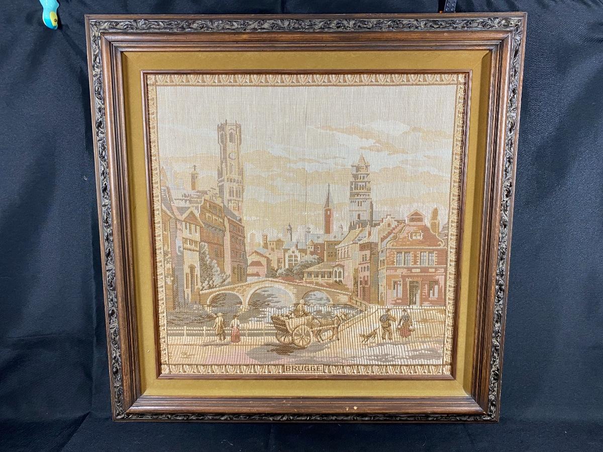 Vintage framed tapestry art. Cityscape image titled Brugge at the bottom. Frame is about 26" square. Tapestry is light, pale in color, not sure if that is intentional or if it is a result of sun fade. No holes, some wear on frame.