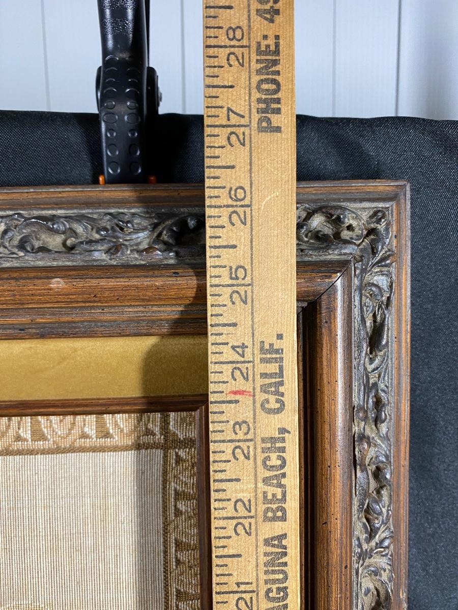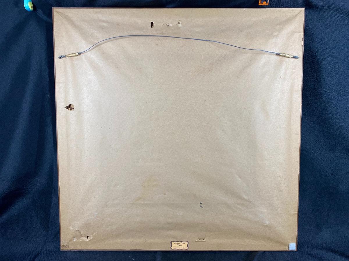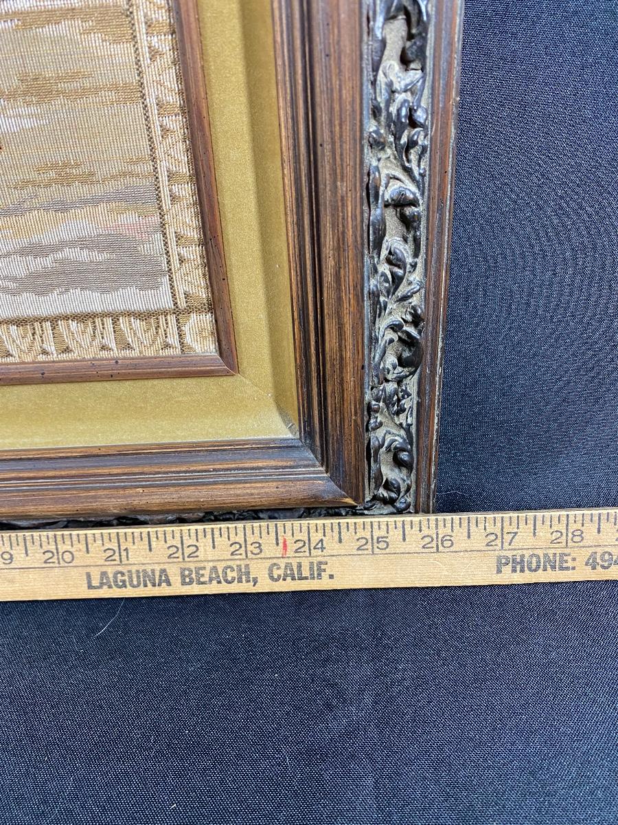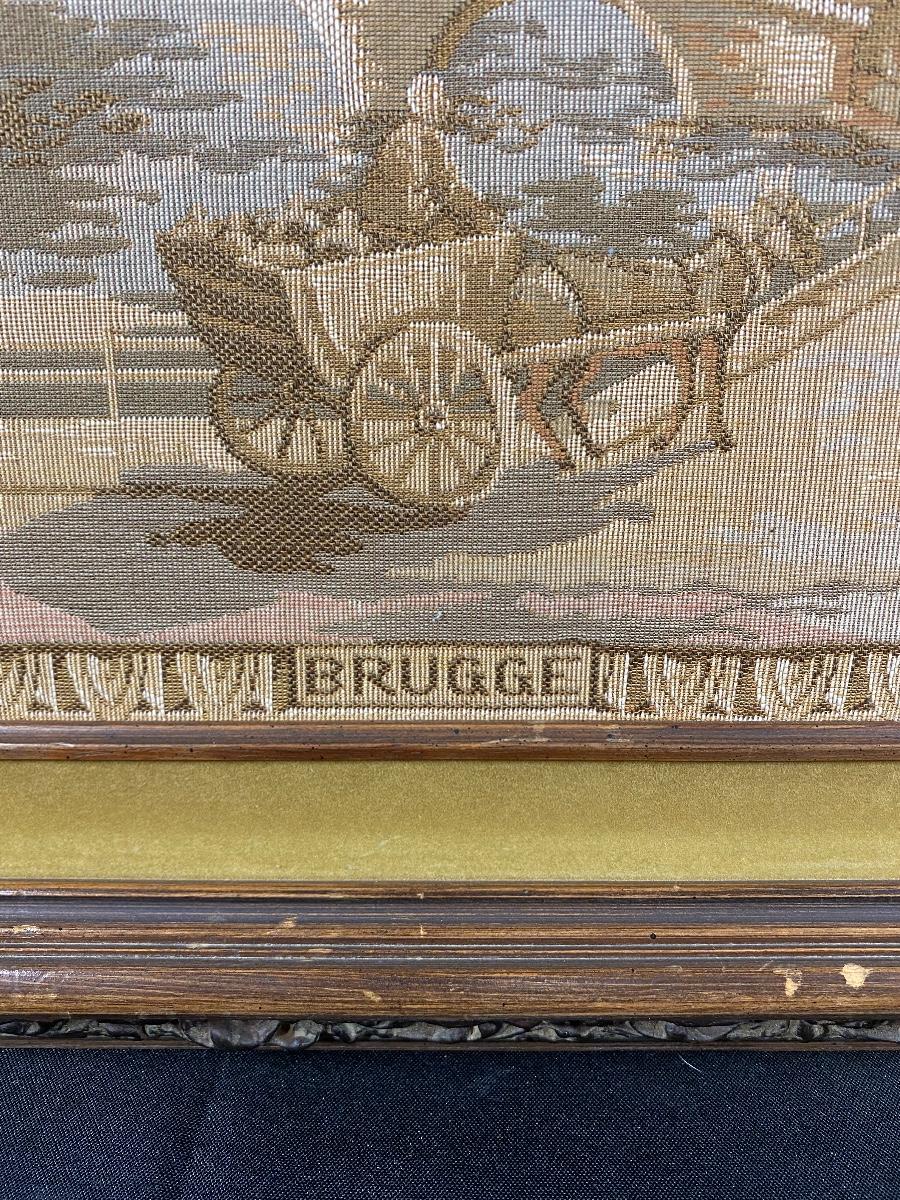 Vintage framed tapestry art. Cityscape image titled Brugge at the bottom. Frame is about 26" square. Tapestry is light, pale in color, not sure if that is intentional or if it is a result of sun fade. No holes, some wear on frame.