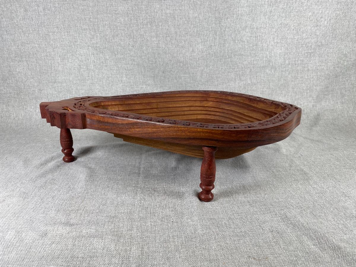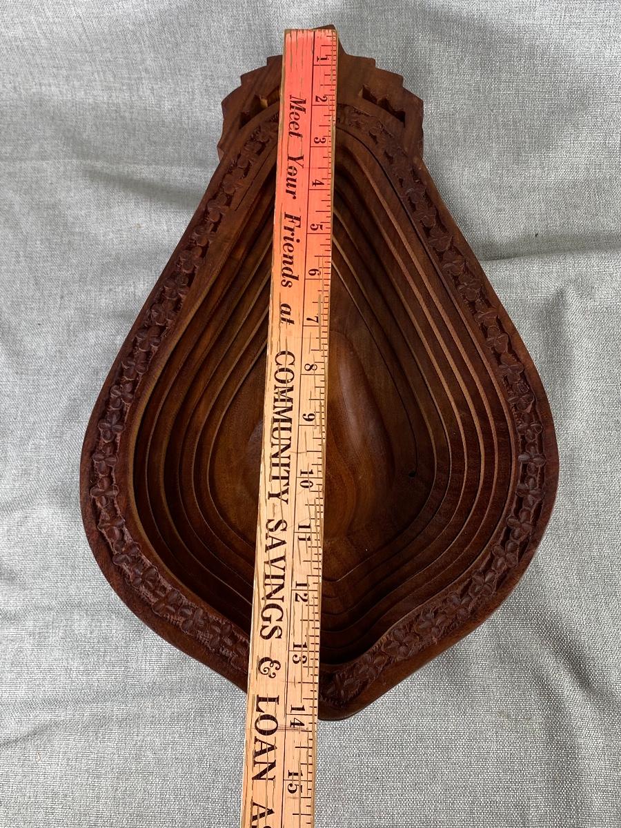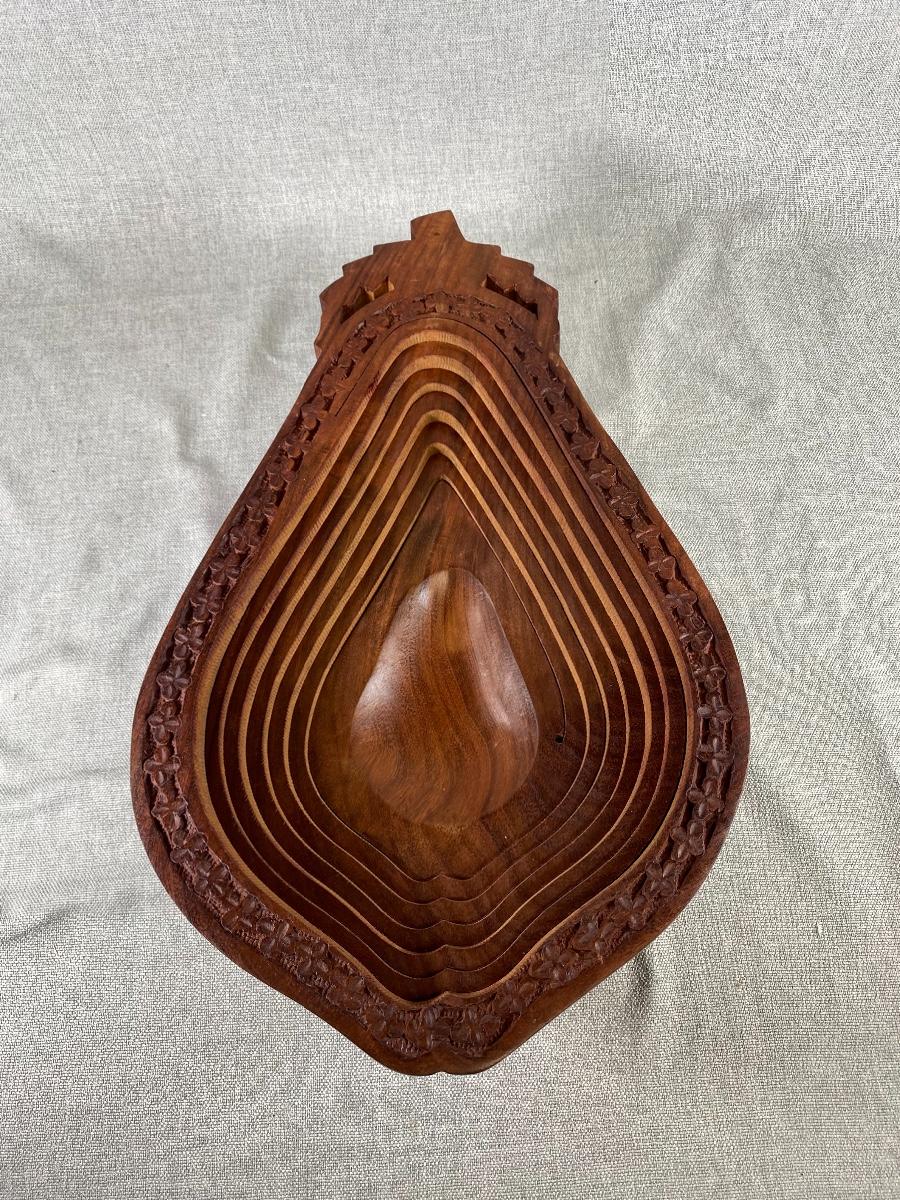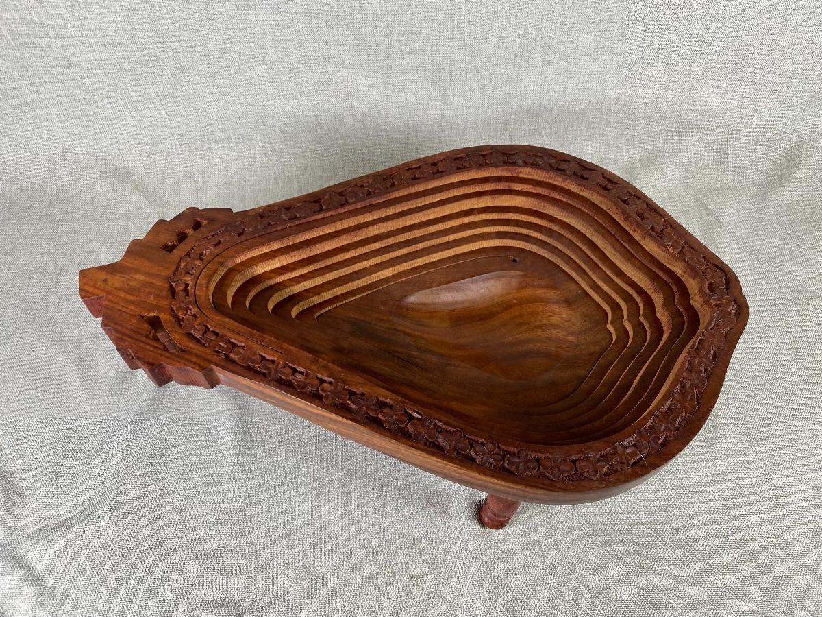 Pear shape collapsible wood bowl. Has three short legs that screw into place. Good condition, about 14" length.