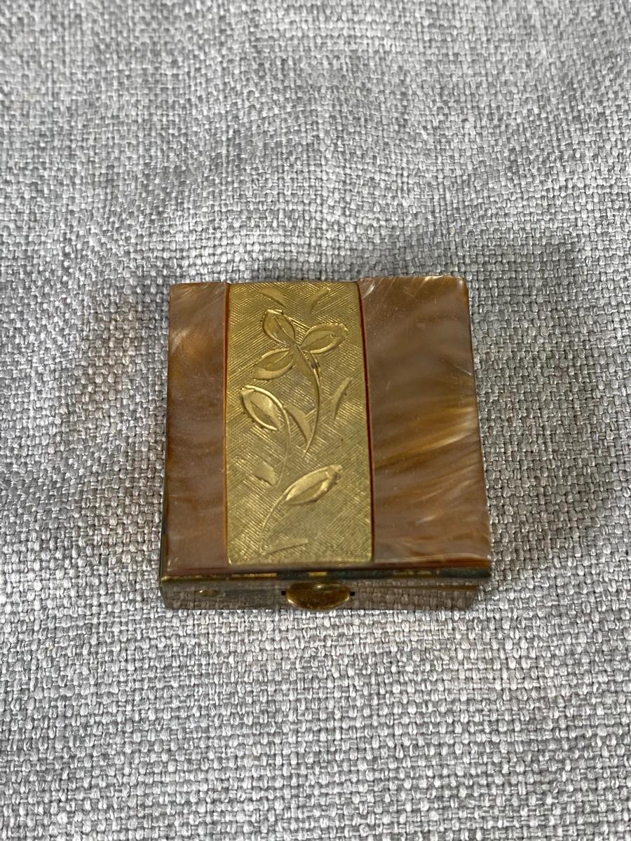 Vintage gold tone metal with amber shell pill box. Slightly tweaked lid. Flower etched design in top. About 1" size.