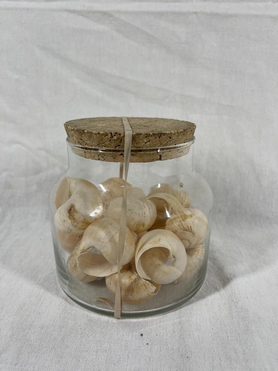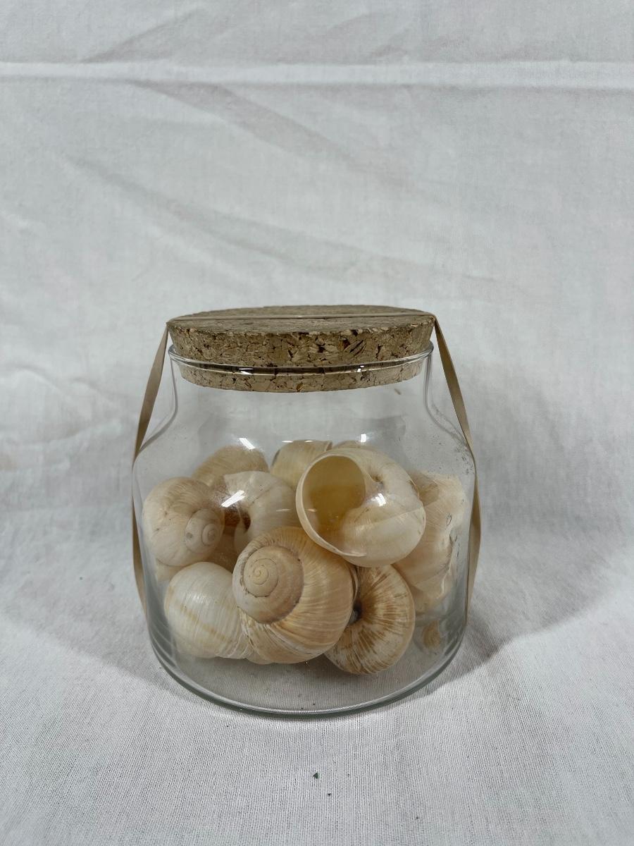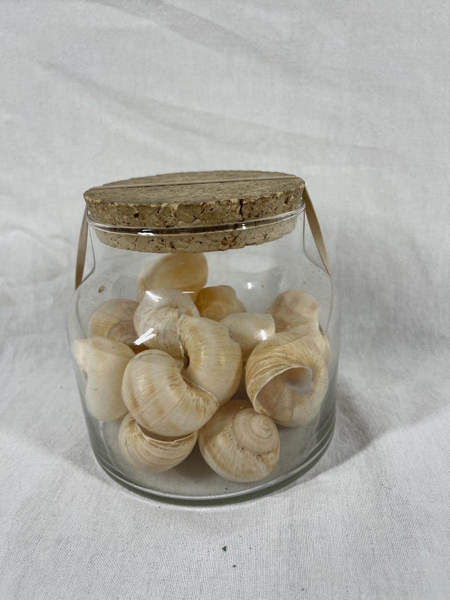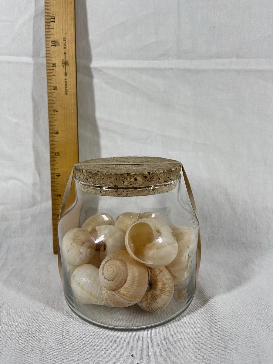 Small 5" jar of bleached snail shells. Repurpose for crafts or display.