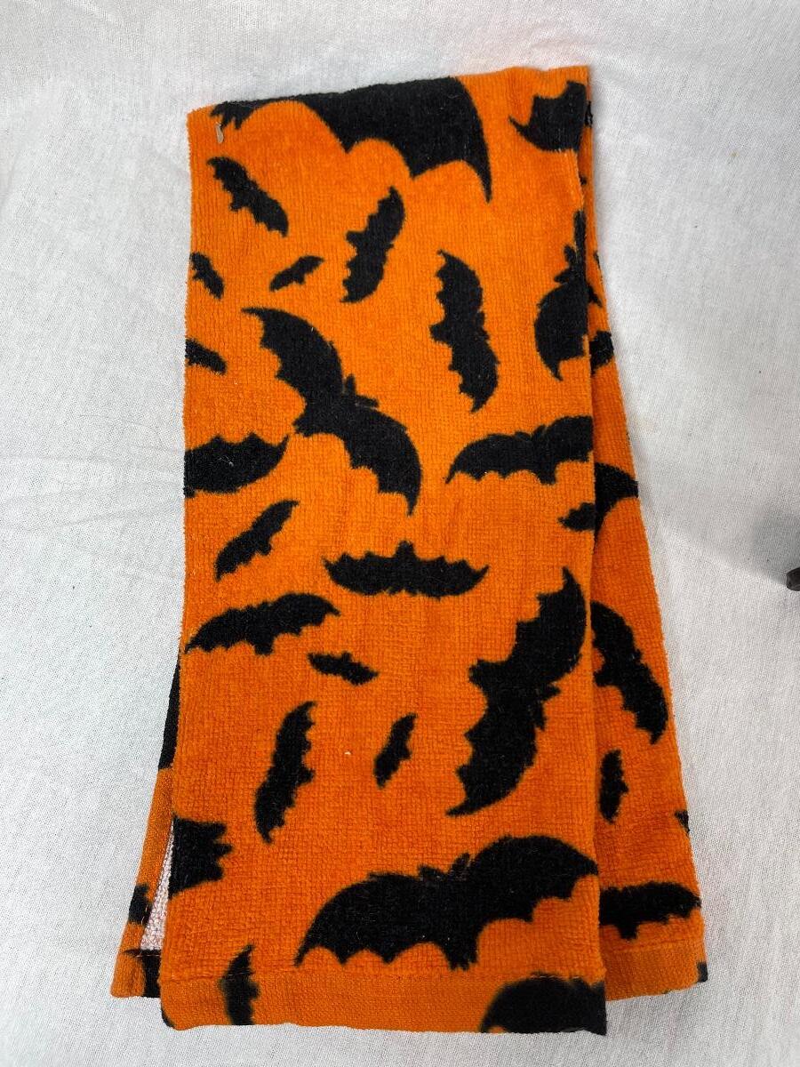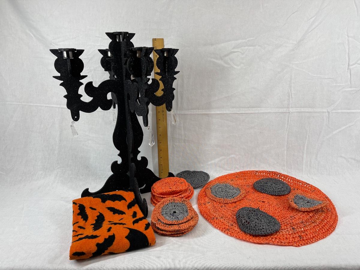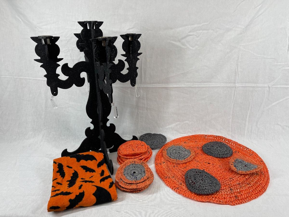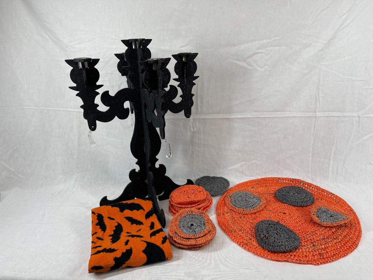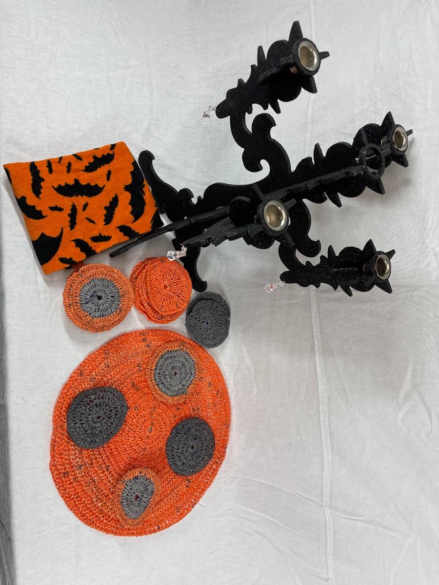 Halloween orange and black table decor lot. Hand made coasters, a black candelabra and a bat hand towel.