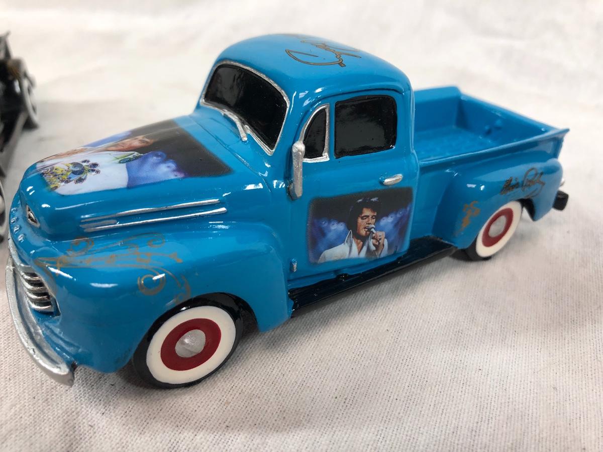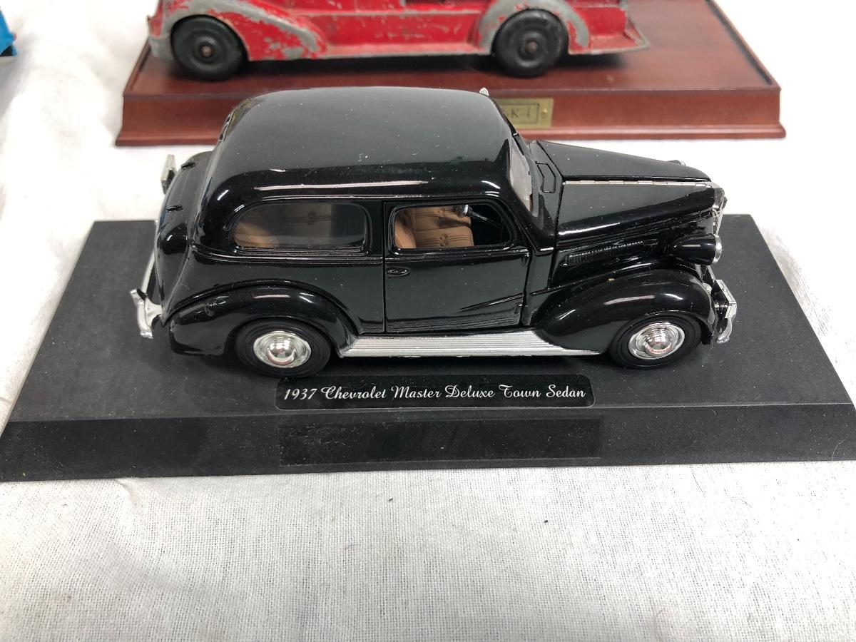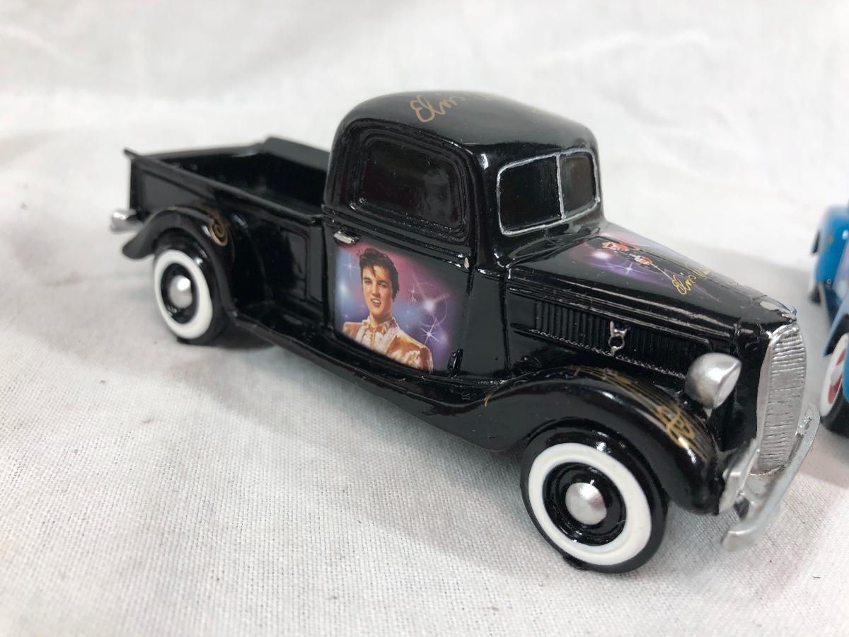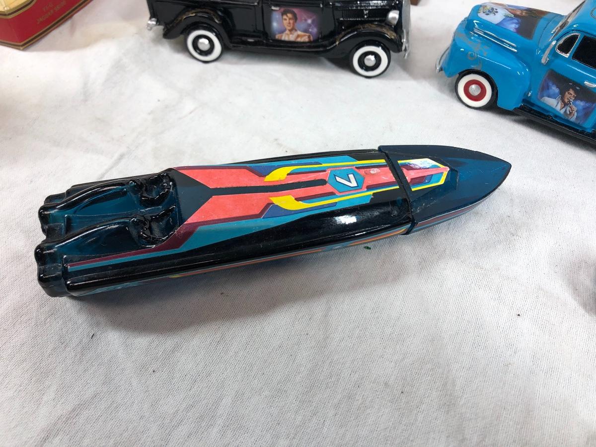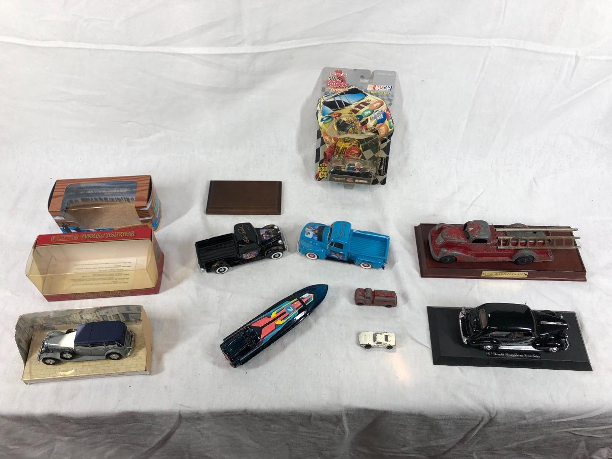 Mixed lot of toy cars and trucks. Includes Kiddie-Toy Fire Truck with 2 ladders, 2 Ford trucks with Elvis decor, 1937 Chevy Town Sedan on display base, Matchbox 1931 Mercedes Benz Type 770, NASCAR M&M#36, Widgetoy race car, small fire truck, Avon Wild Country after-shave in. Speedboat bottle, and 2 empty packaging boxes. Clip in photo was used for scale and is not included.