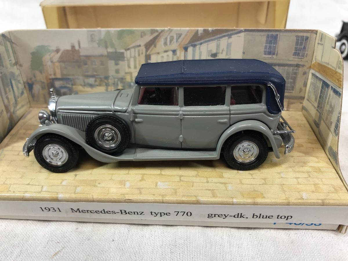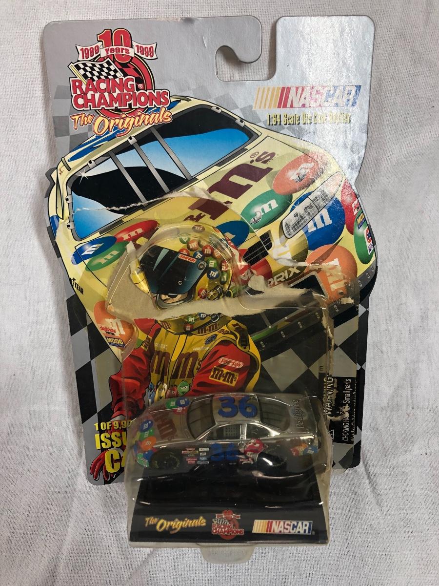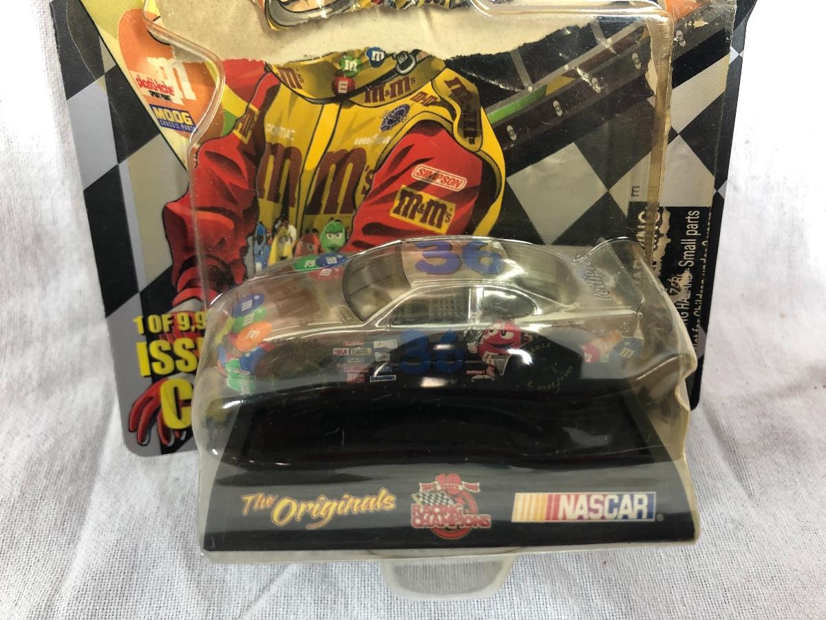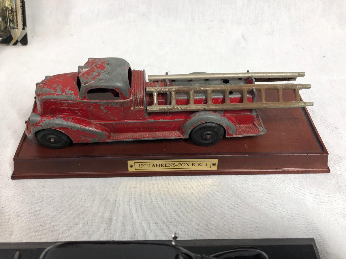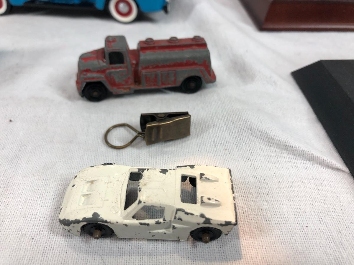Mixed lot of toy cars and trucks. Includes Kiddie-Toy Fire Truck with 2 ladders, 2 Ford trucks with Elvis decor, 1937 Chevy Town Sedan on display base, Matchbox 1931 Mercedes Benz Type 770, NASCAR M&M#36, Widgetoy race car, small fire truck, Avon Wild Country after-shave in. Speedboat bottle, and 2 empty packaging boxes. Clip in photo was used for scale and is not included.