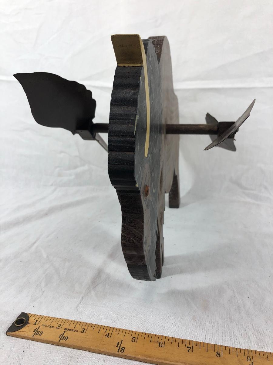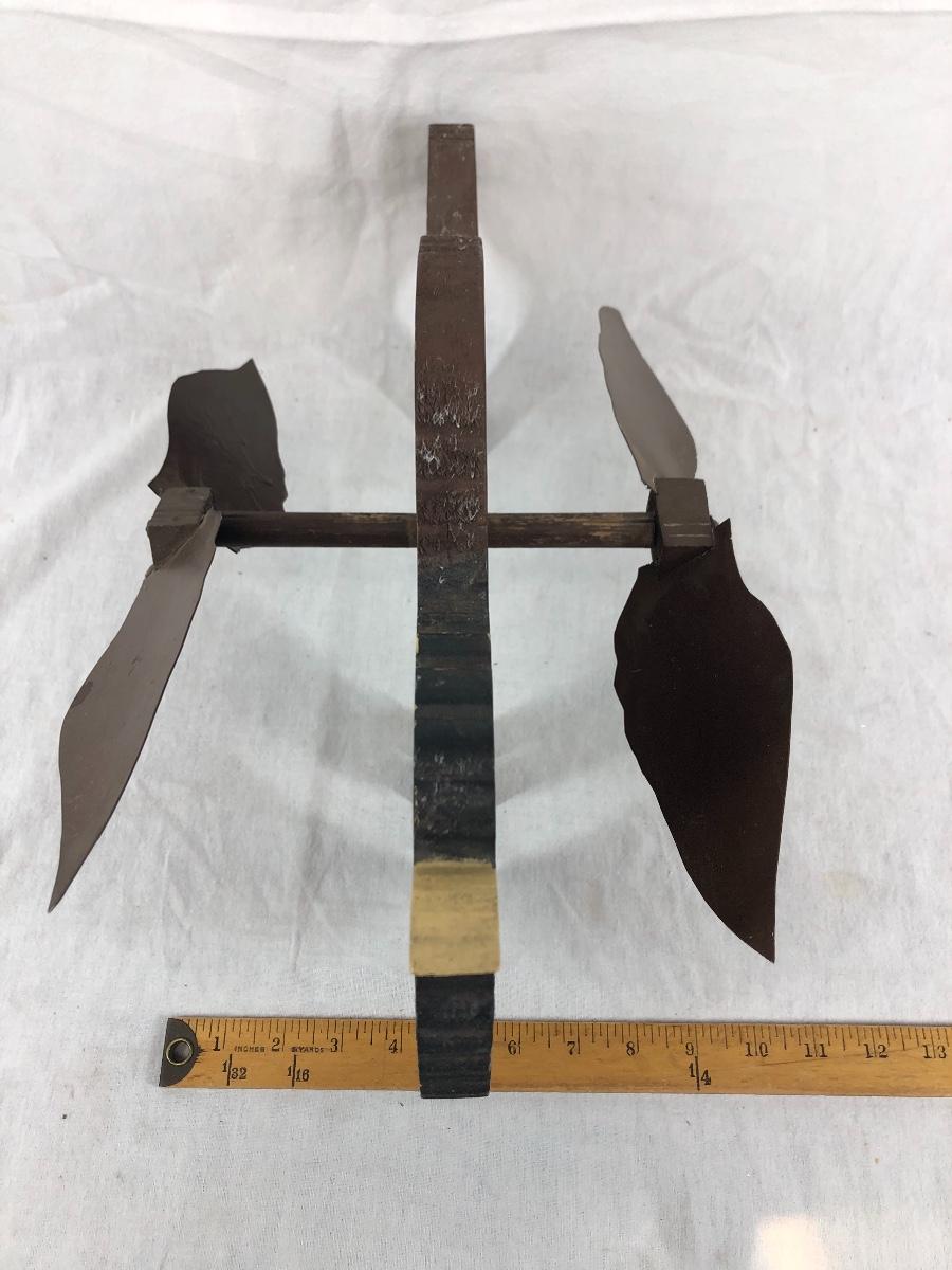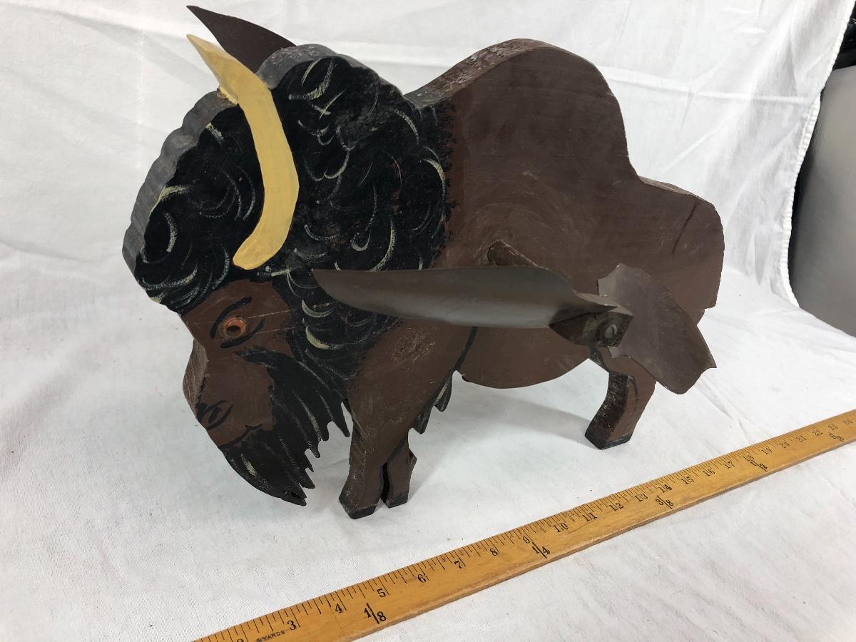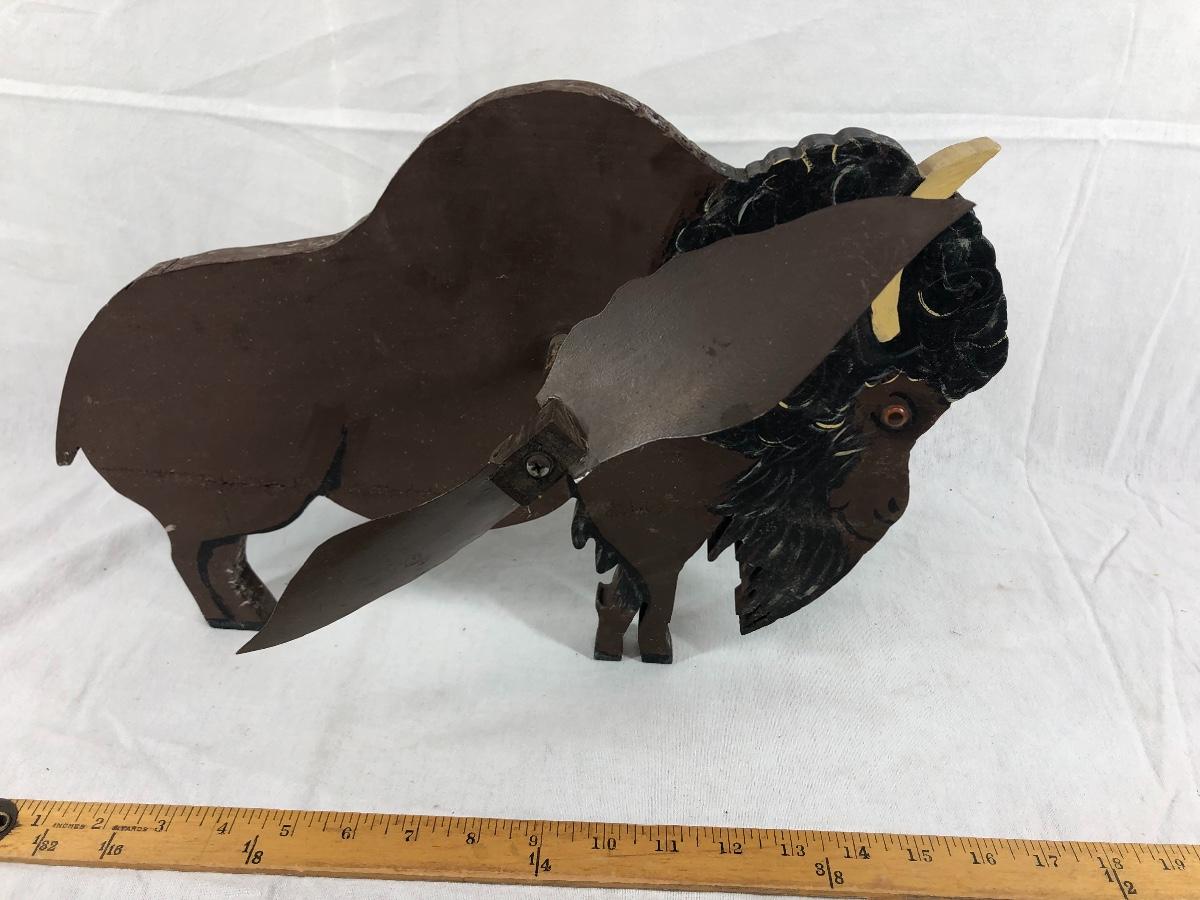 Large bison garden art. Buffalo whirlybird had propellers on each side. Great for the yard. Not on a pole. May be handmade by previous owners as they were crafty with wood art. At least 18" size.