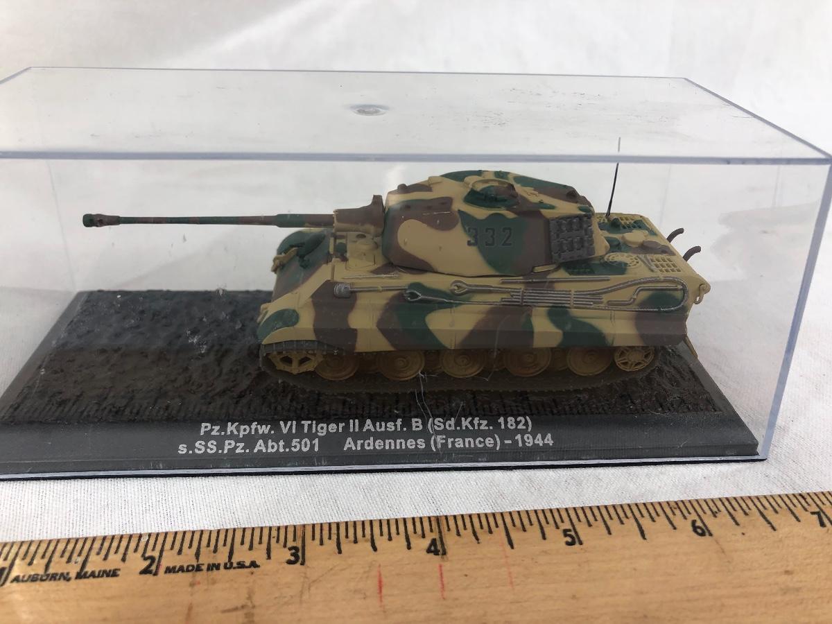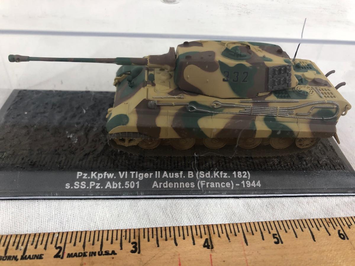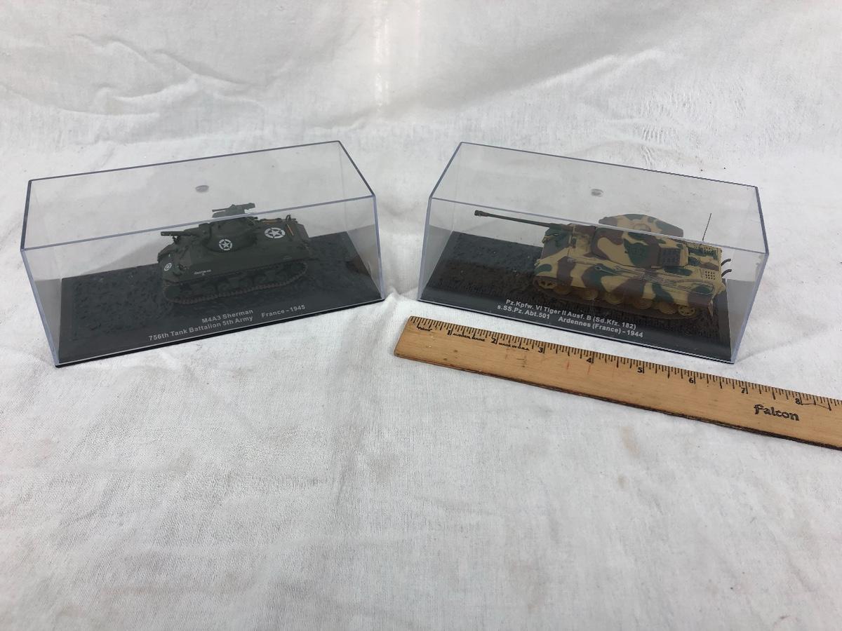 Pair of scale model military tanks in display boxes. Both are from WWII according to the displays. About 6" box size.
