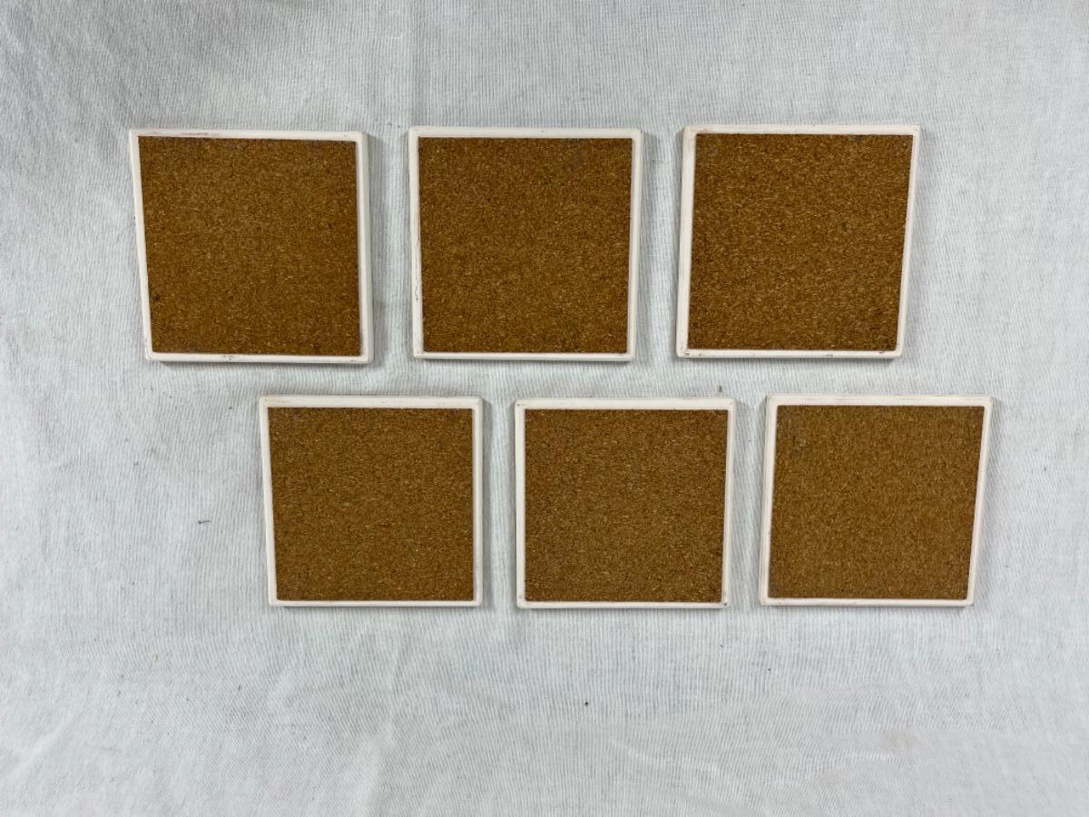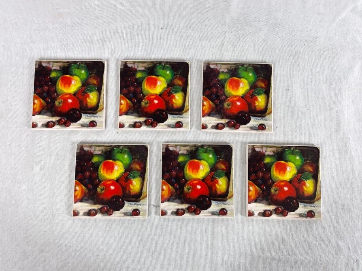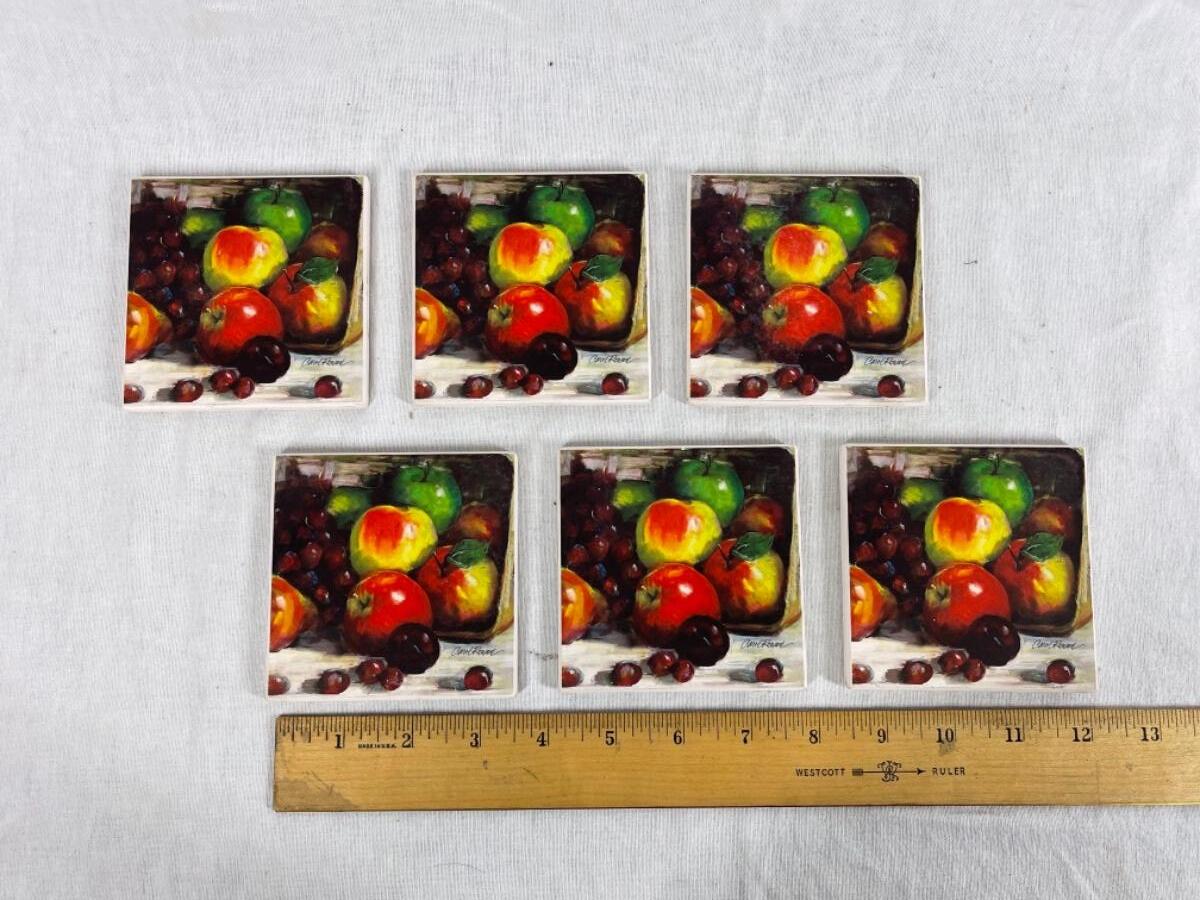 Set of 6 apple pattern coasters. Cork back. Good condition.