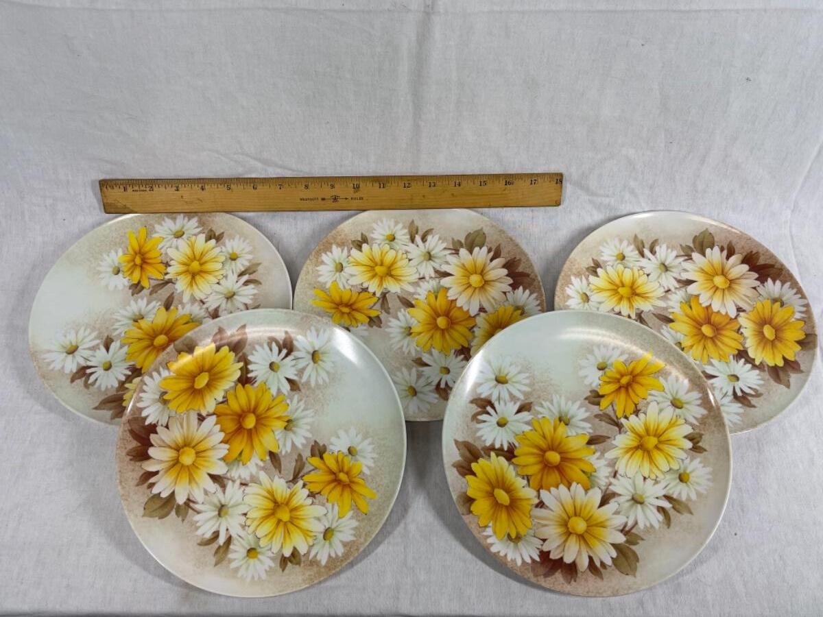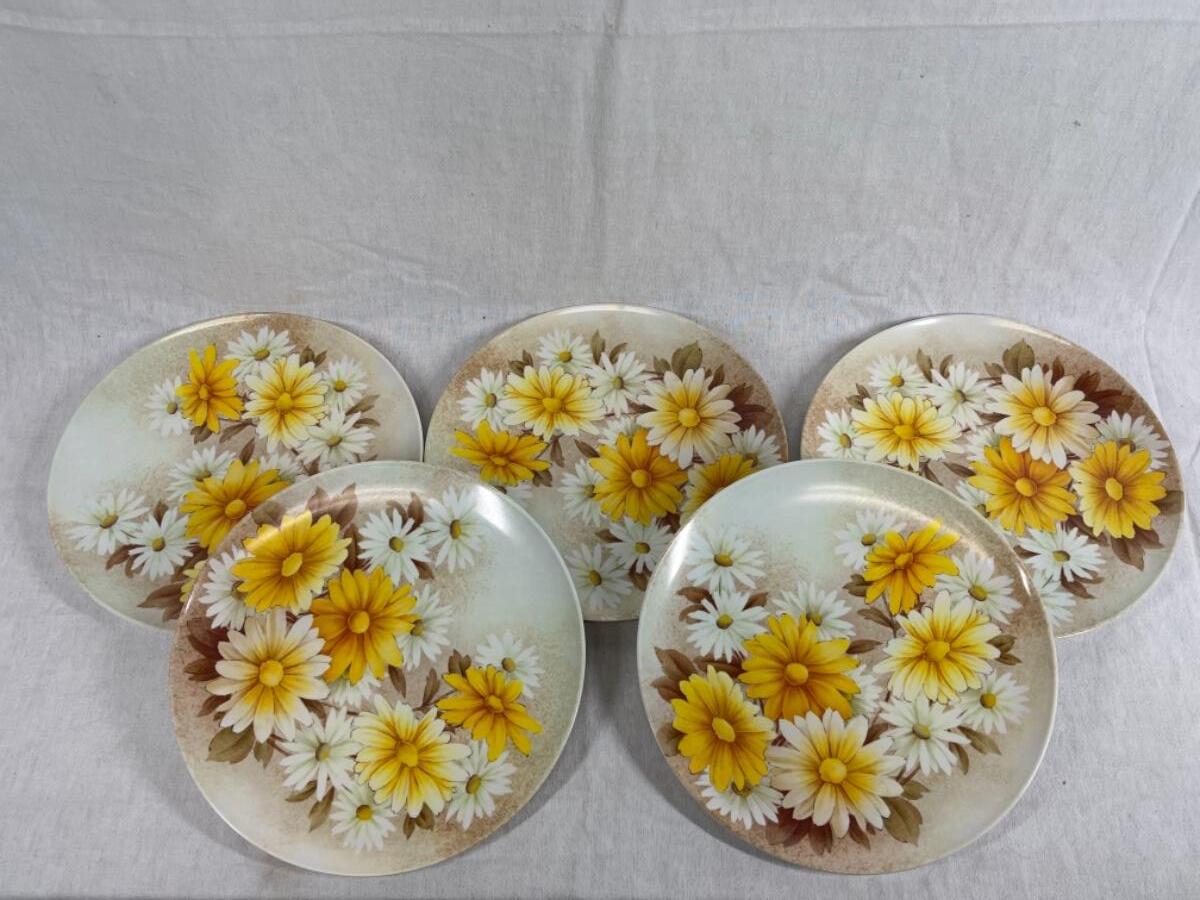 Vintage melamine plastic plates. Yellow and white daisy pattern. Set of 5.